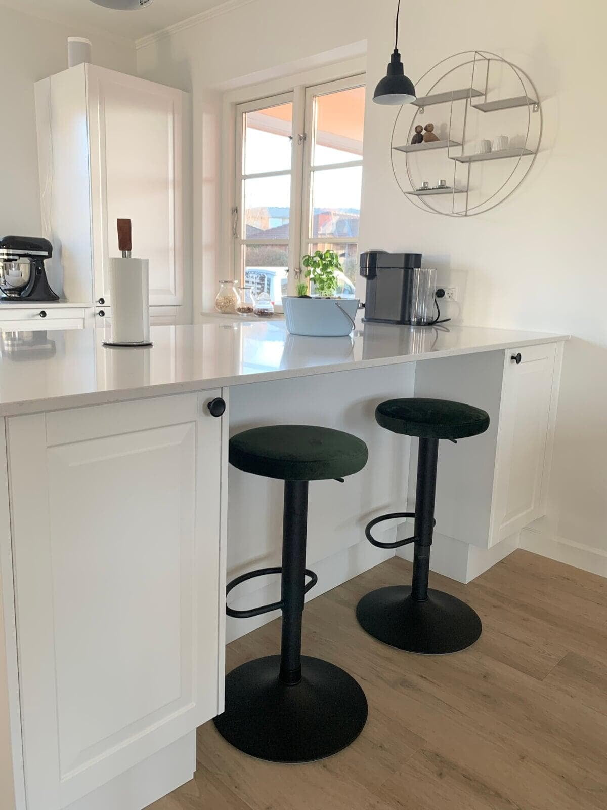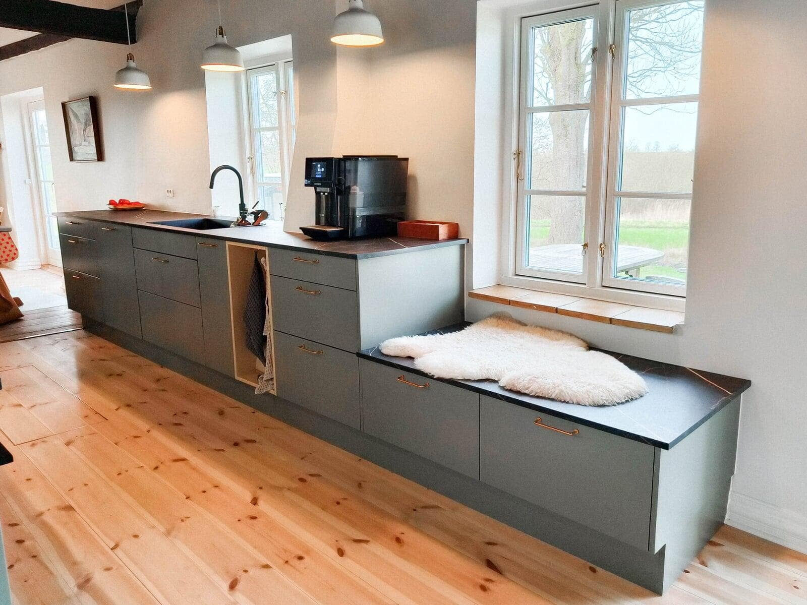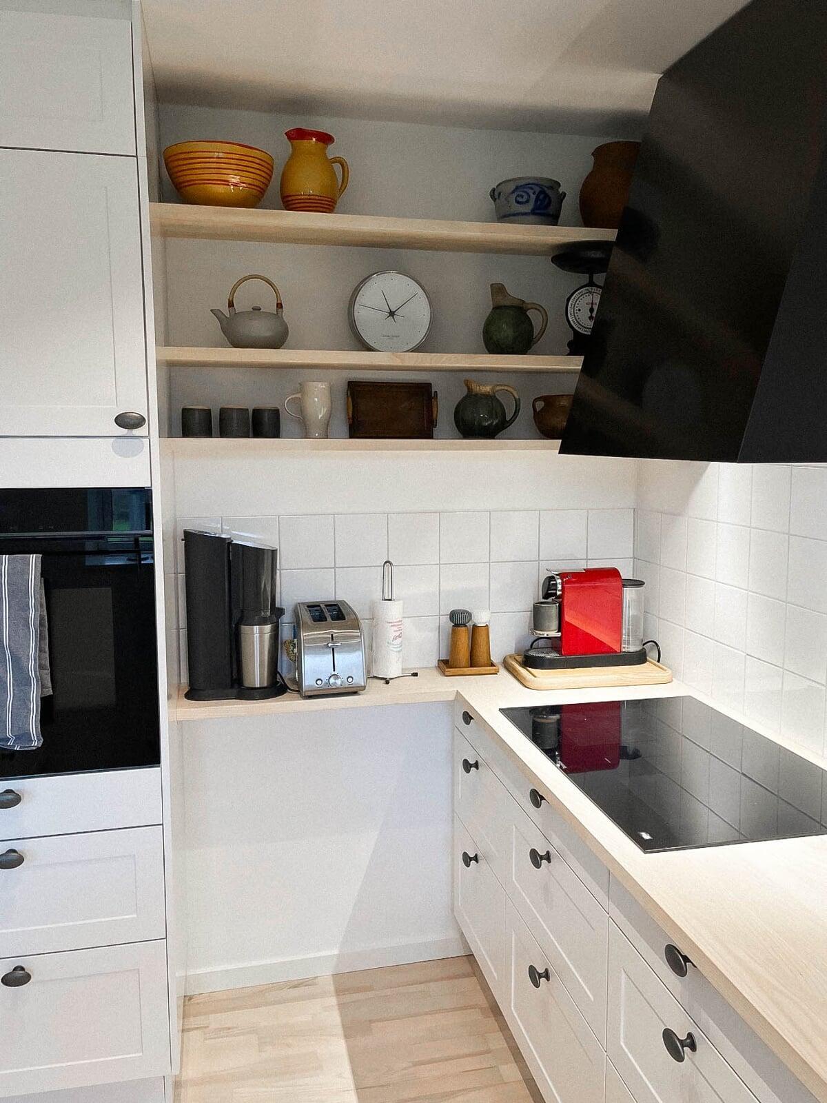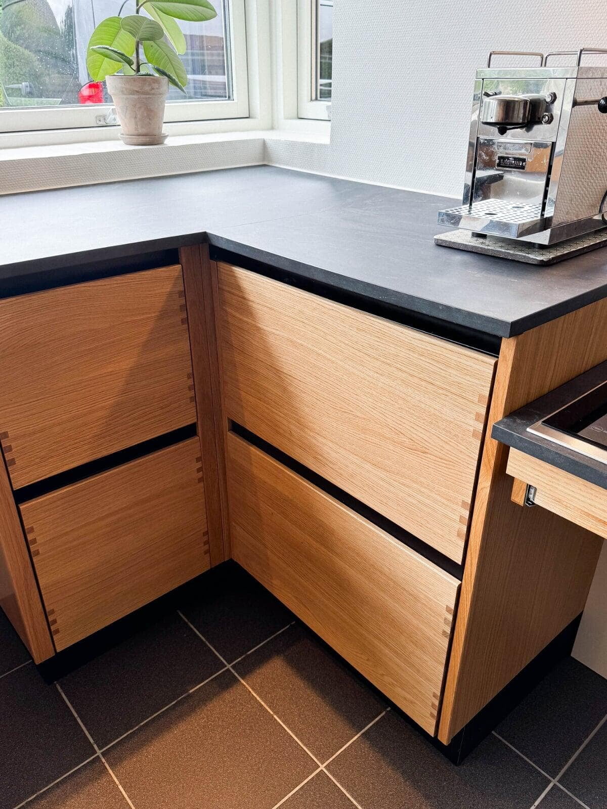 Der er tænkt i god udnyttelse af gulvpladsen ved køkkenvasken, så bordpladen kunne blive ekstra dyb, og der blev plads til et højskab. Vi er også rigtig glade for de smarte udtræksskabe med karoussel og praktiske hylder, og så har vi fået et kaffehjørne. Kris Møller, Fredensborg
