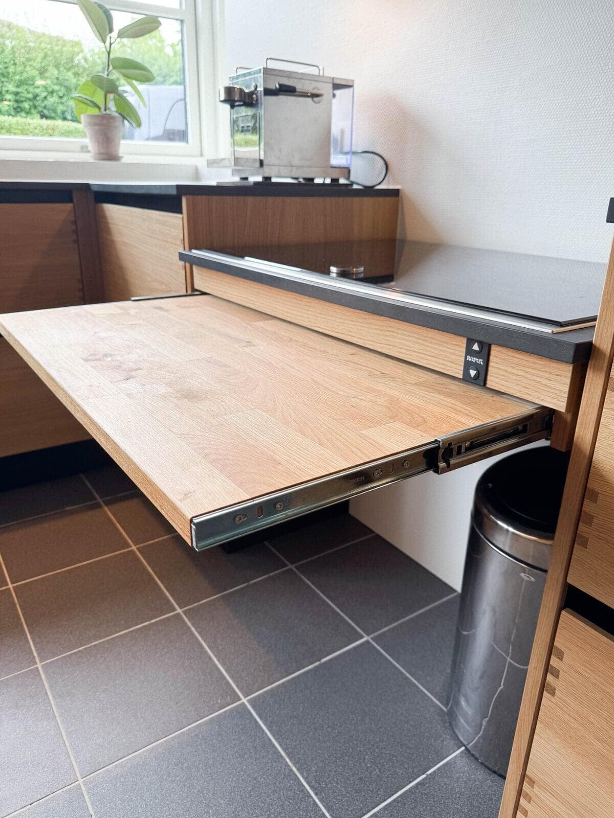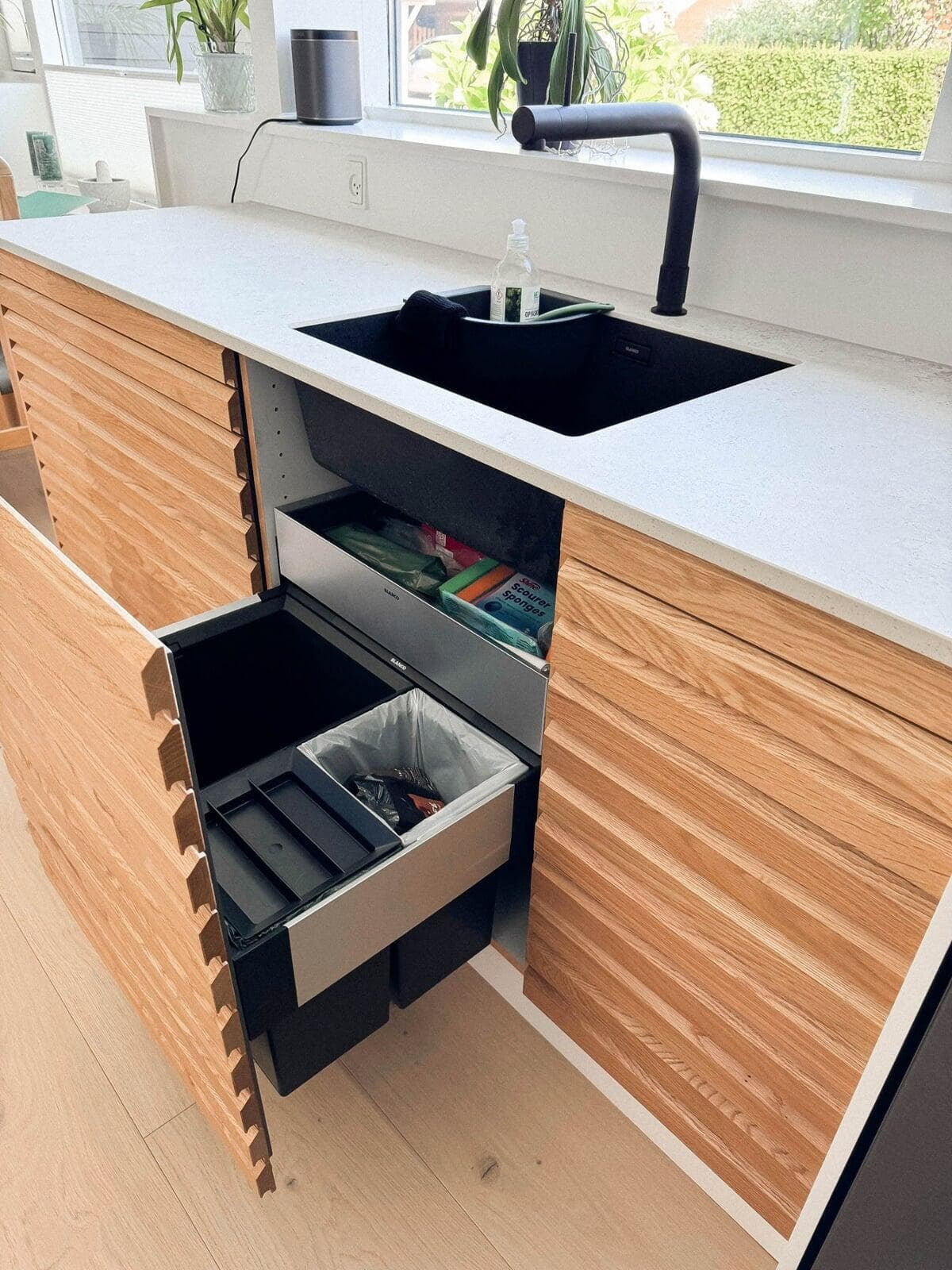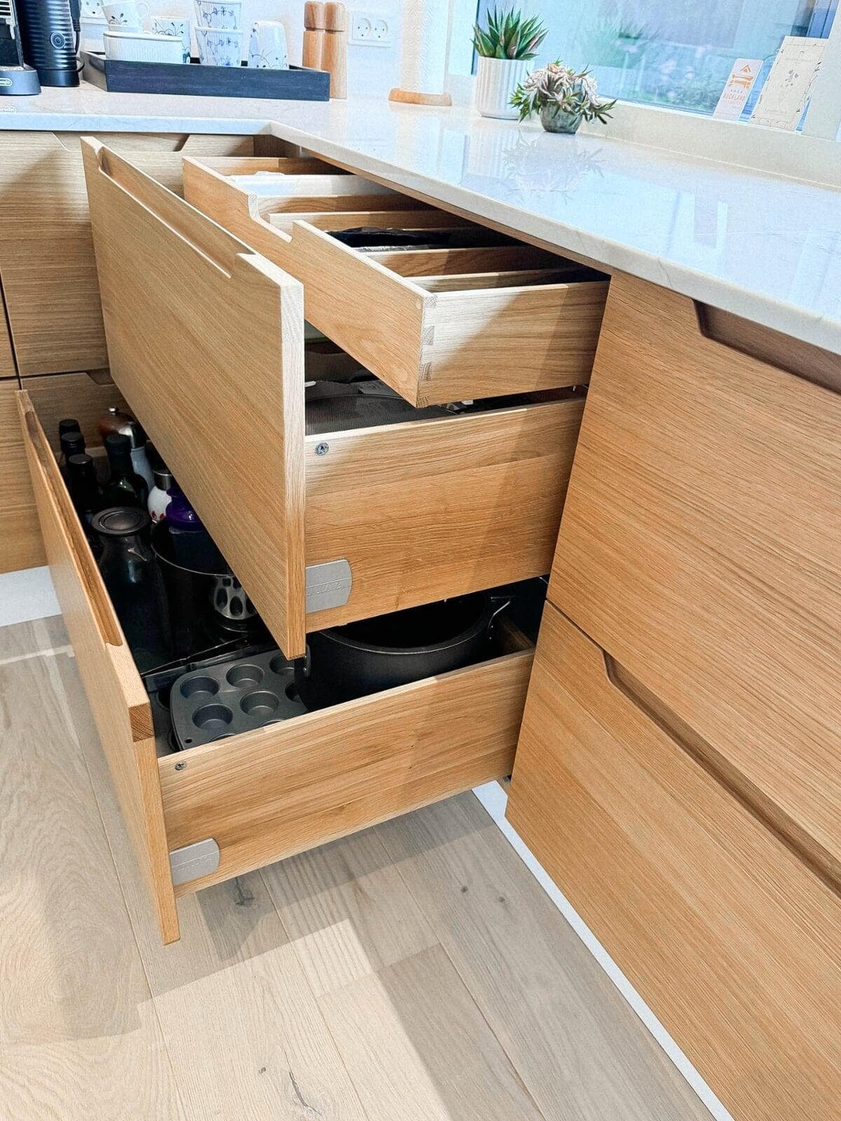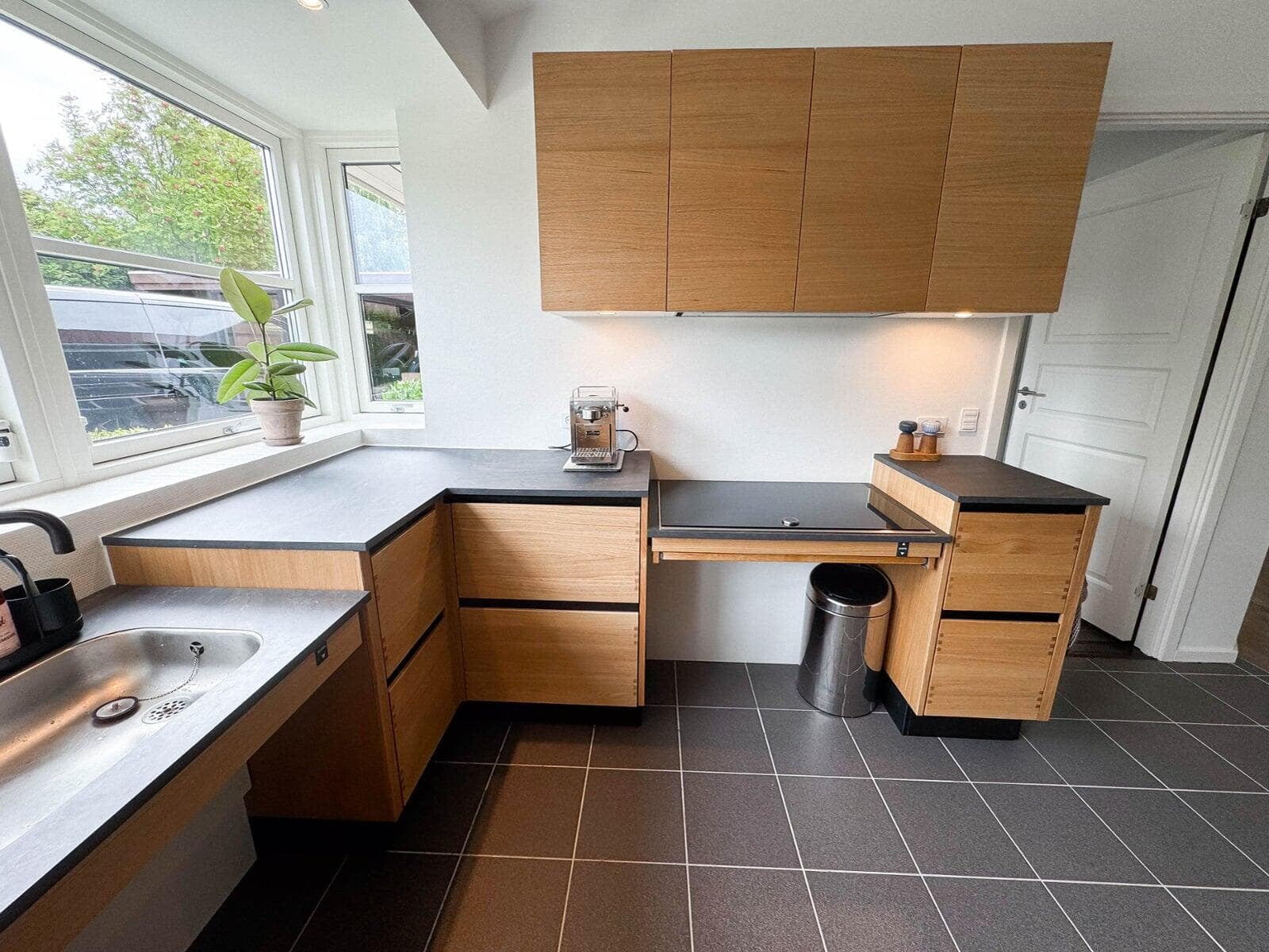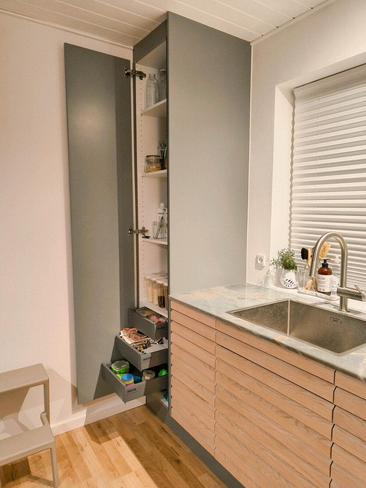 Der er tænkt i god udnyttelse af gulvpladsen ved køkkenvasken, så bordpladen kunne blive ekstra dyb, og der blev plads til et højskab. Vi er også rigtig glade for de smarte udtræksskabe med karoussel og praktiske hylder, og så har vi fået et kaffehjørne. Kris Møller, Fredensborg