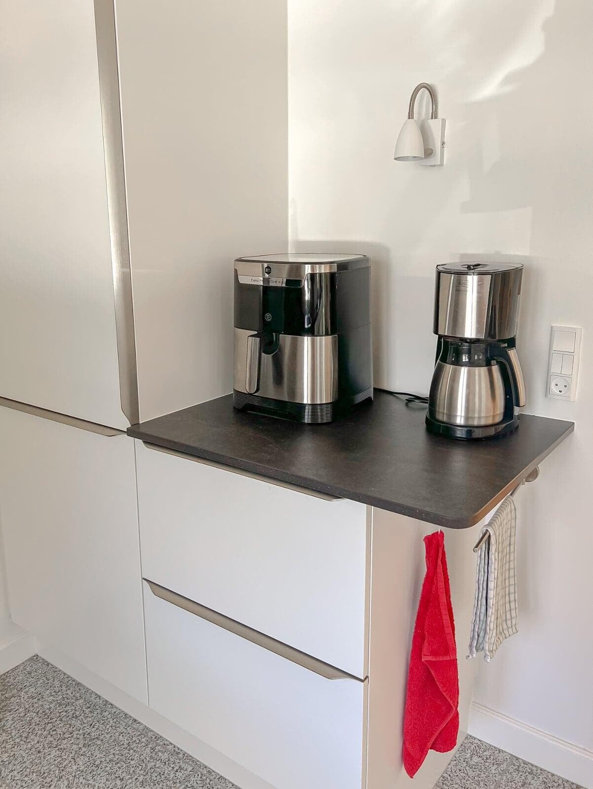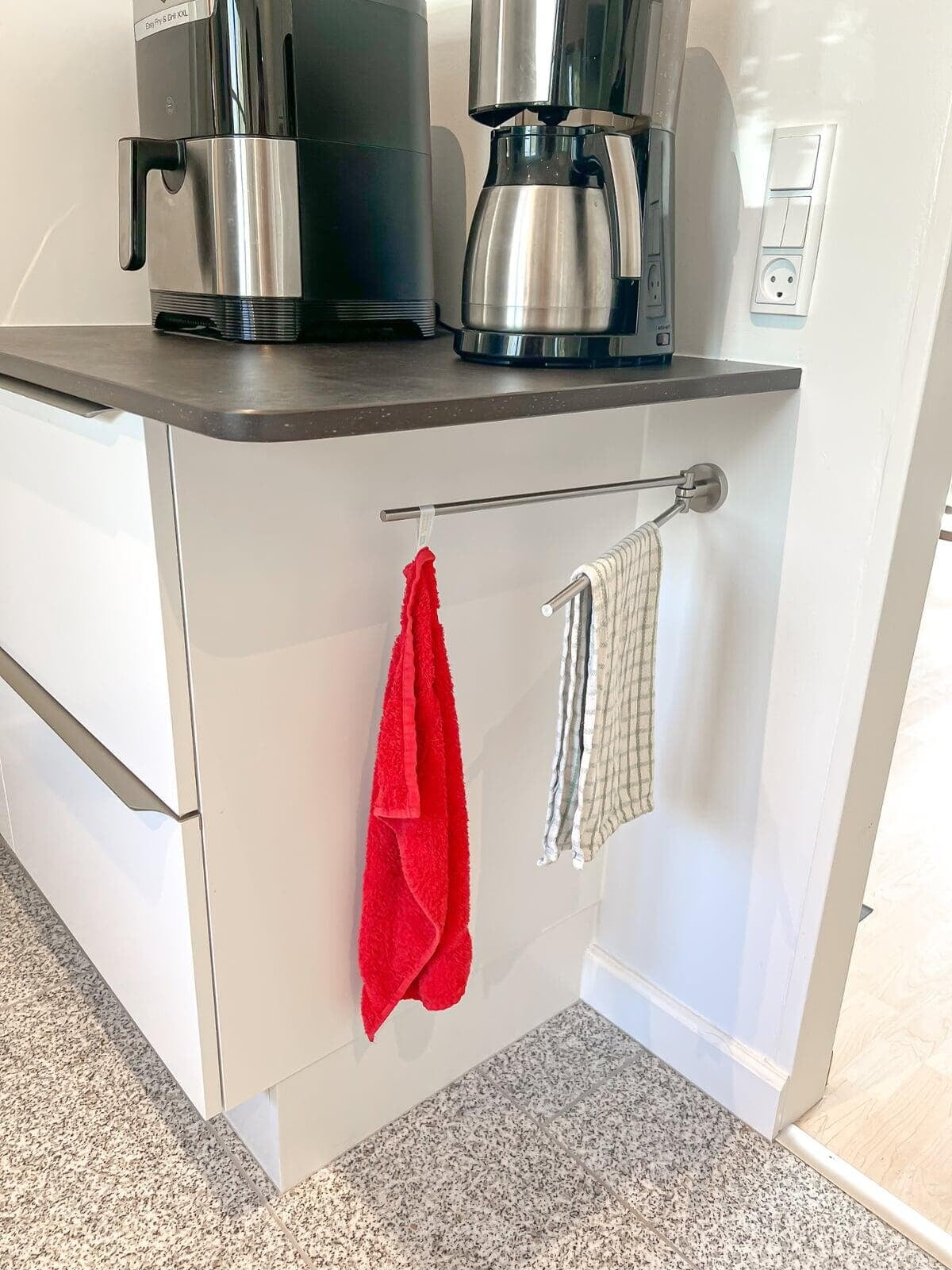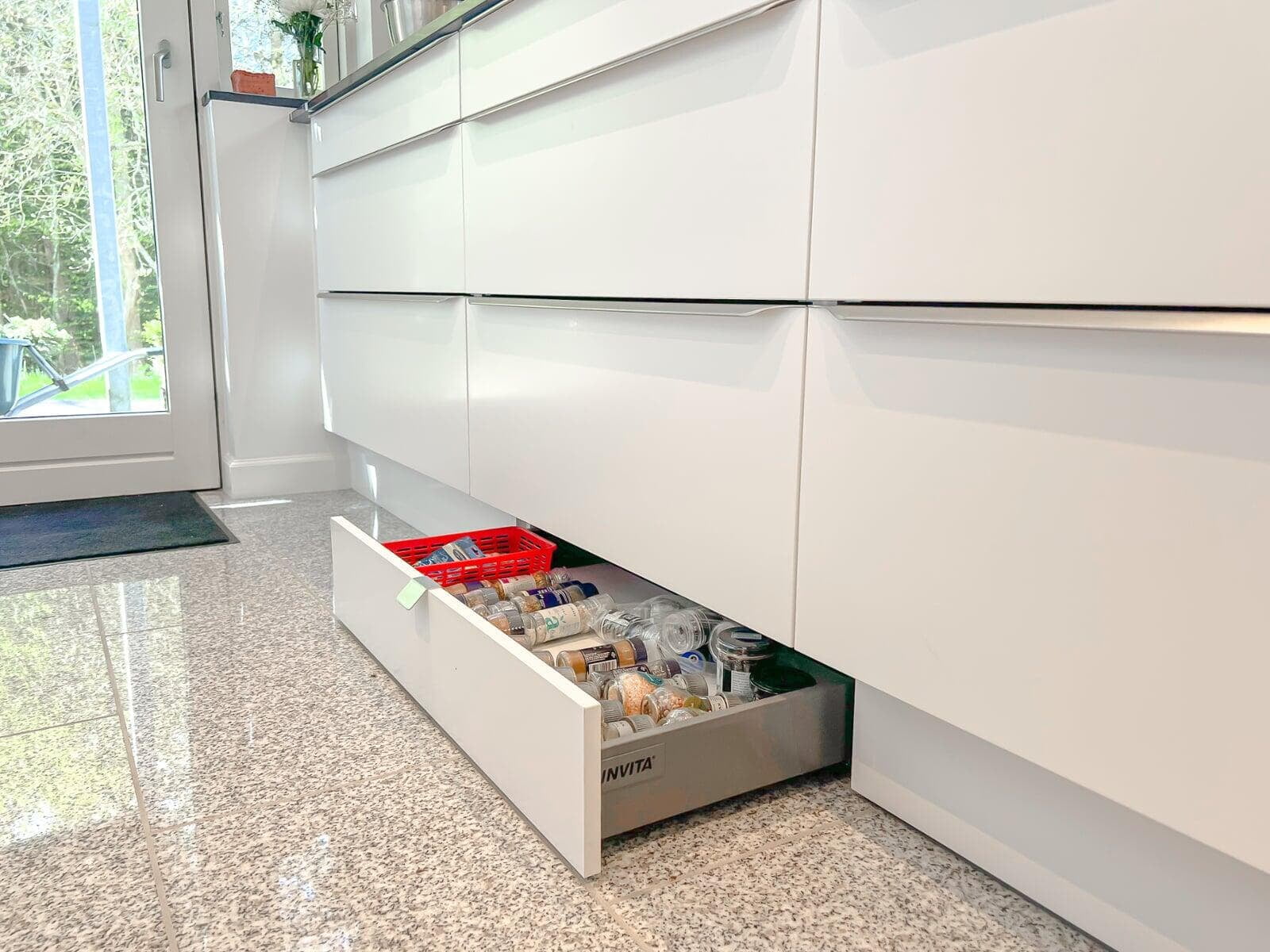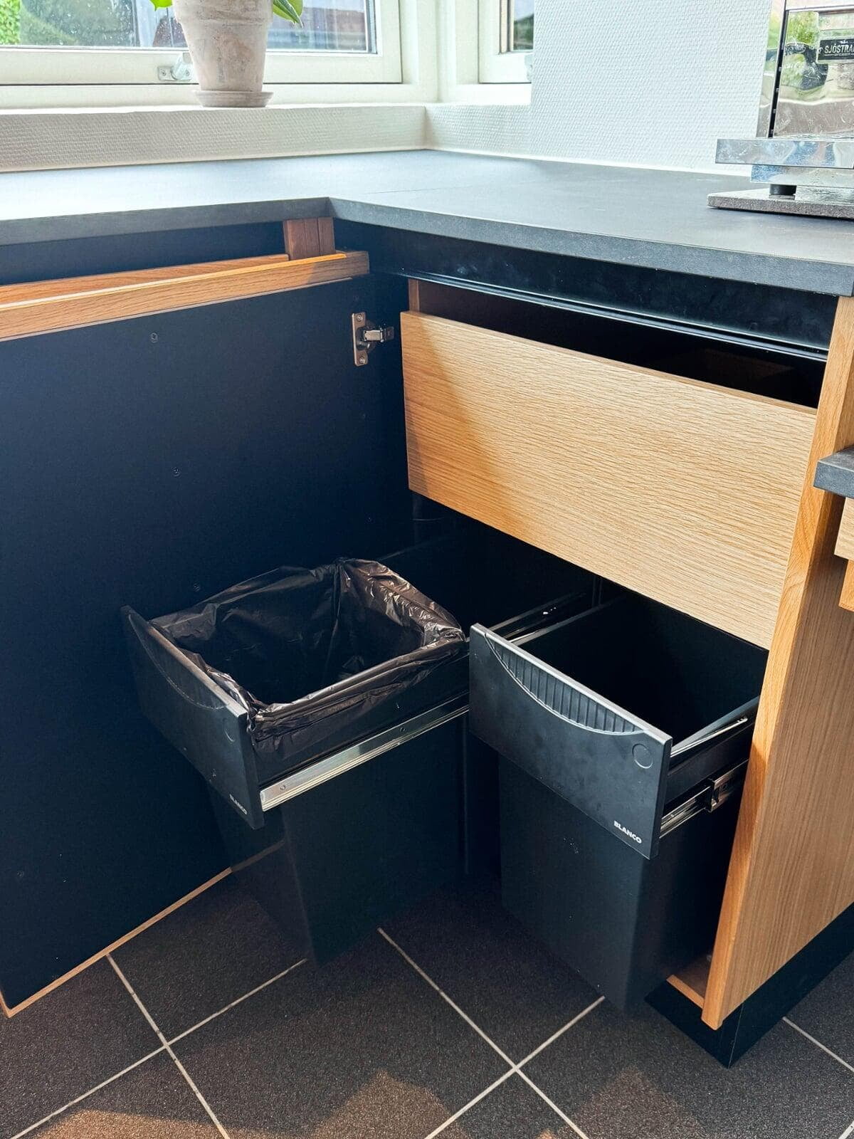 Der er tænkt i god udnyttelse af gulvpladsen ved køkkenvasken, så bordpladen kunne blive ekstra dyb, og der blev plads til et højskab. Vi er også rigtig glade for de smarte udtræksskabe med karoussel og praktiske hylder, og så har vi fået et kaffehjørne. Kris Møller, Fredensborg