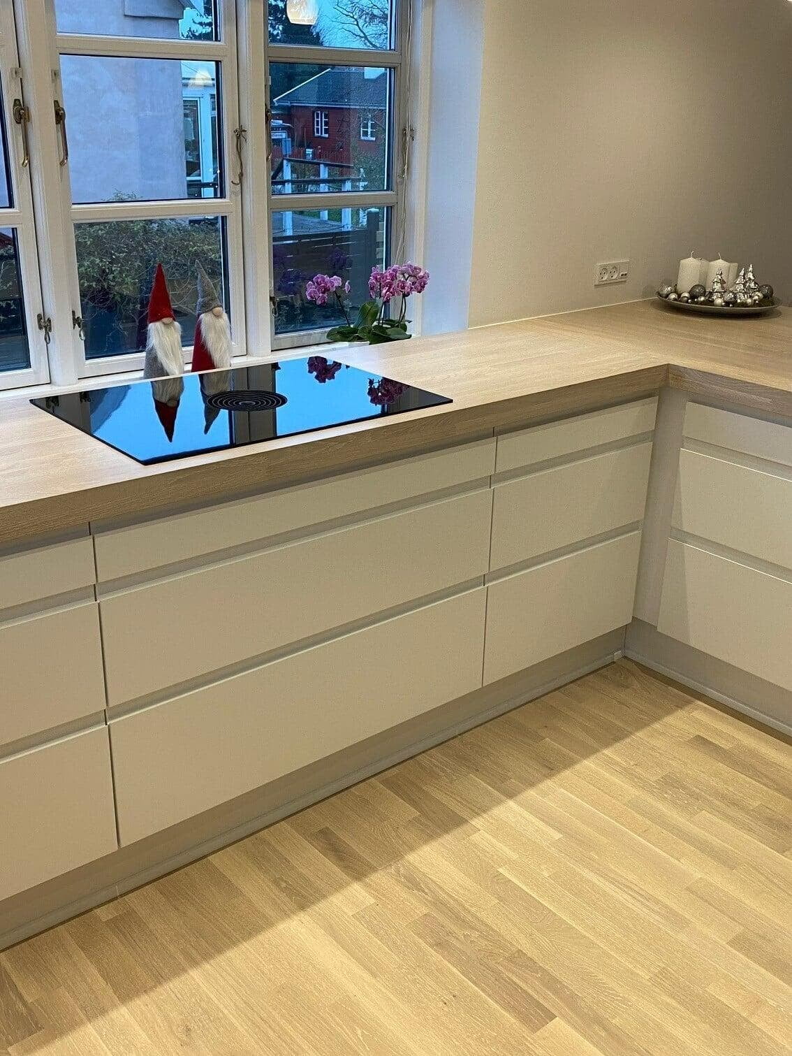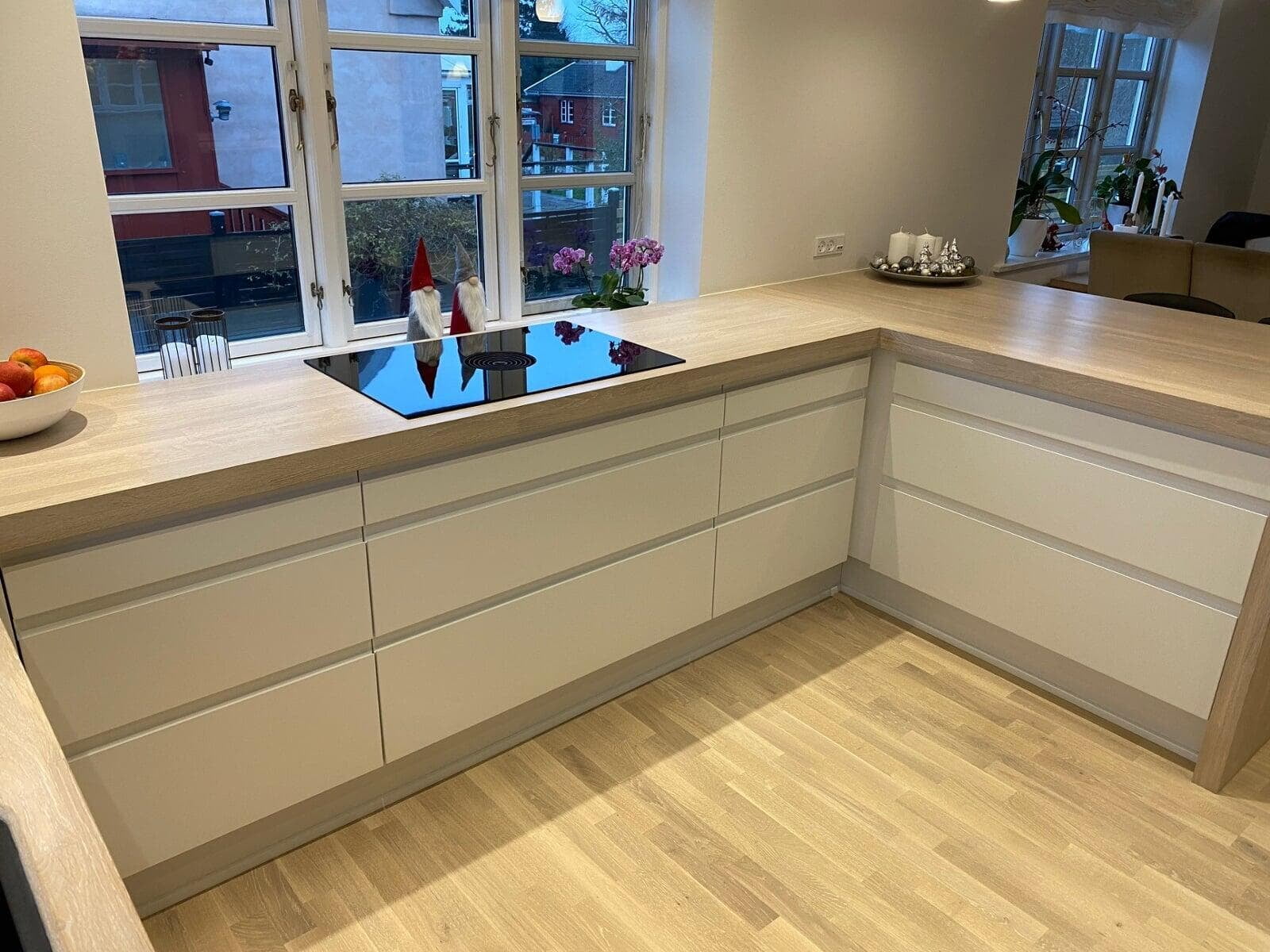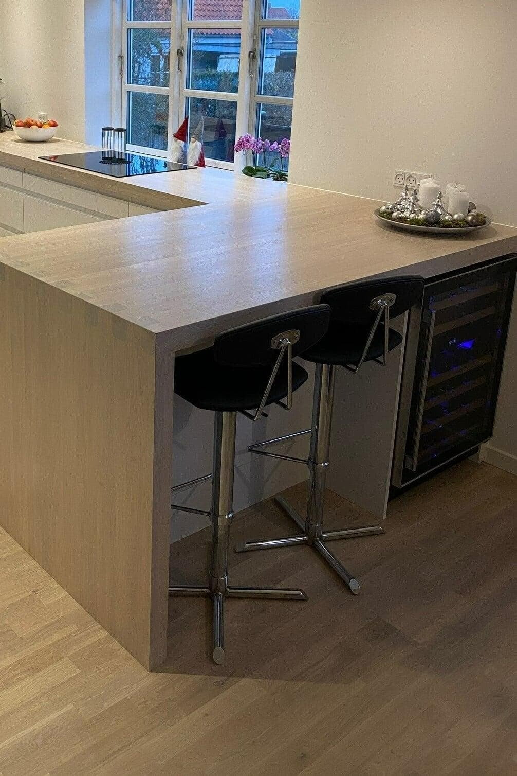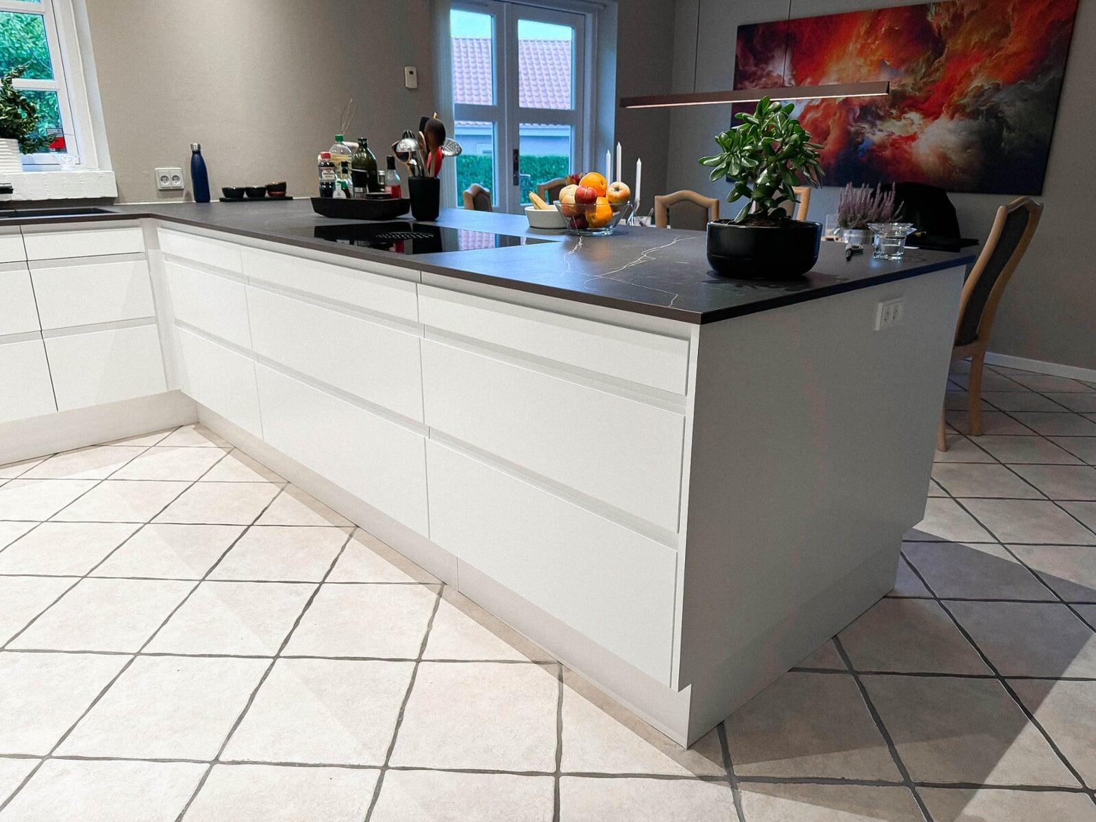Ønsket var et stort og indbydende køkken med god plads til gæster og til opbevaring. Vi er rigtig glade for hvordan stilen i køkkenet er gennemgående i hele rummet, og vi vil gerne fremhæve de smarte hjørneskuffer og BORA kogepladen – genialt. Tak for den gode oplevelse. Ann og Morten, Gørløse.