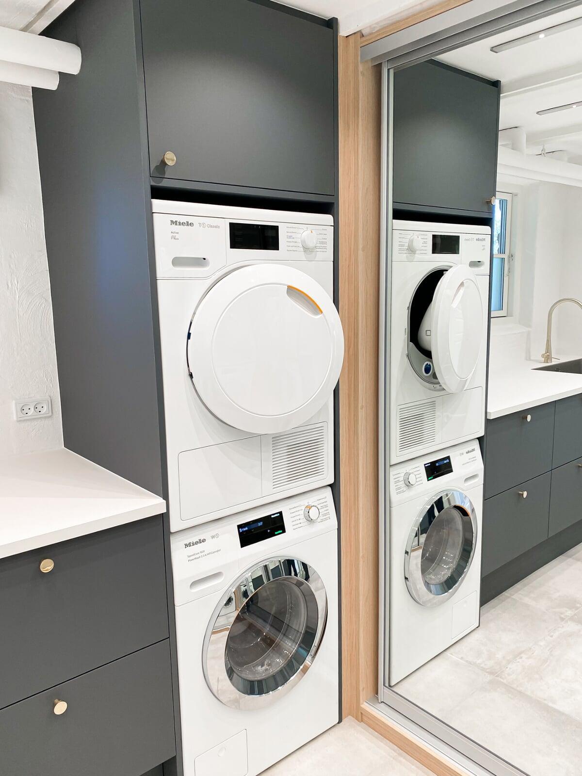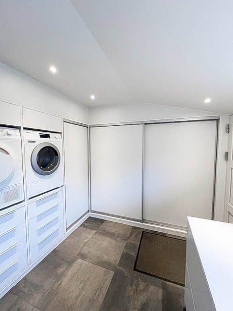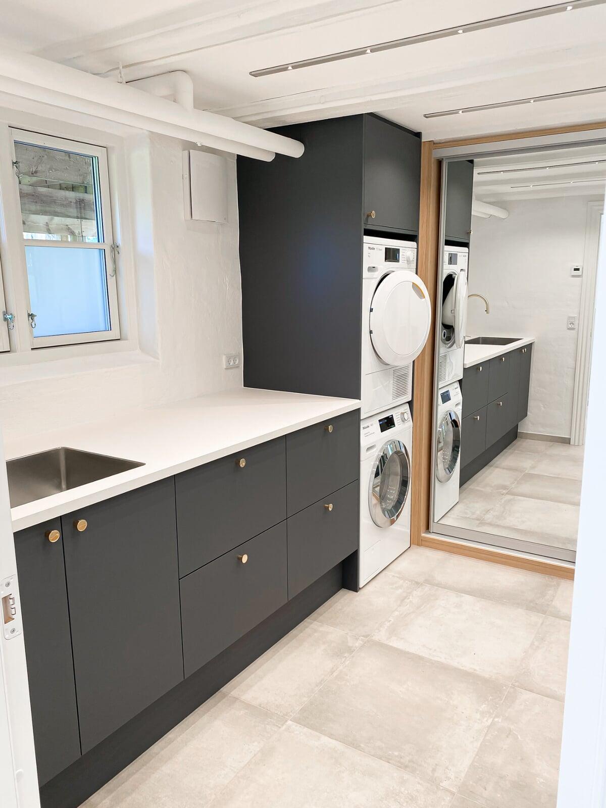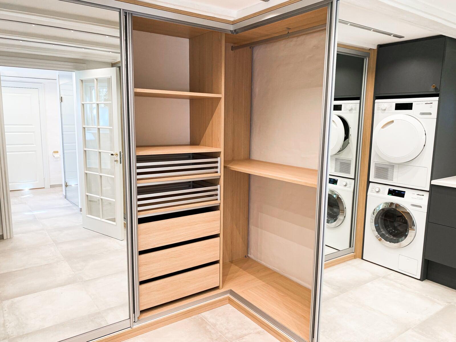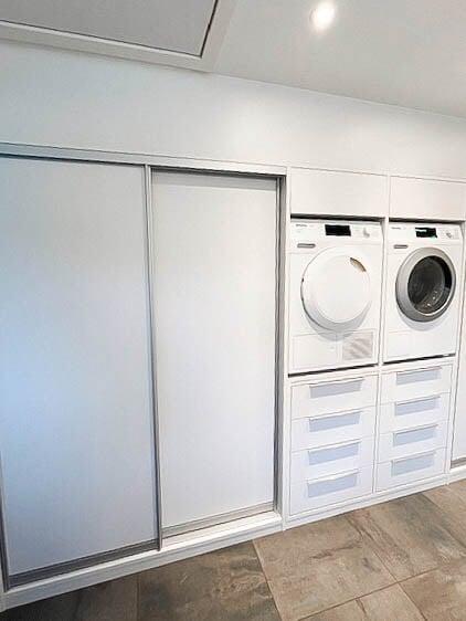 Denne smarte skydedørsløsning sikrer et pænt og ryddeligt udtryk ved at skjule elmåler, BWT-anlæg og lignende installationer. Vaskemaskinen og tørretumbleren er placeret i en praktisk arbejdshøjde, mens der samtidig er skabt plads til rigelig opbevaring nedenunder.