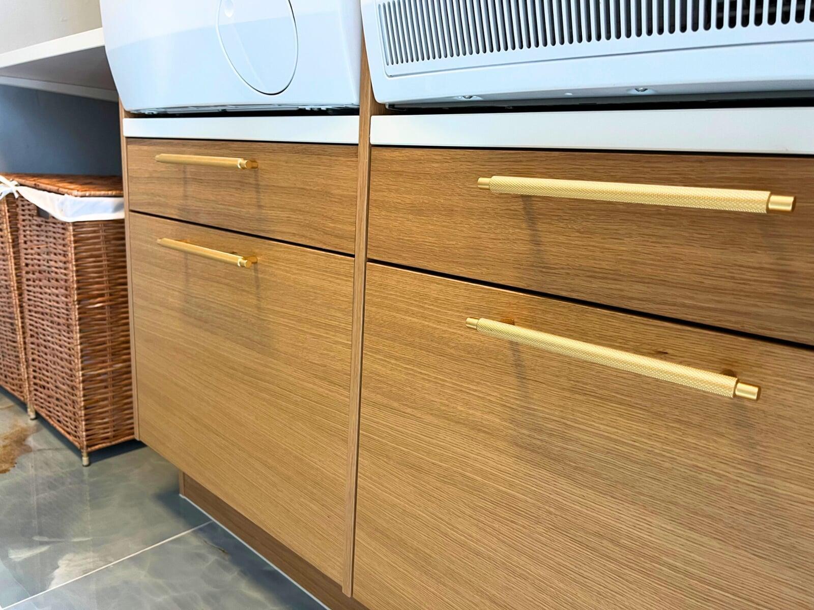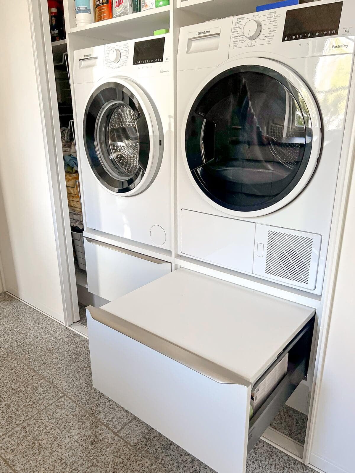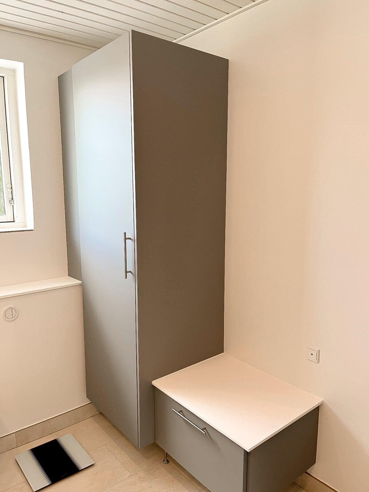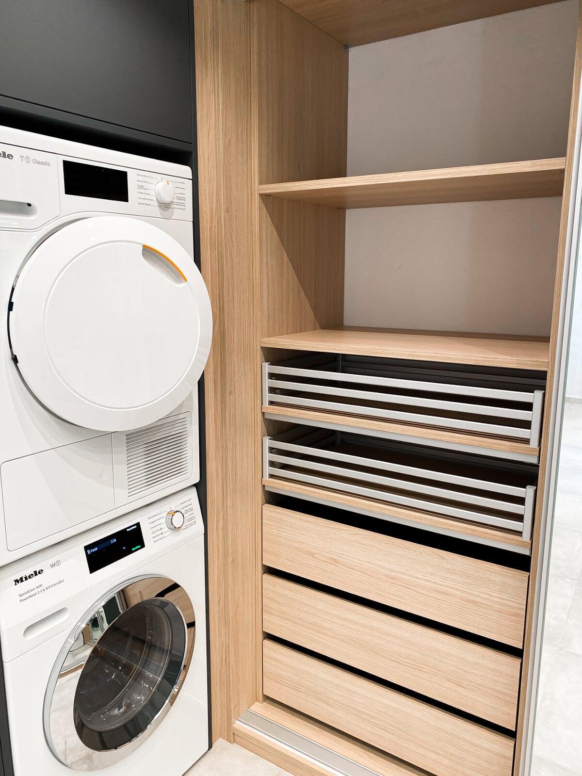 Denne smarte skydedørsløsning sikrer et pænt og ryddeligt udtryk ved at skjule elmåler, BWT-anlæg og lignende installationer. Vaskemaskinen og tørretumbleren er placeret i en praktisk arbejdshøjde, mens der samtidig er skabt plads til rigelig opbevaring nedenunder.