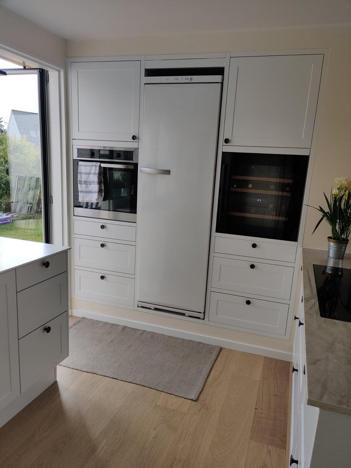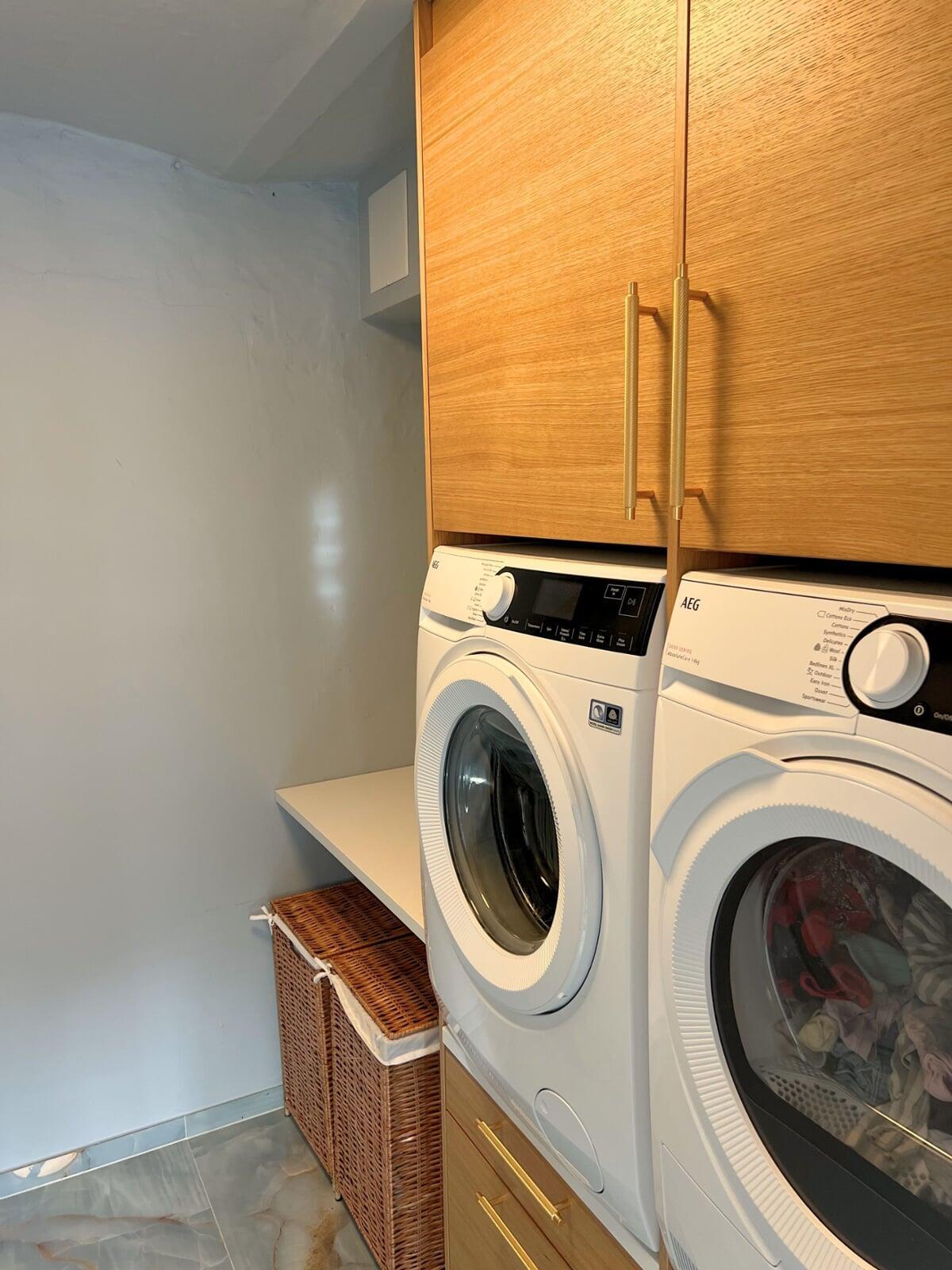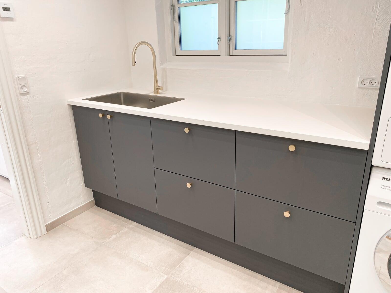 Masser af skabsplads inkl. plads til en kombineret vaske/tørremaskine, som er skjult bag den hvide skabslåge. Det fungerer godt, og stilen passer fint til den integrerede vask med armatur i krom, og den hvide bordplade i corian. Det er blevet præcis, som vi gerne ville have det. Merete, Birkerød
