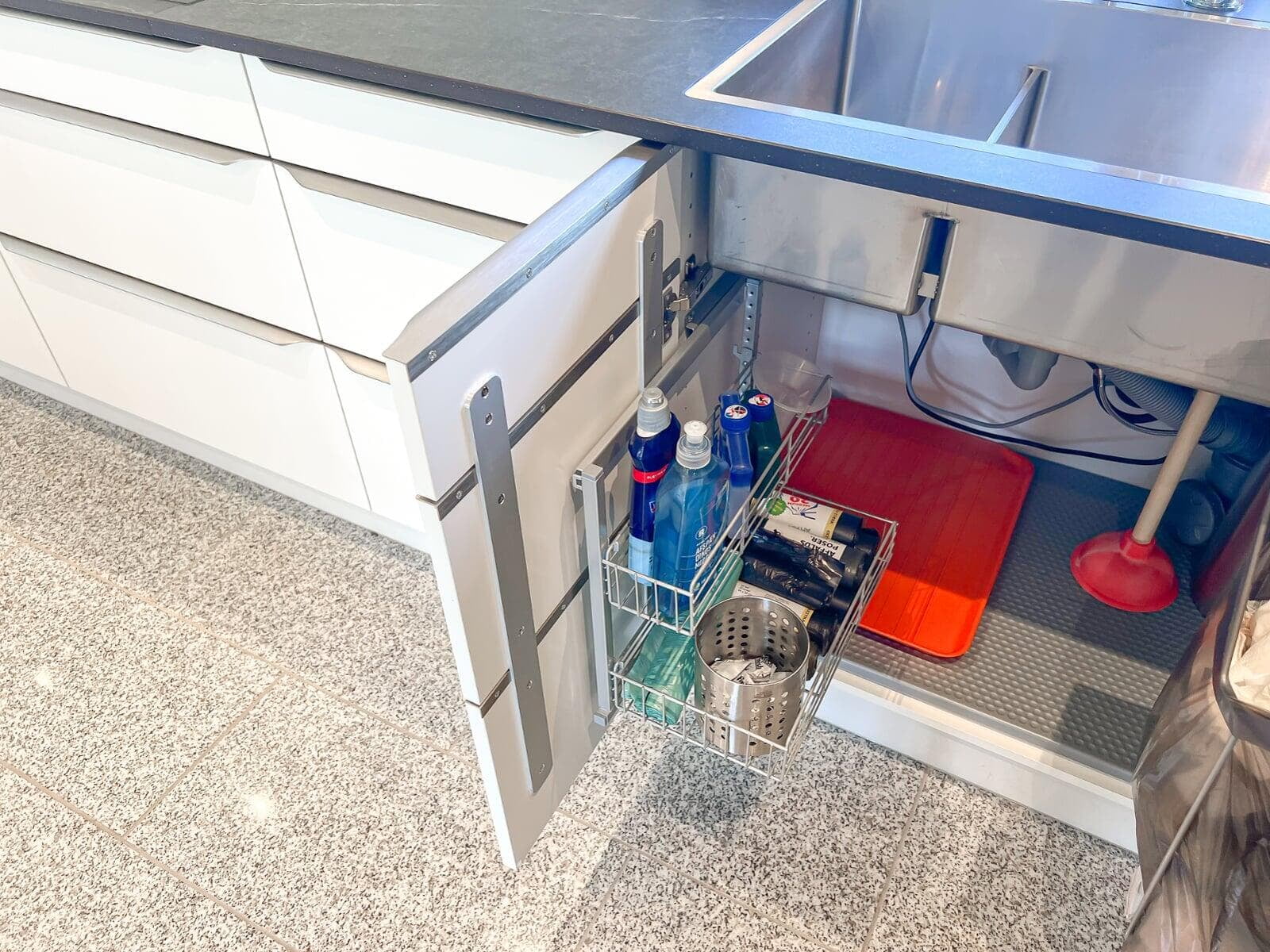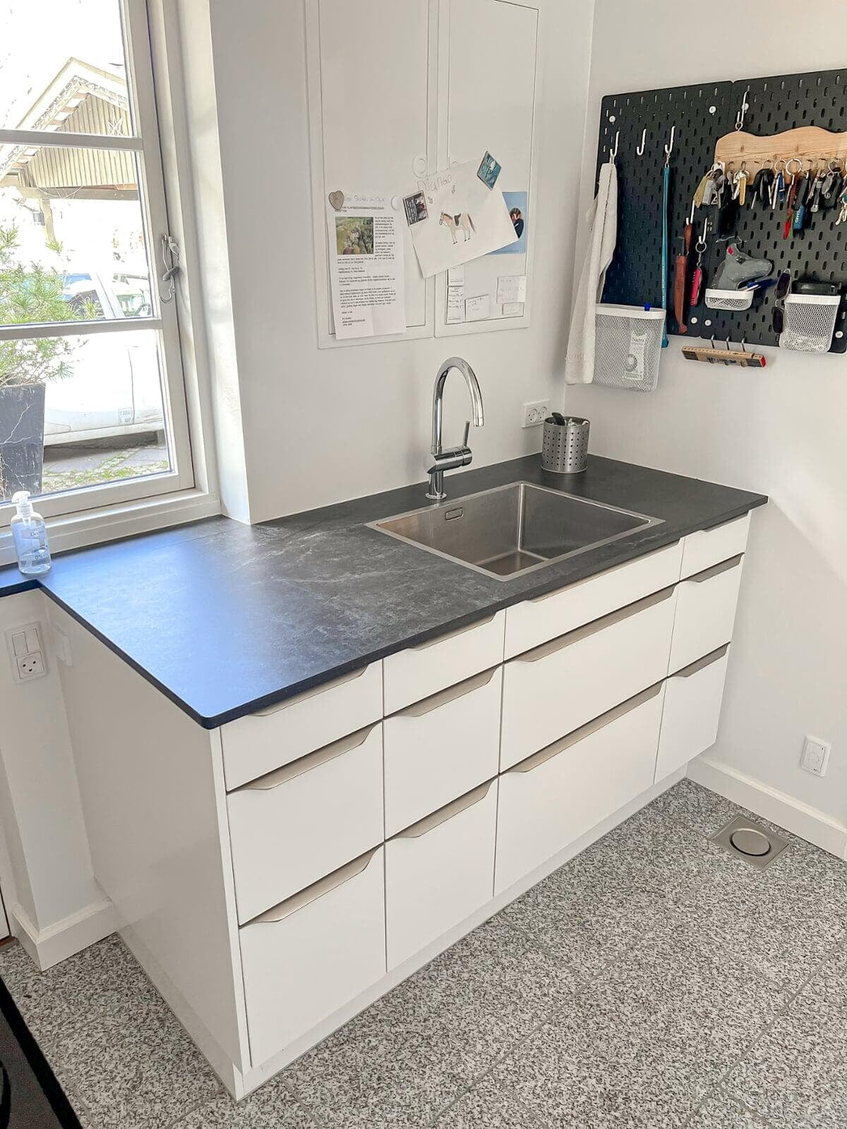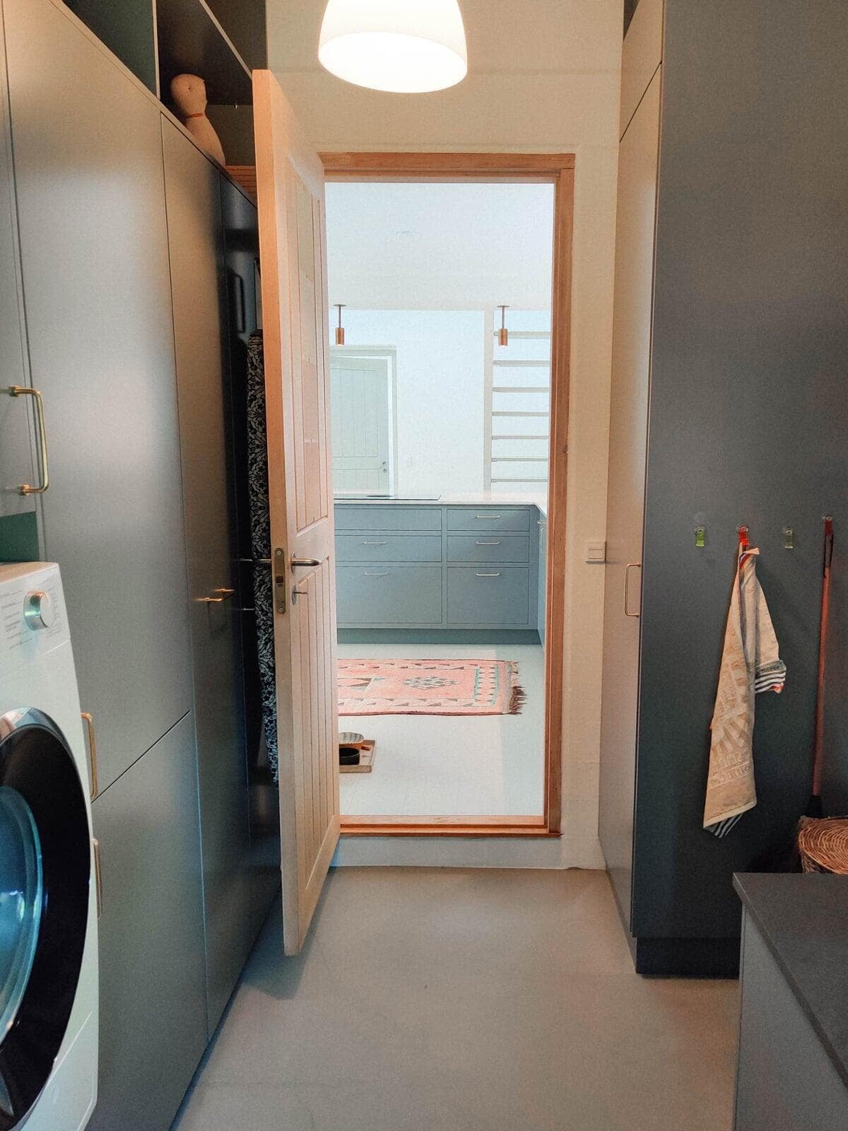 Masser af skabsplads inkl. plads til en kombineret vaske/tørremaskine, som er skjult bag den hvide skabslåge. Det fungerer godt, og stilen passer fint til den integrerede vask med armatur i krom, og den hvide bordplade i corian. Det er blevet præcis, som vi gerne ville have det. Merete, Birkerød
