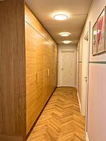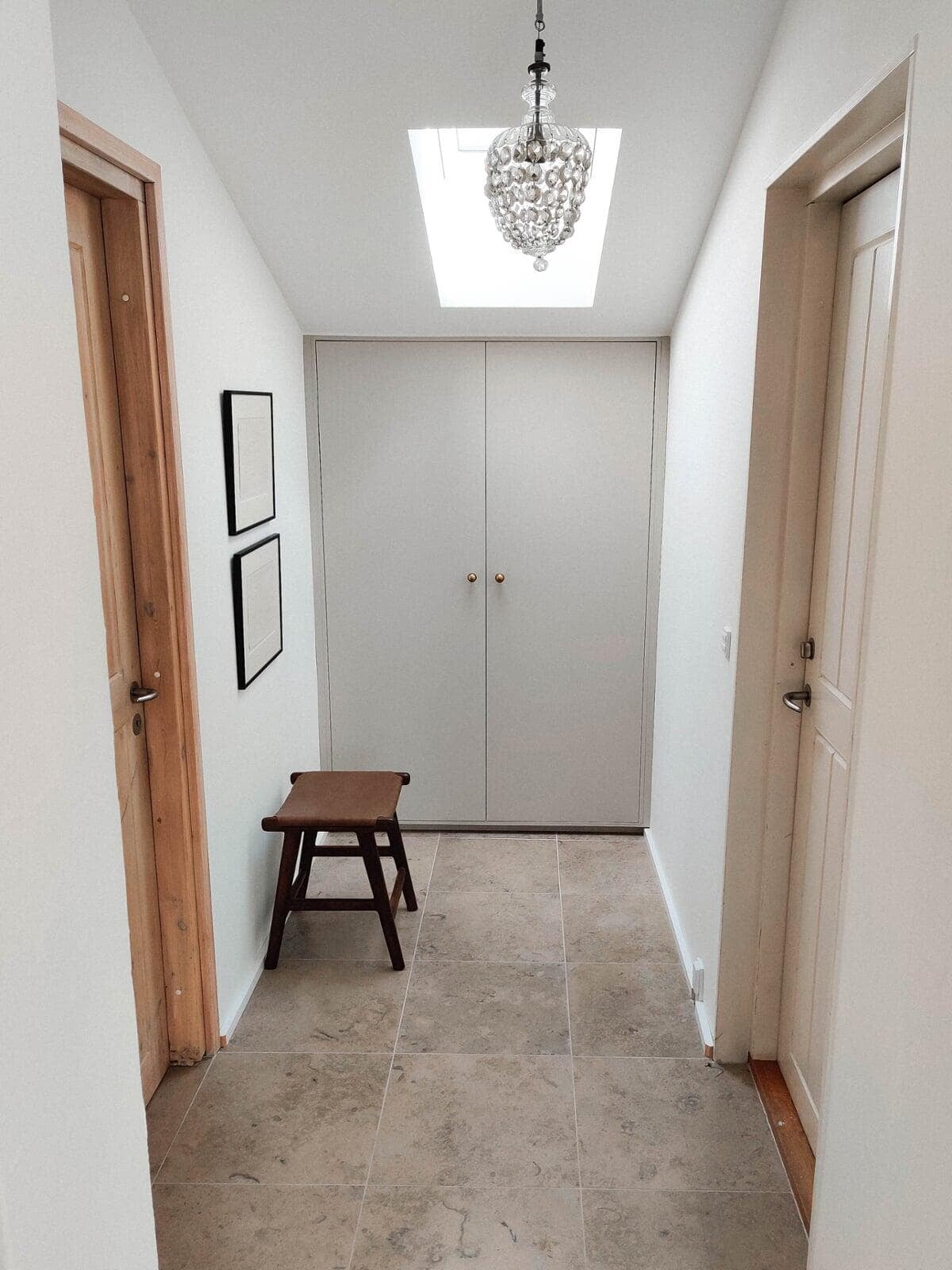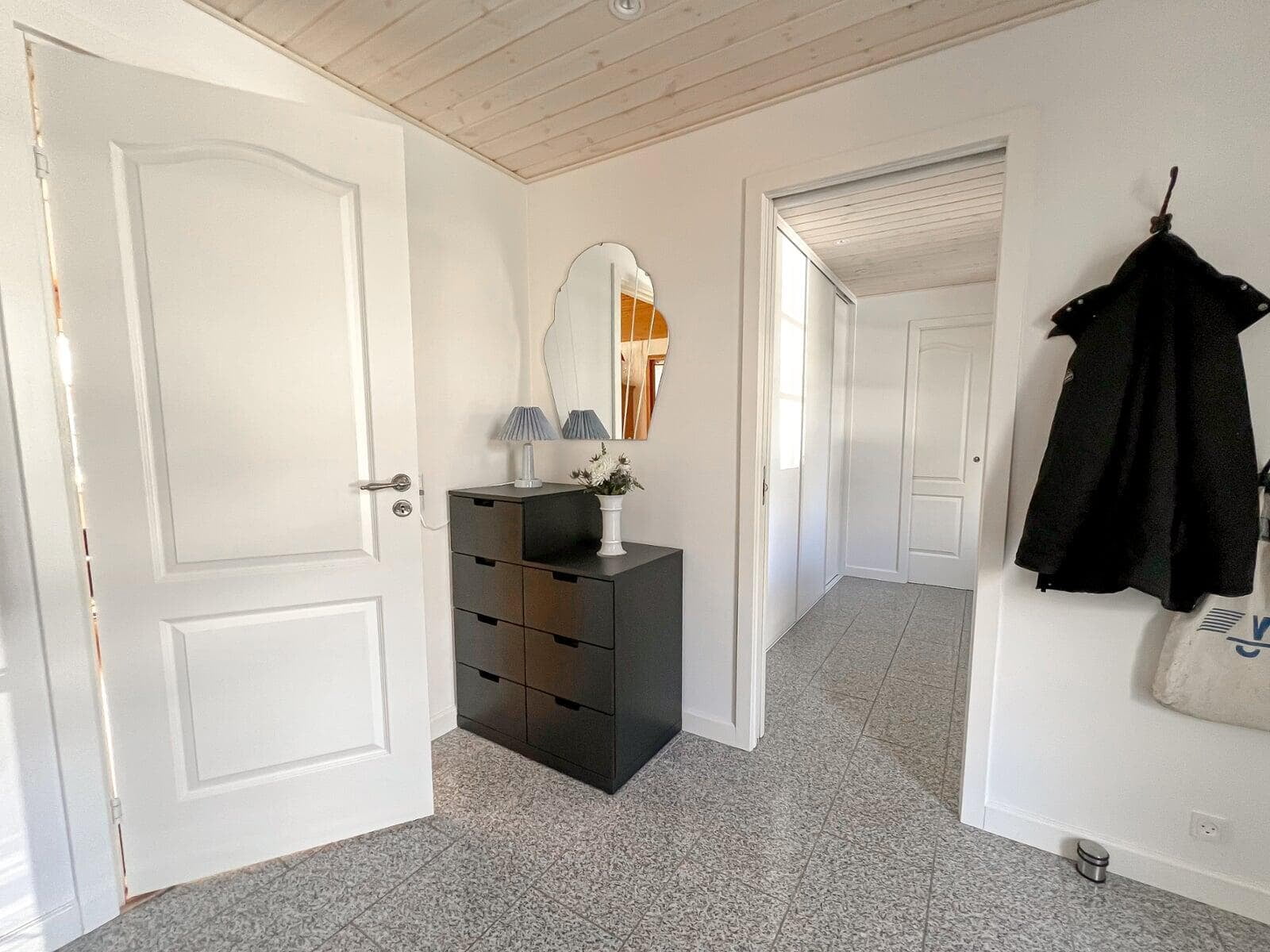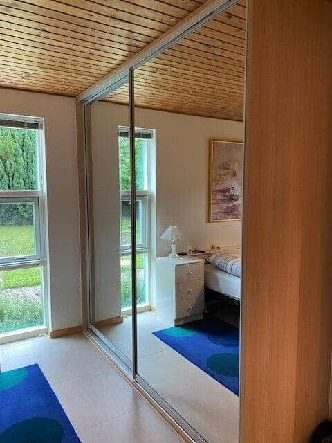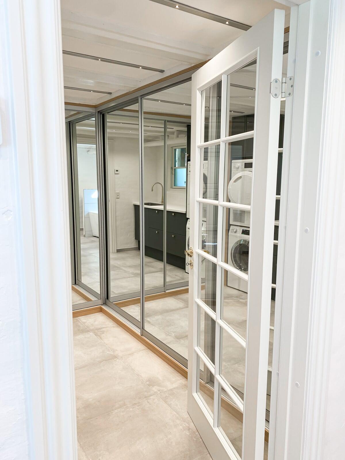 Da badeværelset skulle friskes op, blev beslutningen om at fjerne saunaen taget. Dørhullet fra badeværelset til saunaen blev lukket, og der blev i stedet åbnet op fra entreen, så der nu er en smart walk-in garderobe med plads til overtøj og masser af sko. Super god løsning – vi er meget tilfredse.