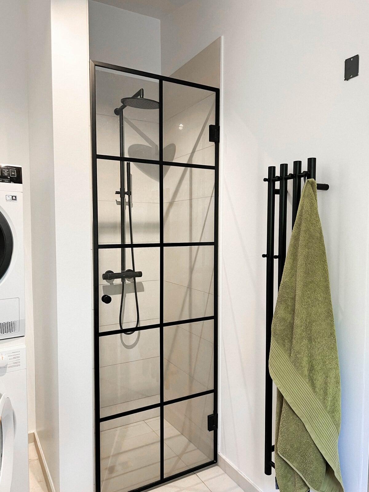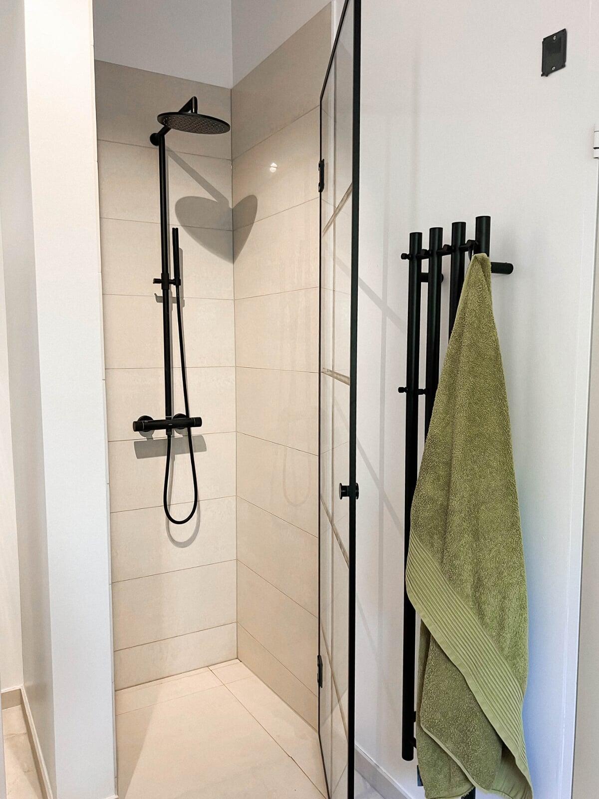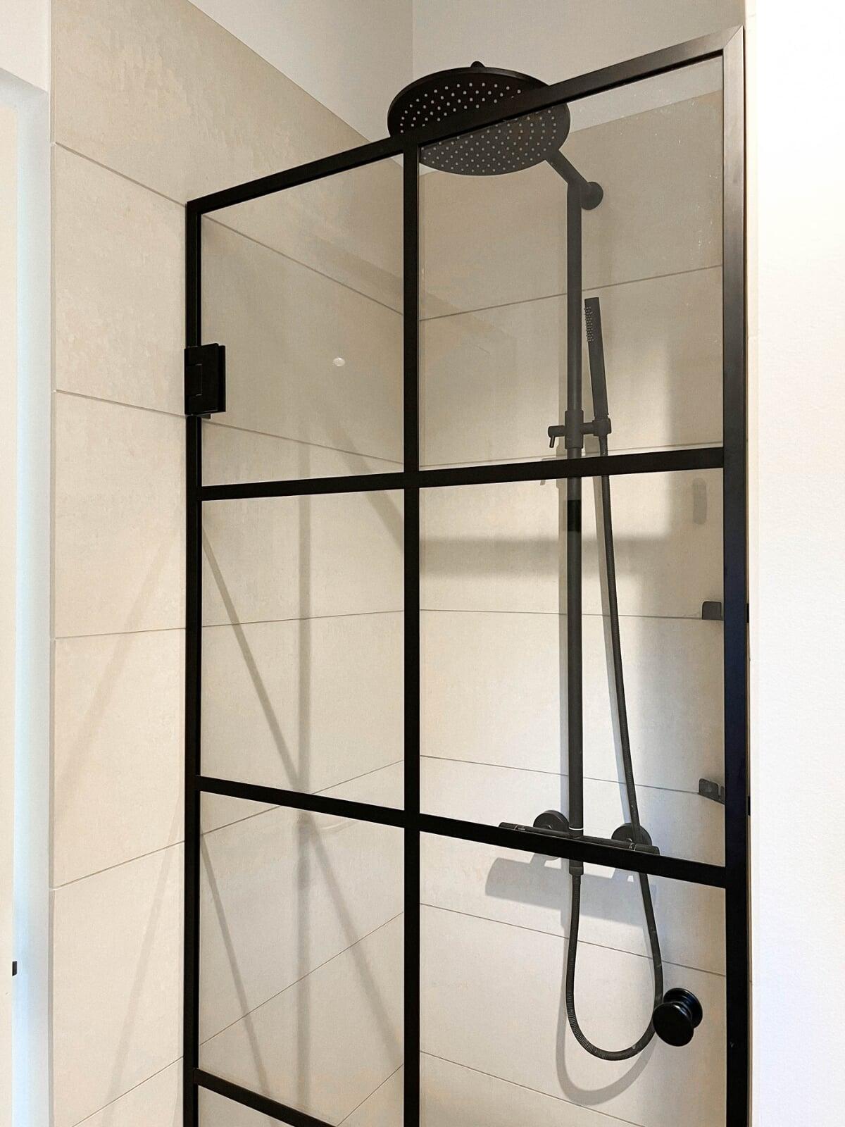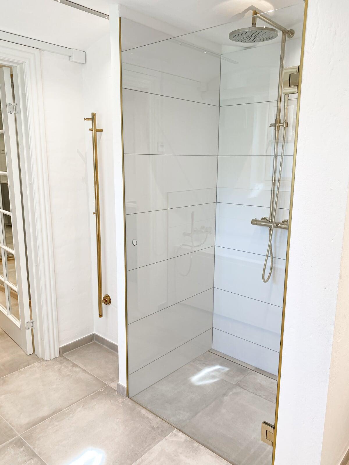 Totalrenovering af badeværelse med 120x120 cm fliser for et næsten sømløst udtryk. Vi har monteret fleksible brusedøre, der kan foldes ind og frigive plads. Alt interiør er nyt, og rummet fuldendes af et stilrent badmøbel med stenbordplade og integreret vask.