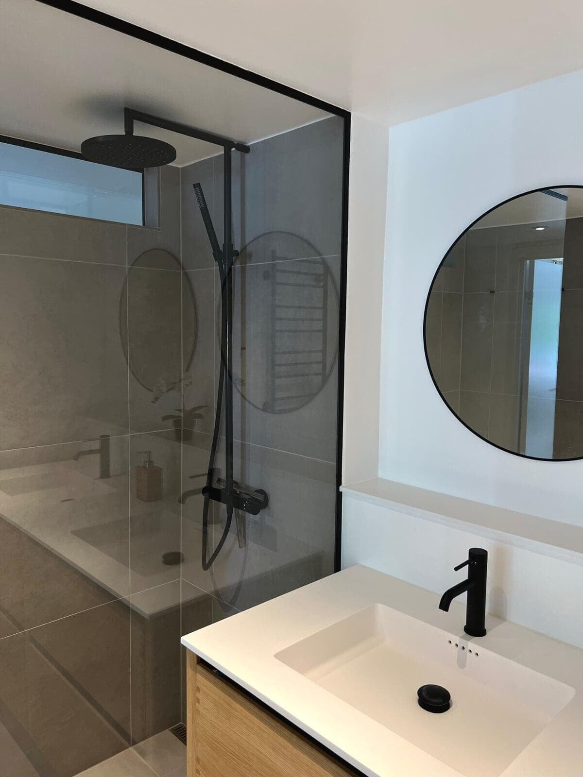 Vi har netop afleveret et gennemført entrepriseprojekt. Resultatet? Et stilrent og funktionelt rum med fokus på æstetik, holdbarhed og kvalitet. Det nye badeværelse er indrettet med materialer, der både er smukke og praktiske. Skabsfronterne er udført i Everline finer i sort eg, som tilfører rummet et eksklusivt, roligt udtryk. Bordplade, cisterneplade og vinduesplade er alle lavet i det elegante og slidstærke materiale Solid Surface, der sikrer en ensartet og harmonisk finish. Et projekt, hvor detaljerne gør hele forskellen – og hvor kundens vision blev til virkelighed.