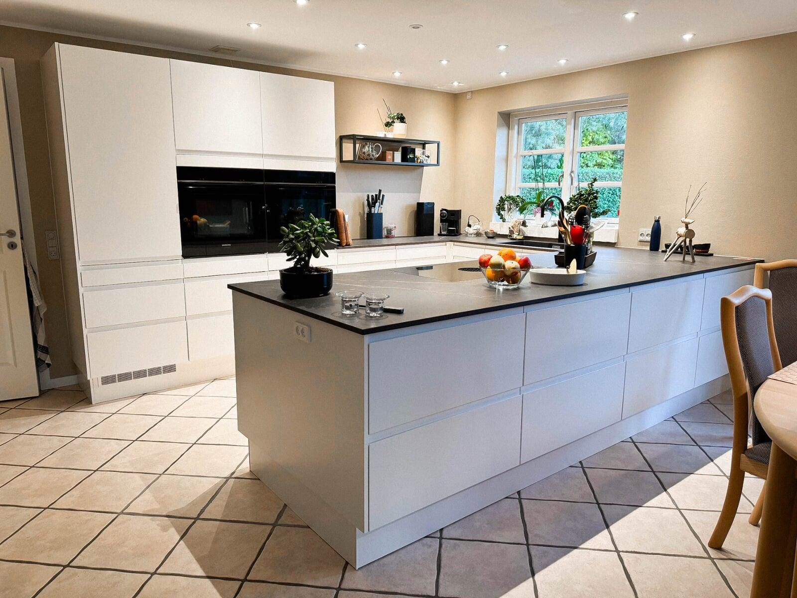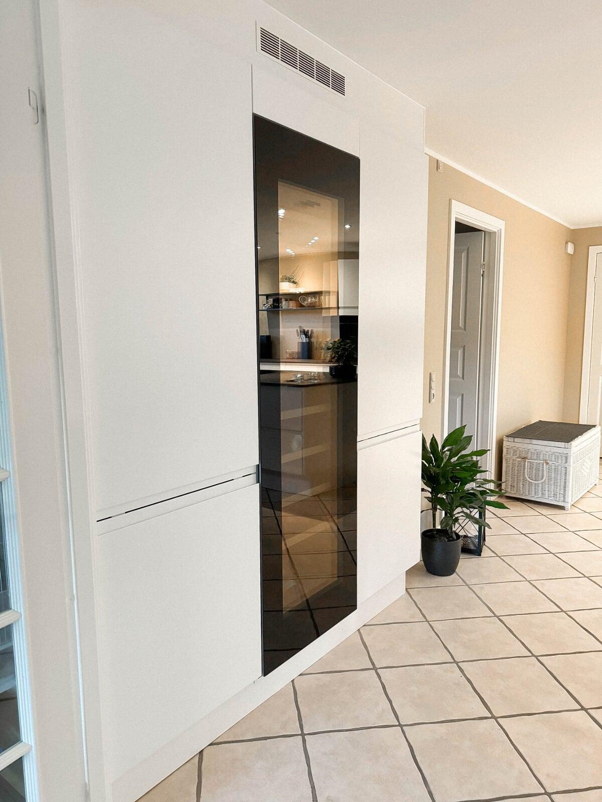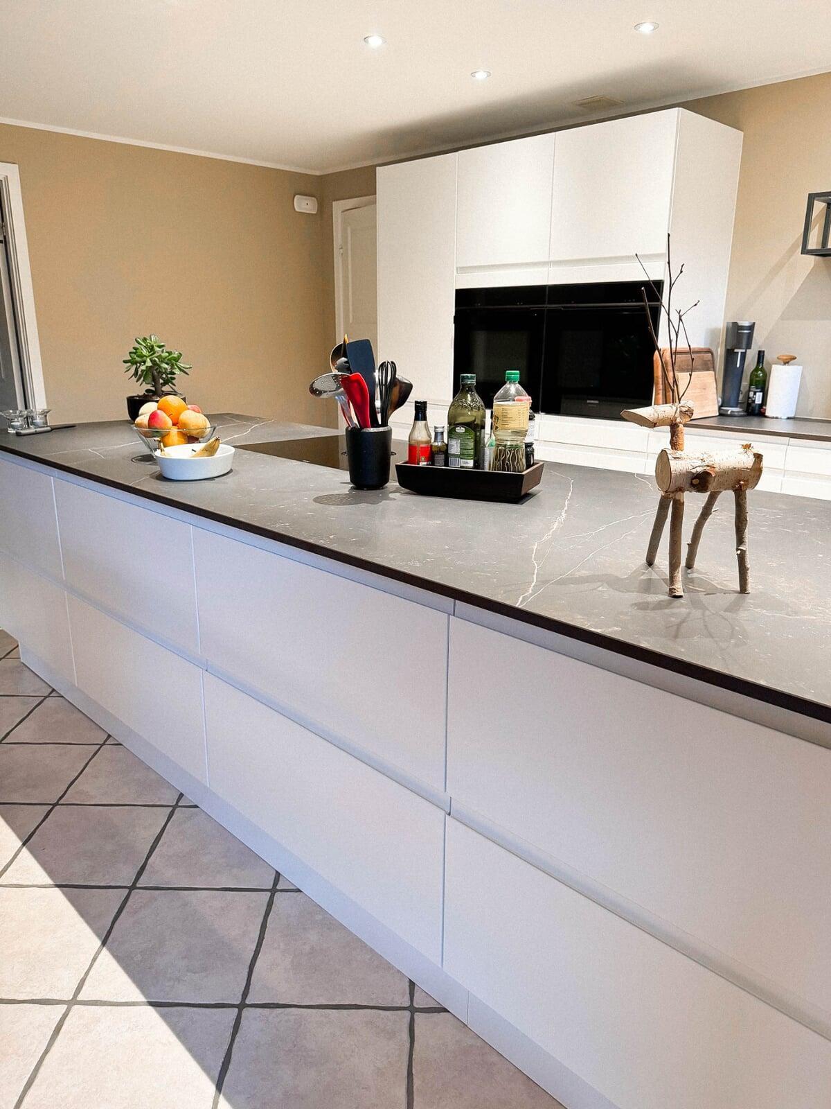 Jeanette og Sørens hvide Slimeline køkken med 20 mm Dekton bordplader er det perfekte match af stil og funktionalitet. De nyeste Siemens hvidevarer, Bora X-Pure kogeplade og en elegant indbygget vinsektion med opbevaring tilføjer luksus til det moderne design.