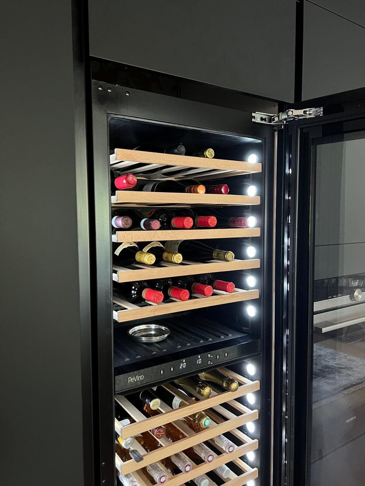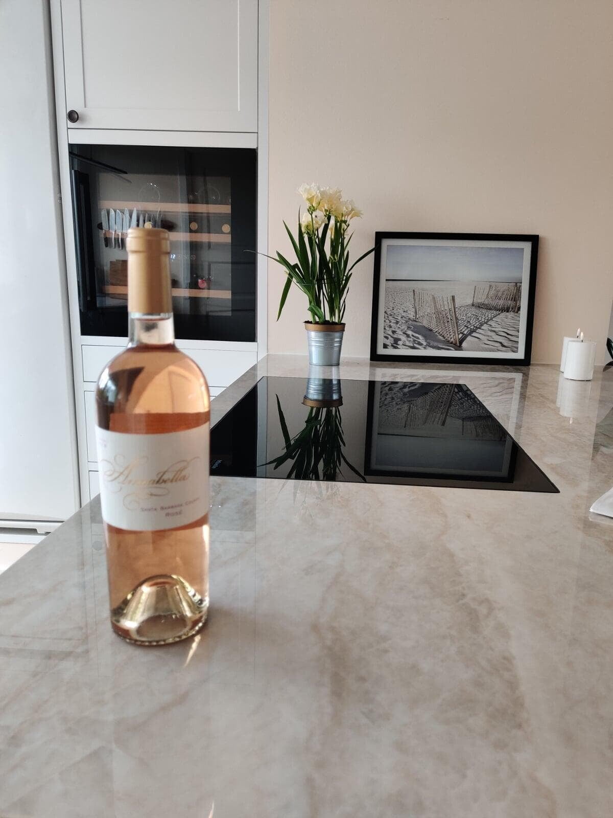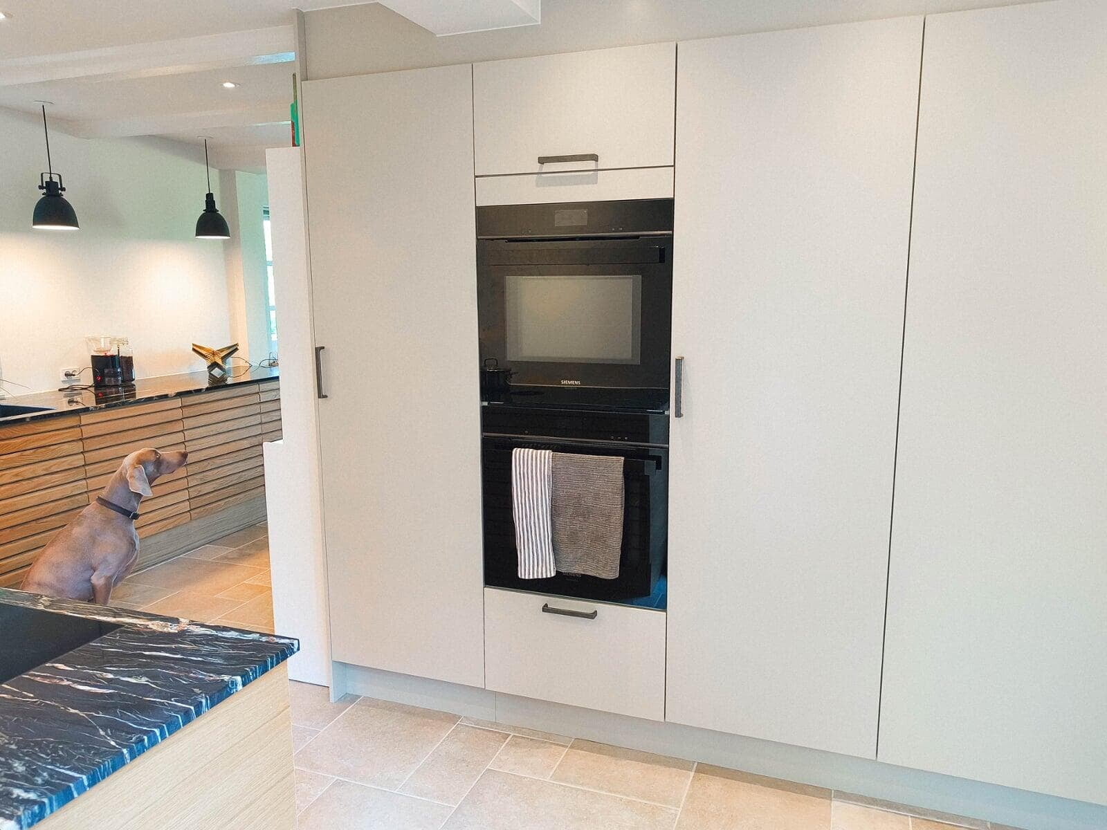 Jeanette og Sørens hvide Slimeline køkken med 20 mm Dekton bordplader er det perfekte match af stil og funktionalitet. De nyeste Siemens hvidevarer, Bora X-Pure kogeplade og en elegant indbygget vinsektion med opbevaring tilføjer luksus til det moderne design.