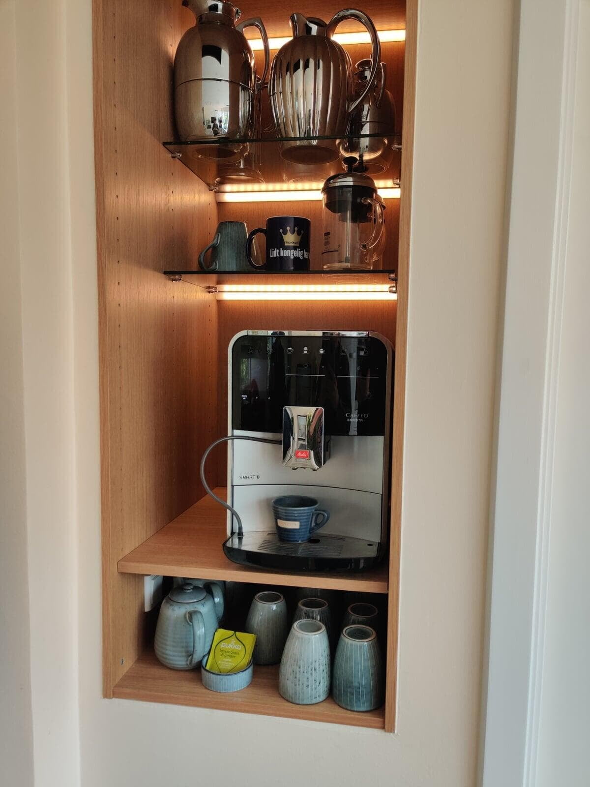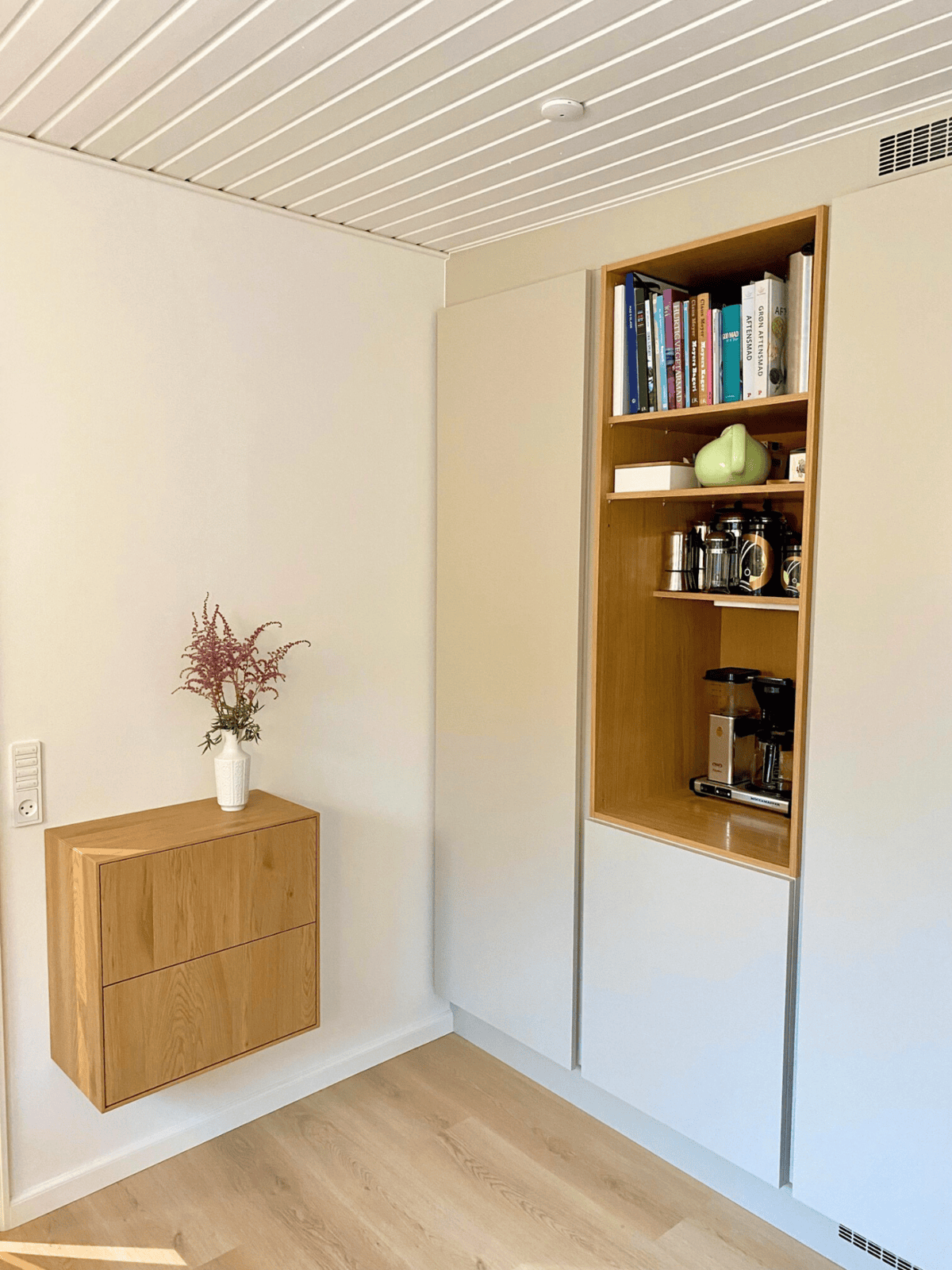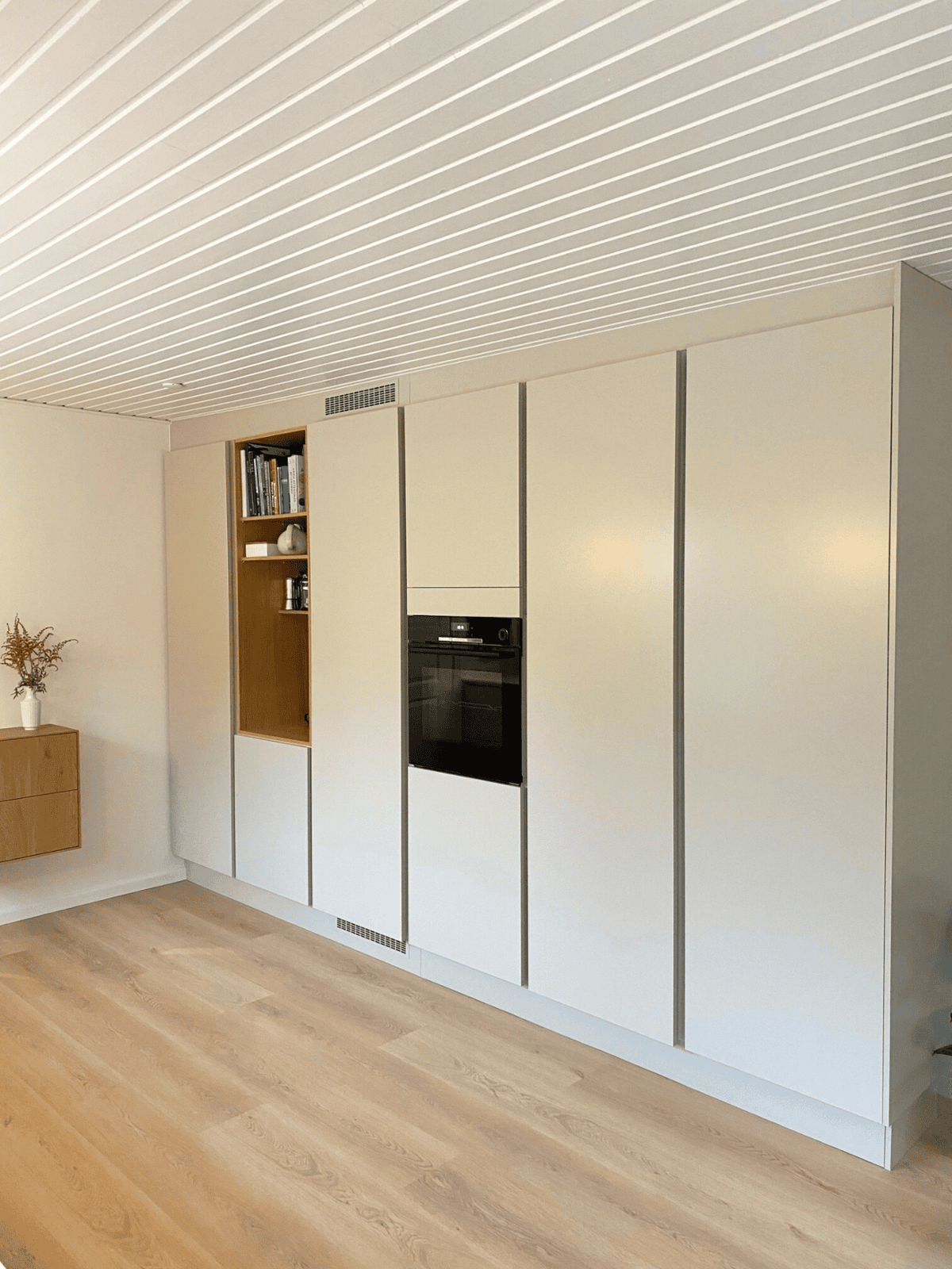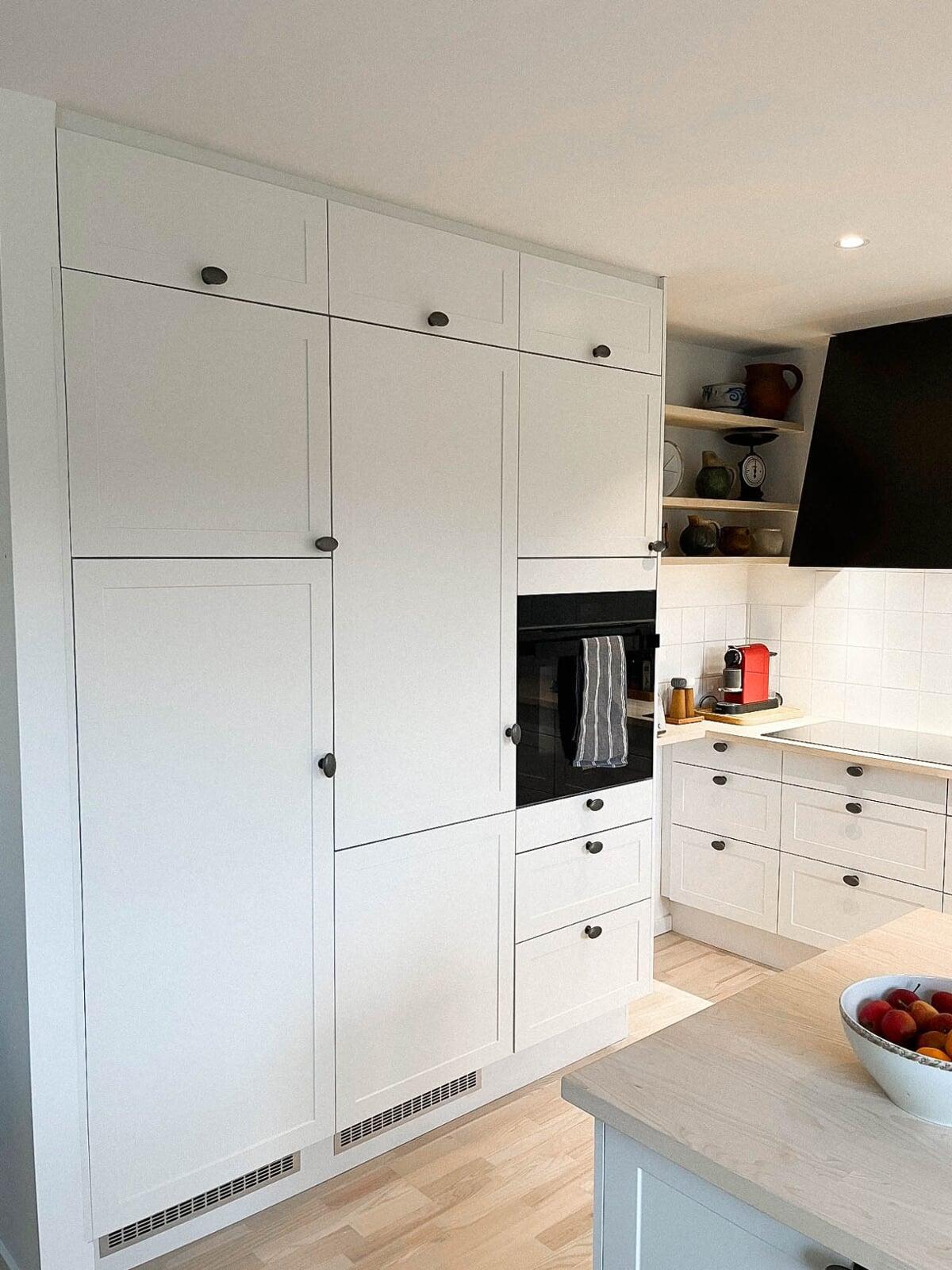 Der ikke flyttet en eneste væg; med kreative løsninger har vi fået lavet både et indbygget kaffeskab og en indbygget væg med ovn, køleskab og vinskab. Emhætten er på elegant vis nu integreret i loftet. Super sparring fra Helene. Det er blevet virkelig godt. Familien i Farum.