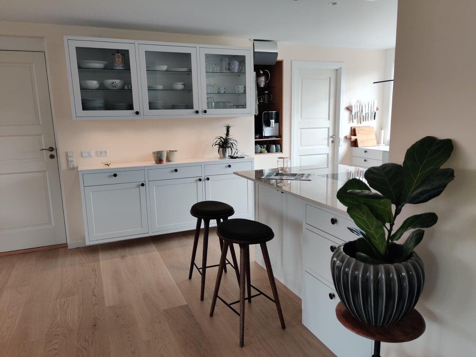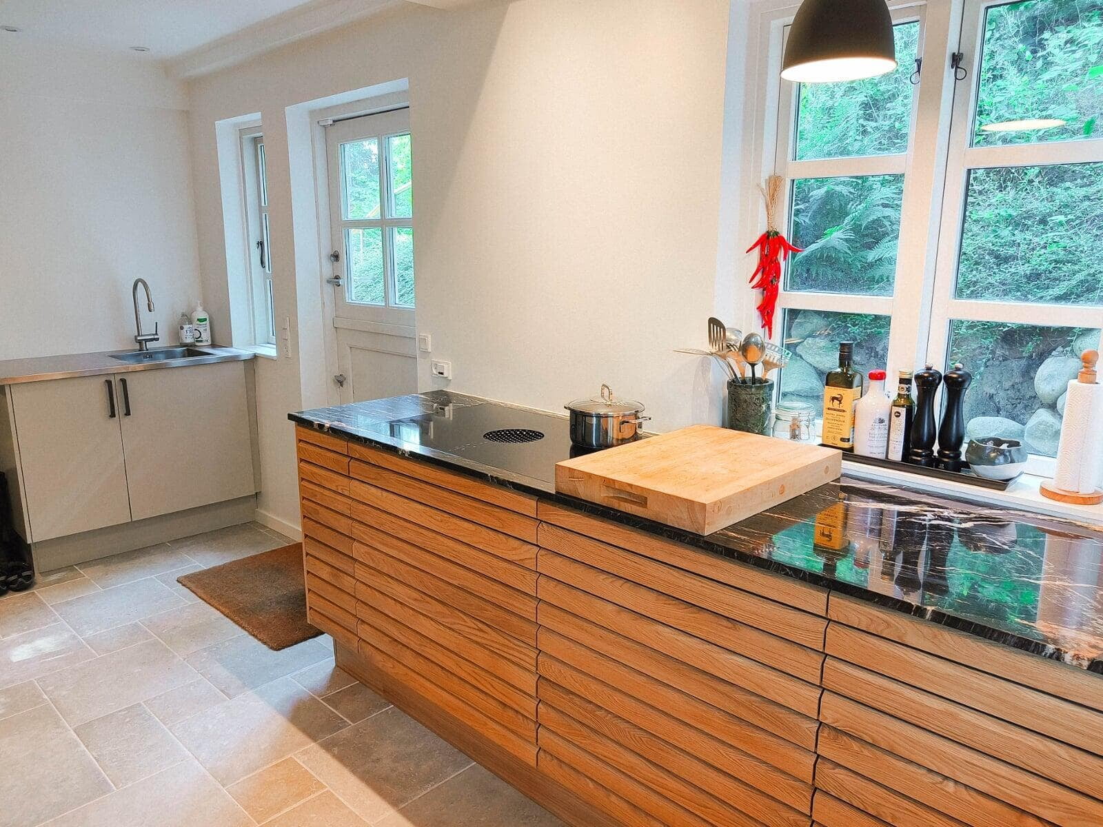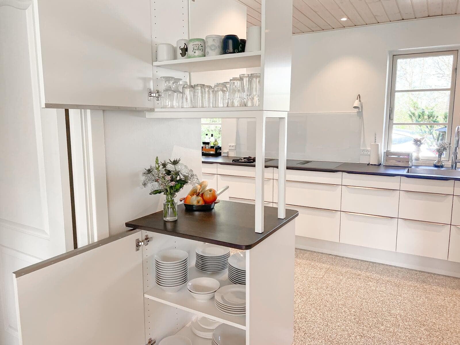 Med indbyggede overskabe og masser af skabsplads er der altid ryddeligt. Det gir’ mulighed for at dække op til buffet og invitere indenfor i det stilrene køkken. Stilen passer godt til husets arkitektur, og er videreført i tekøkkenet i kontorannekset, i arbejdsværelset og i de to badeværelser.