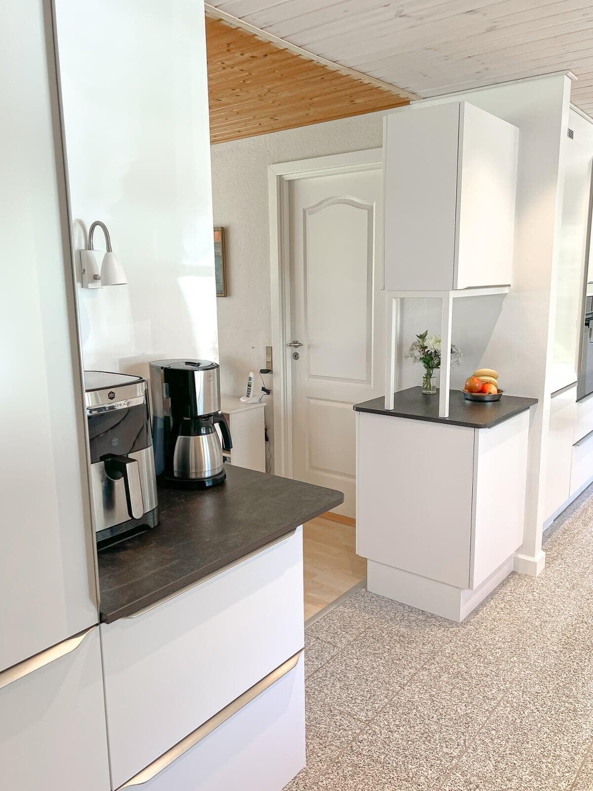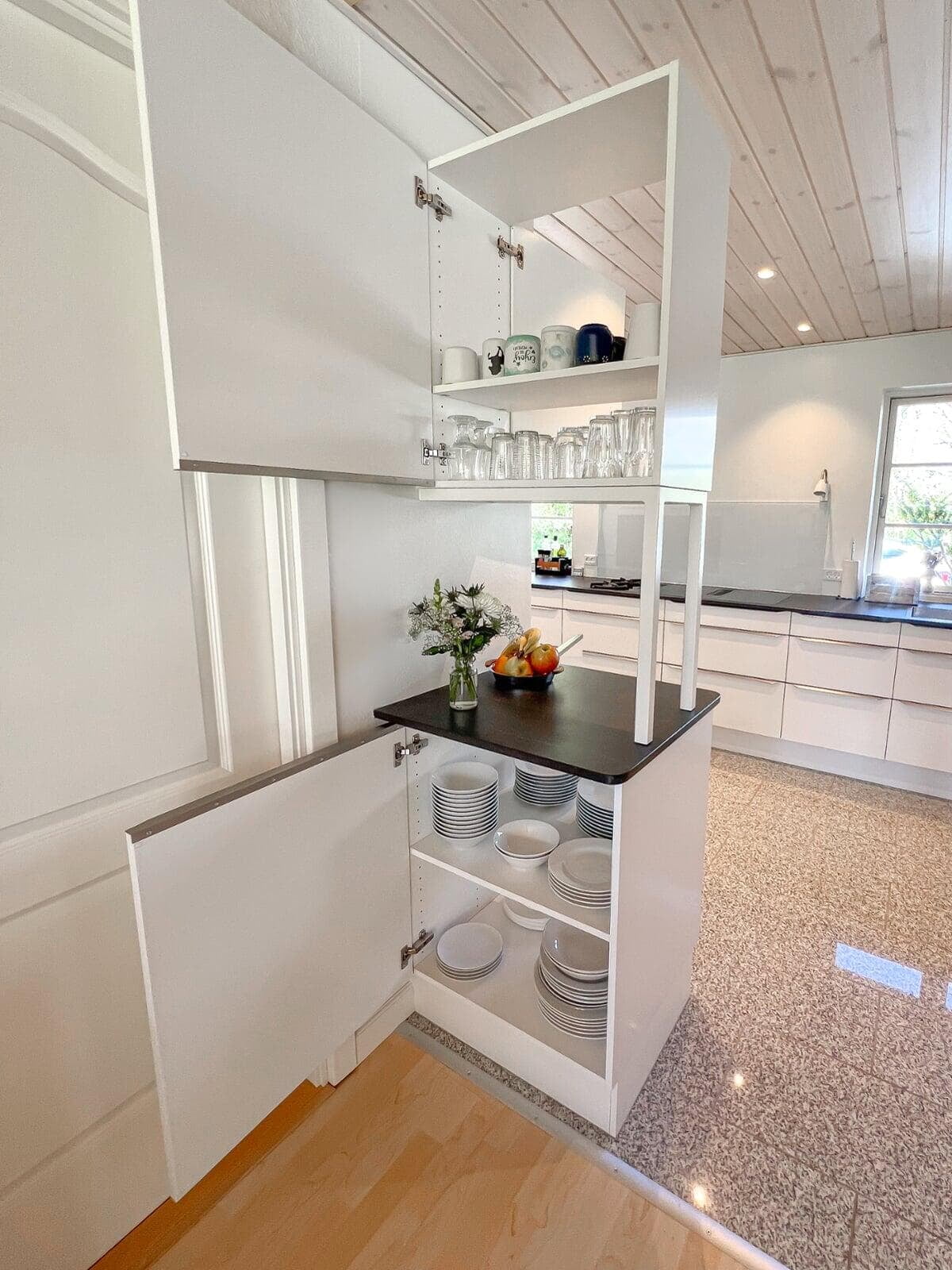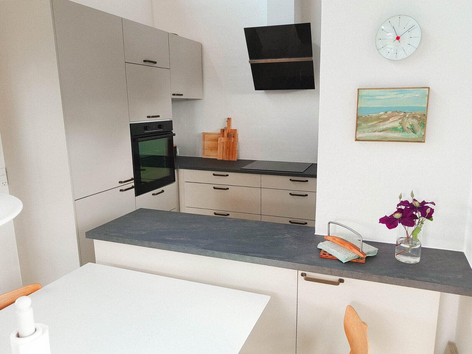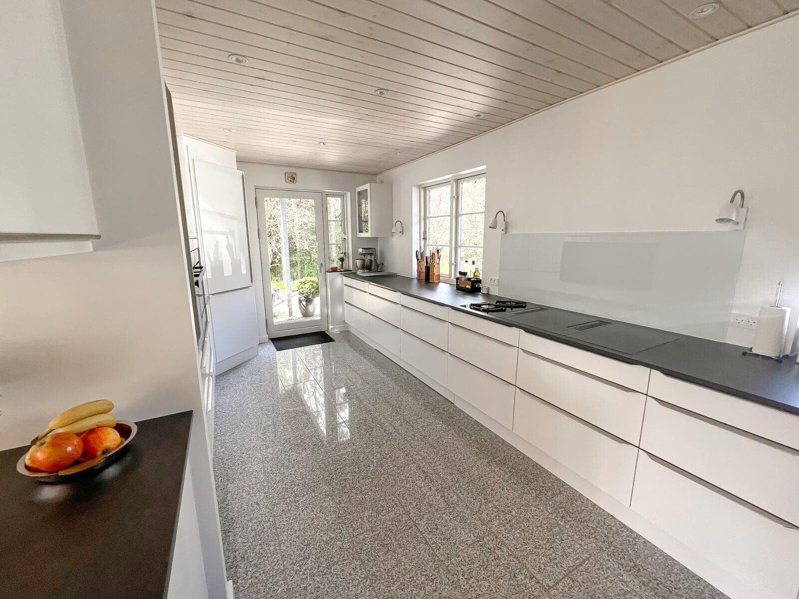 Med indbyggede overskabe og masser af skabsplads er der altid ryddeligt. Det gir’ mulighed for at dække op til buffet og invitere indenfor i det stilrene køkken. Stilen passer godt til husets arkitektur, og er videreført i tekøkkenet i kontorannekset, i arbejdsværelset og i de to badeværelser.