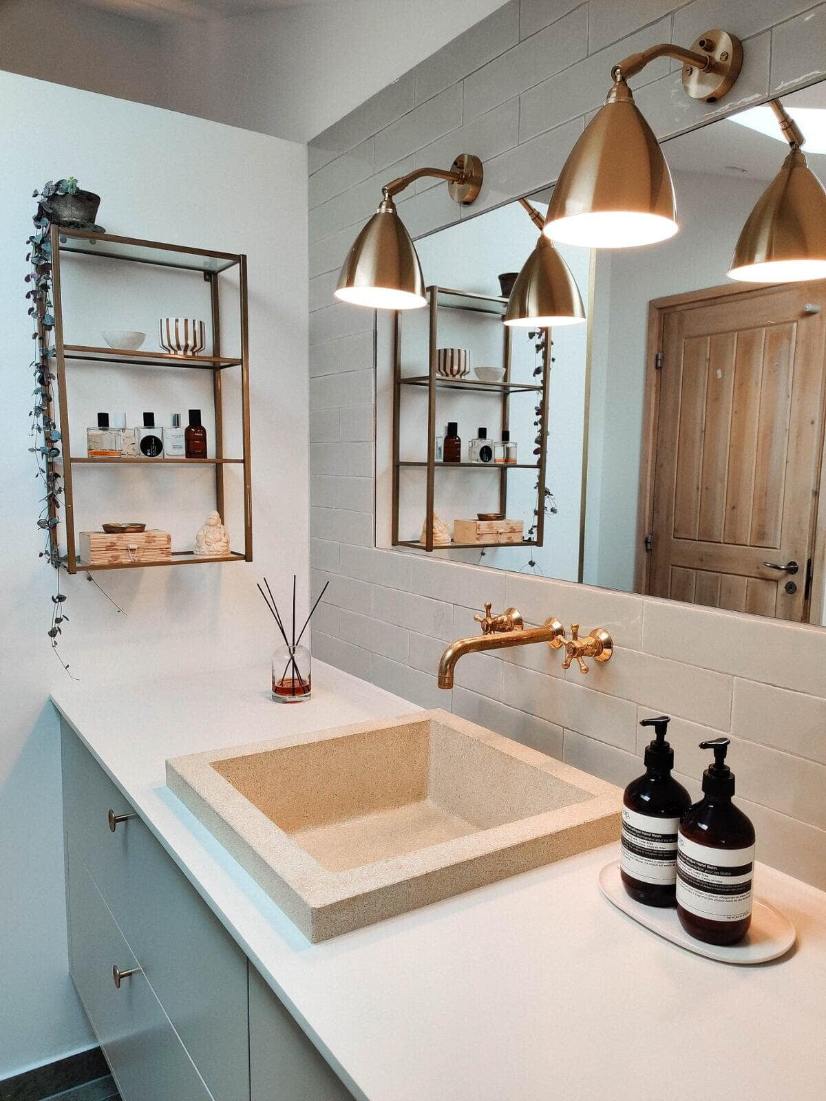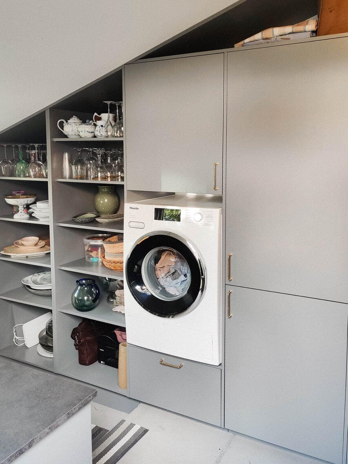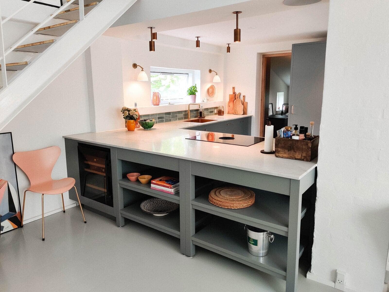 De åbne reoler gør det let at sætte sit eget præg på indretningen. Den flotte stil fortsætter i bryggerset, hvor pladsen er udnyttet optimalt, og skabene er tilpasset niveauforskellen og de skrå lofter. Samme stil ses på badeværelset, hvor design- og materialevalg tog udgangspunkt i terrazzo-vasken.