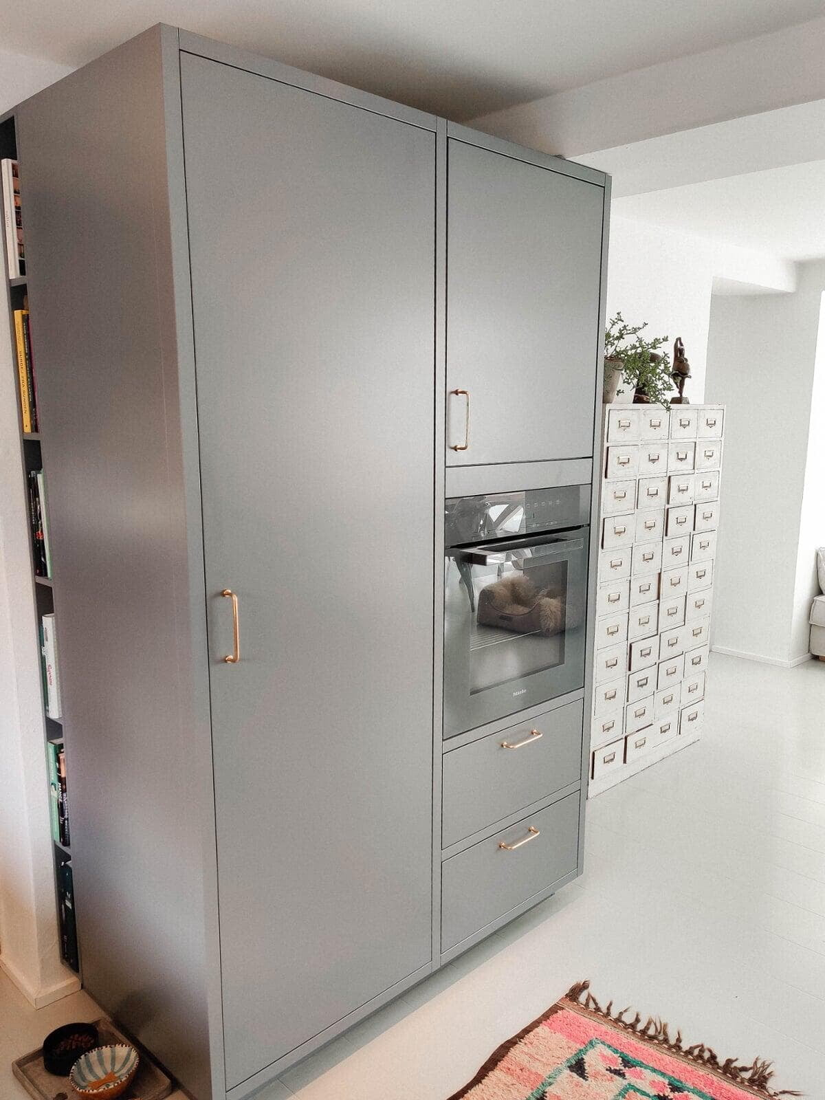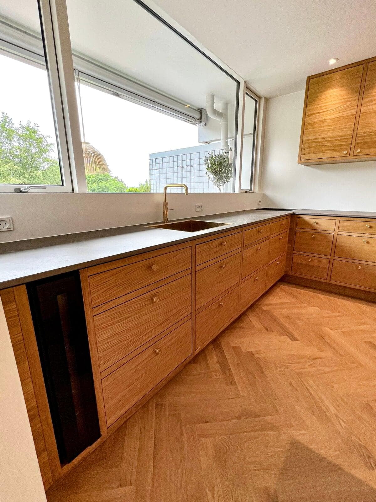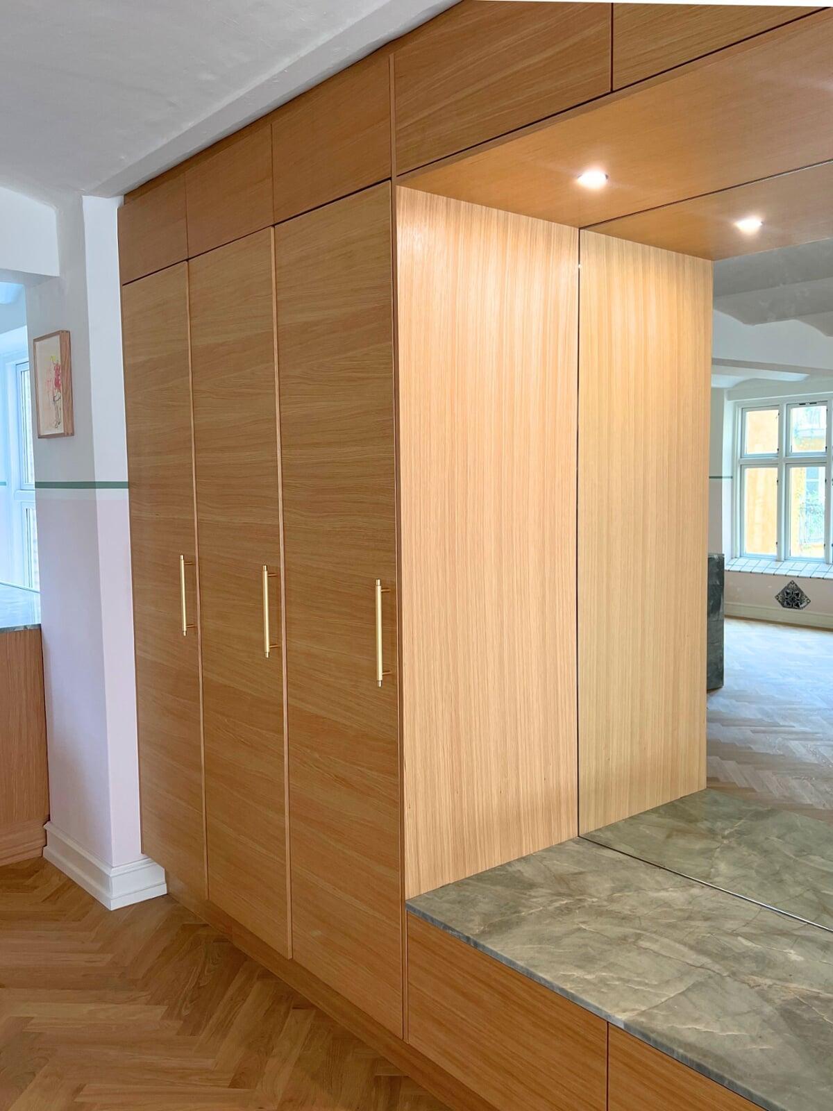 For at skabe sammenhæng, valgte vi 30 mm lister til at indramme skabe og skuffer i alle rum – det er blevet så flot. Køkkenet i eg er med håndlavet vask i massiv messing og Quooker i messing, og der blev plads til et indbygget vinskab på blot 15 cm – smart. Tak for god sparring. Familien i Holte.