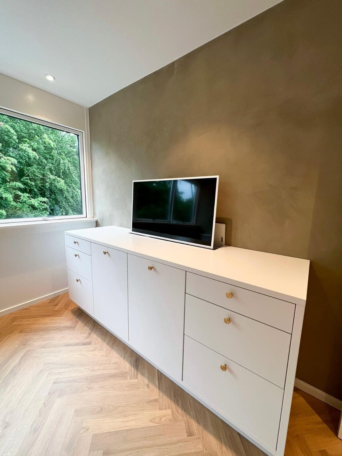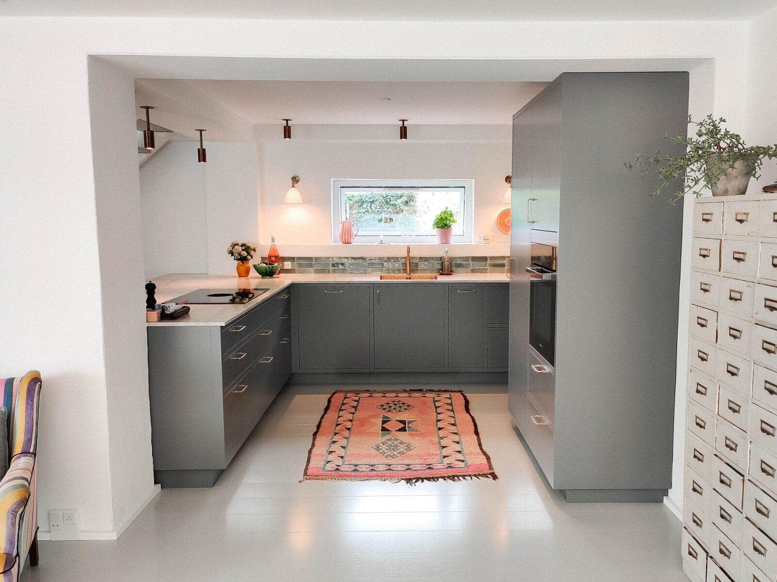 Køkkenet breder sig nu over flere kvadratmetre, hvor overskabene er erstattet af højskabe, der udnytter pladsen bedre. Den flotte vægfarve og greb mv. i messing giver et varmt modspil til det elegante hvide køkken. Bemærk stænkpladen i glas, der har fået samme farve som væggen. Nanna og Claus, Farum