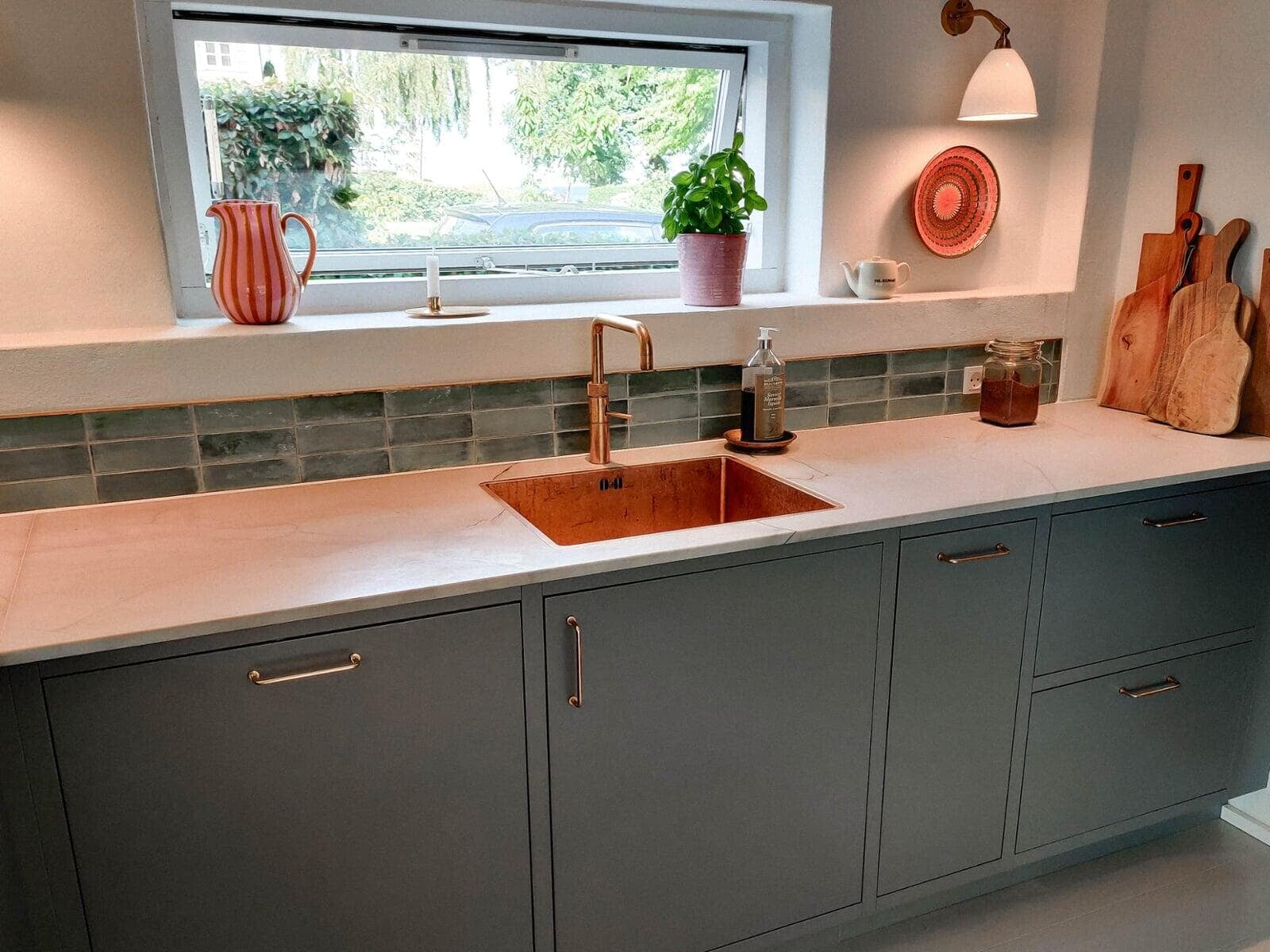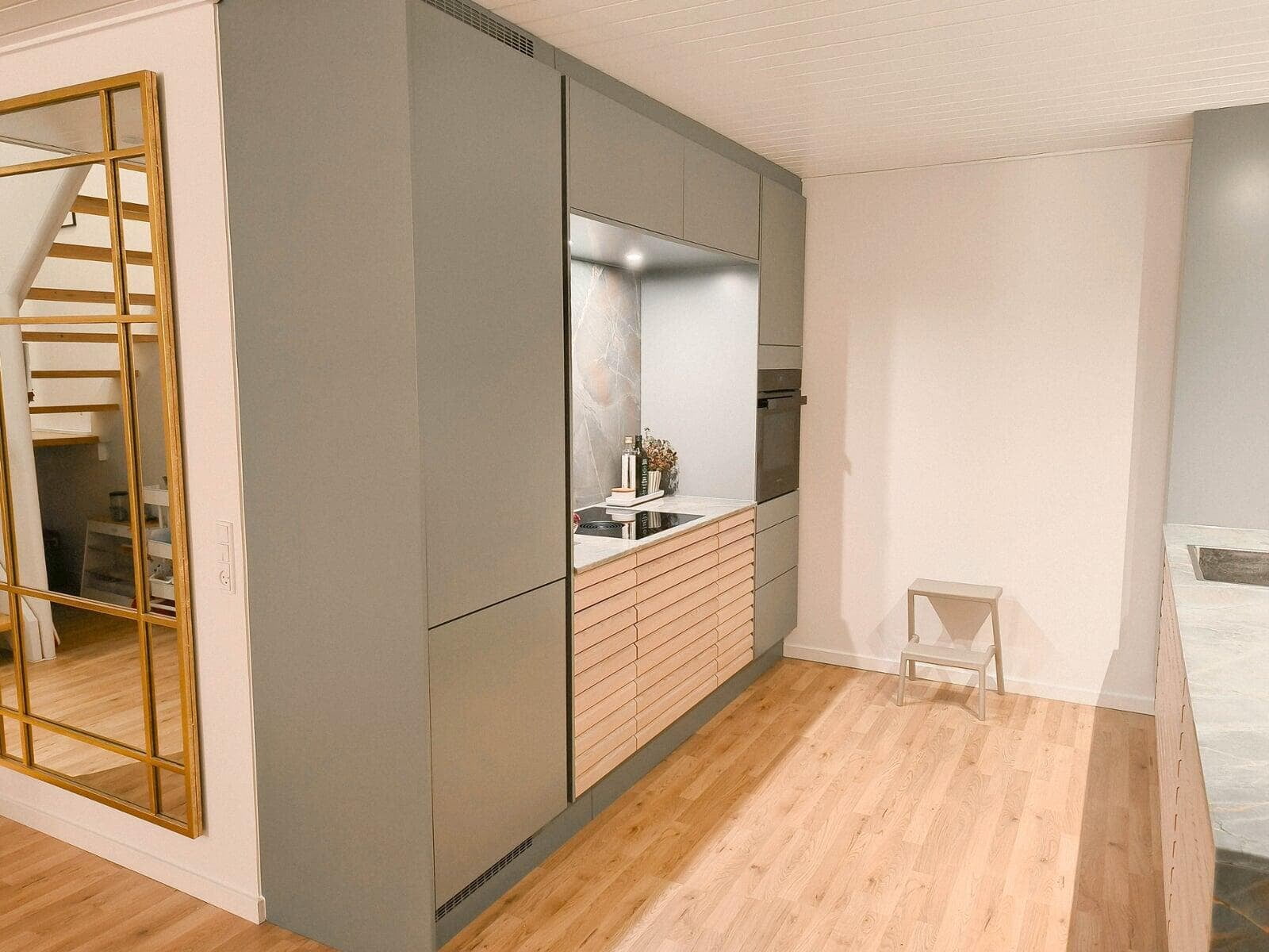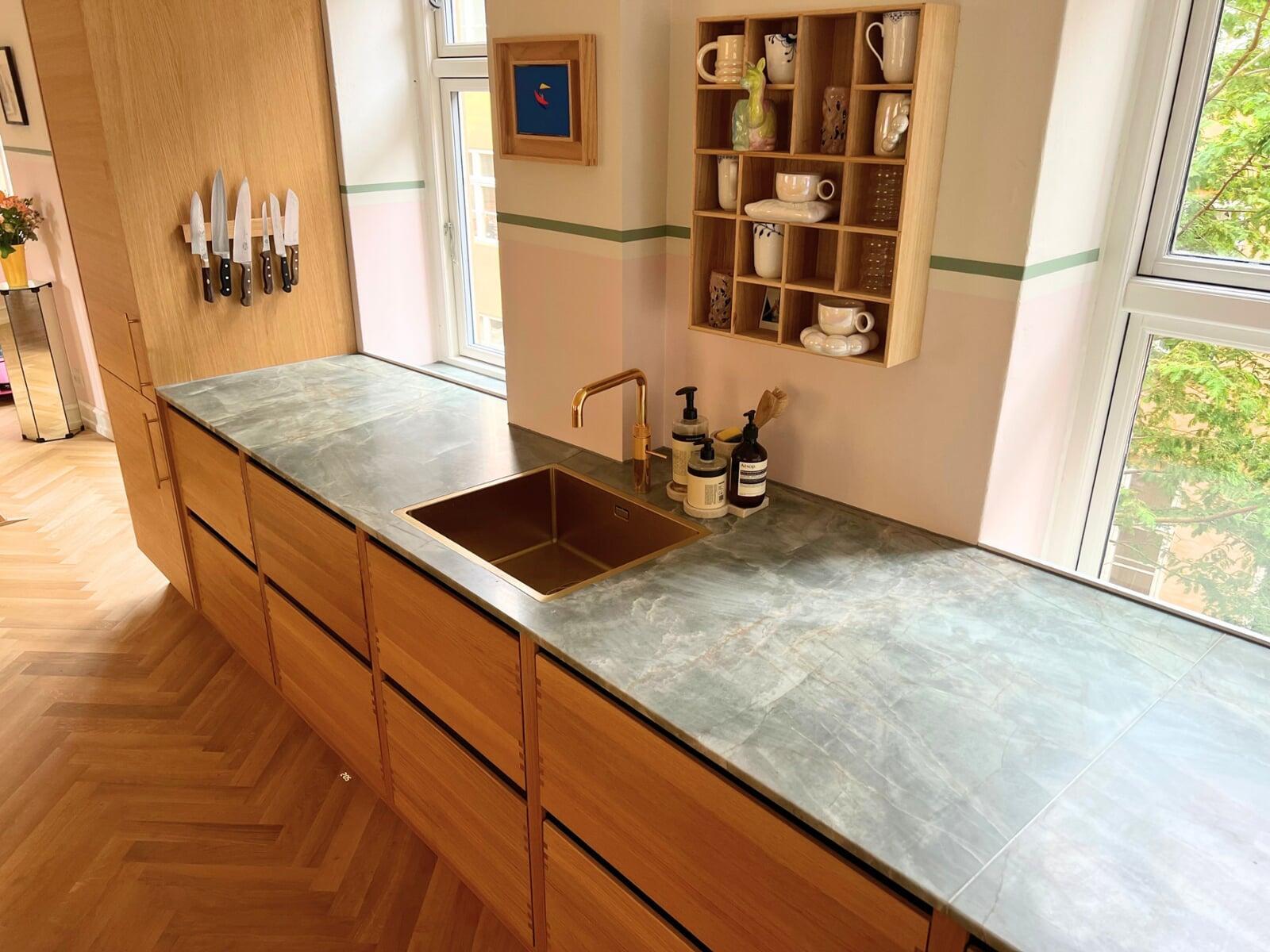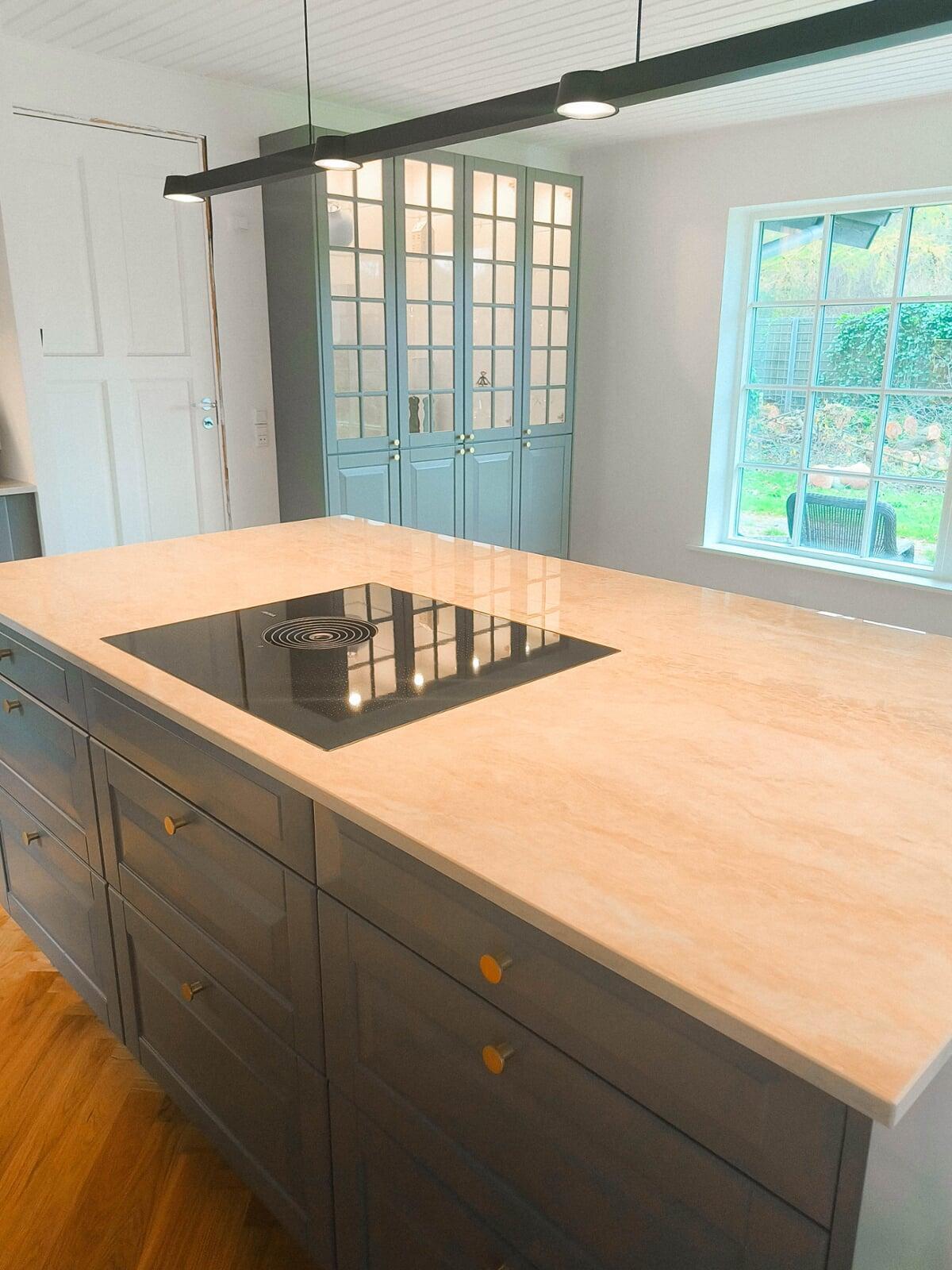 Drømmekøkkenet skulle være personligt, og det skulle være i varme farver og naturlige materialer. Valget faldt på et grebsfrit køkken i farven salvie kombineret med hvid eg, og med en smuk bordplade i natursten, som også er brugt som stænkpanel i kogenichen og forenden af skabsrækken.