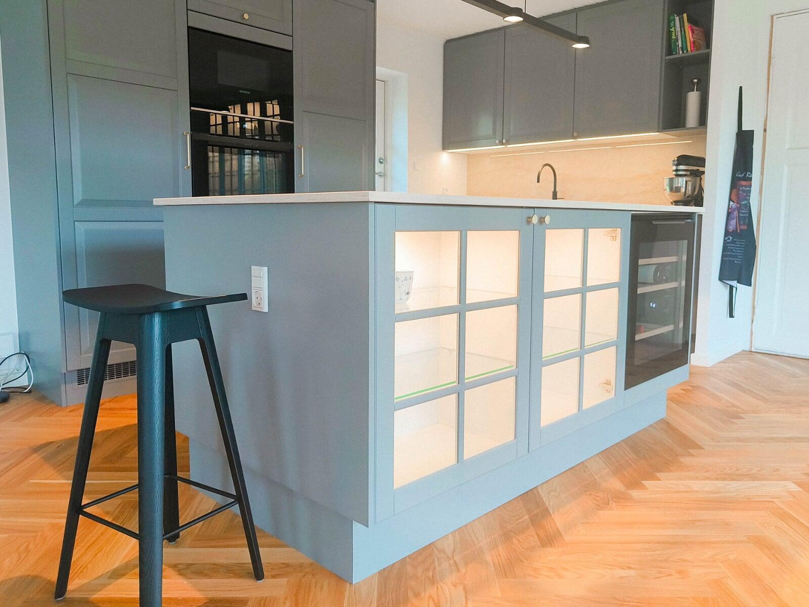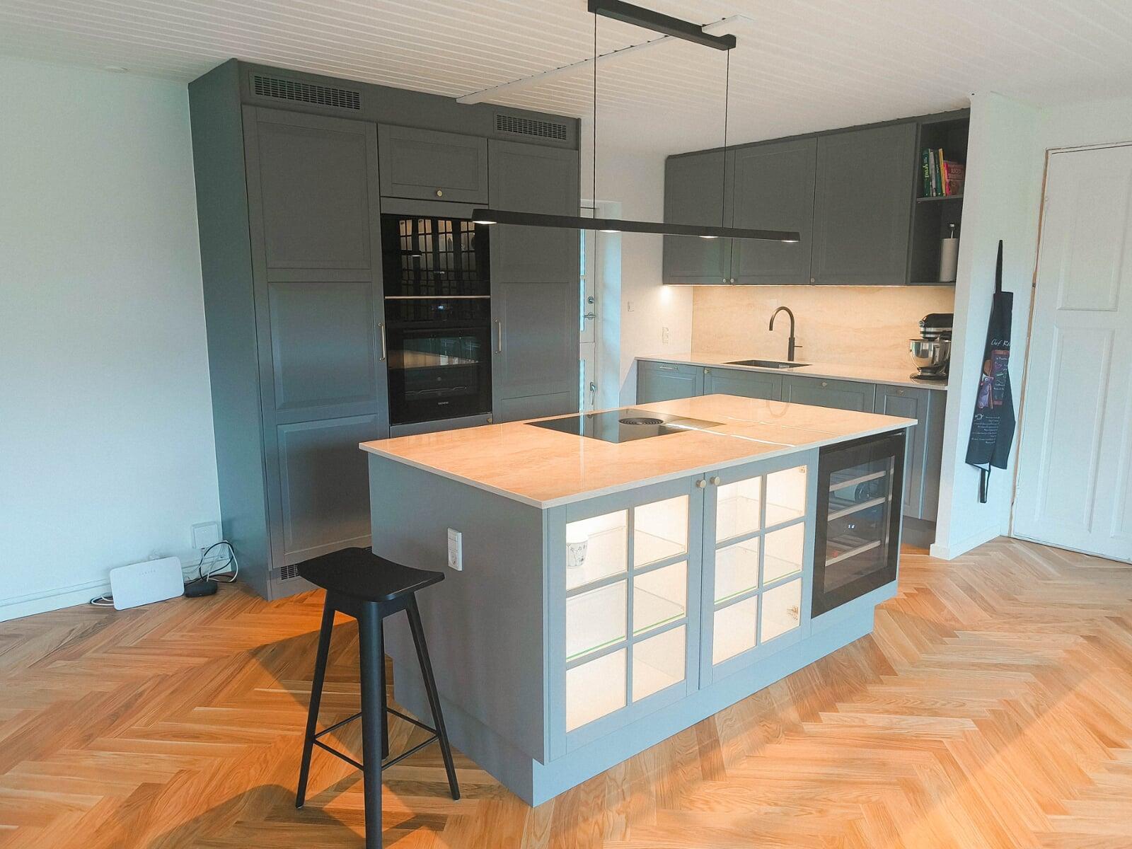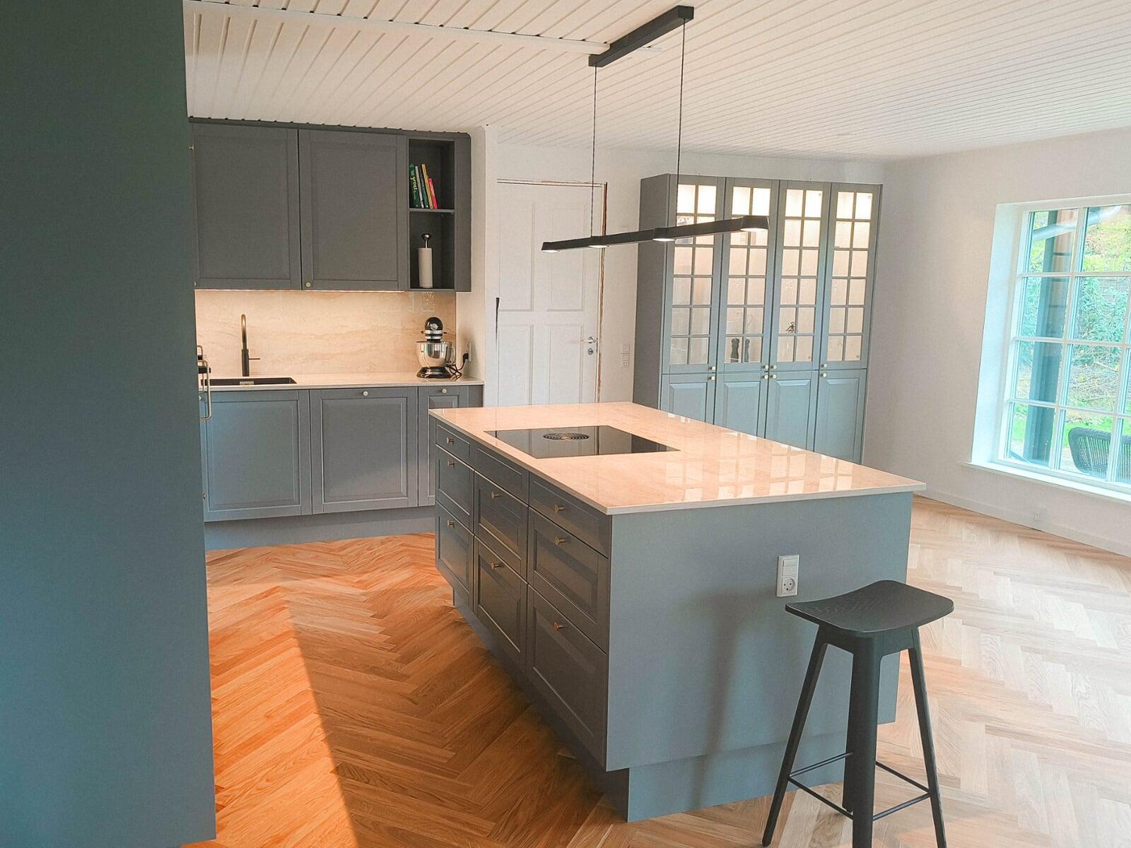 Køkkenet er åbnet op og integreret i alrummet. Klassiske grå fyldningslåger, stenplader og messingdetaljer skaber et stilfuldt udtryk. Vitrineskabe med lys tilføjer stemning, og en quartzite stenplade bag vasken kombinerer æstetik og funktionalitet. Model: Nordic Søsten med Tulip-greb.
