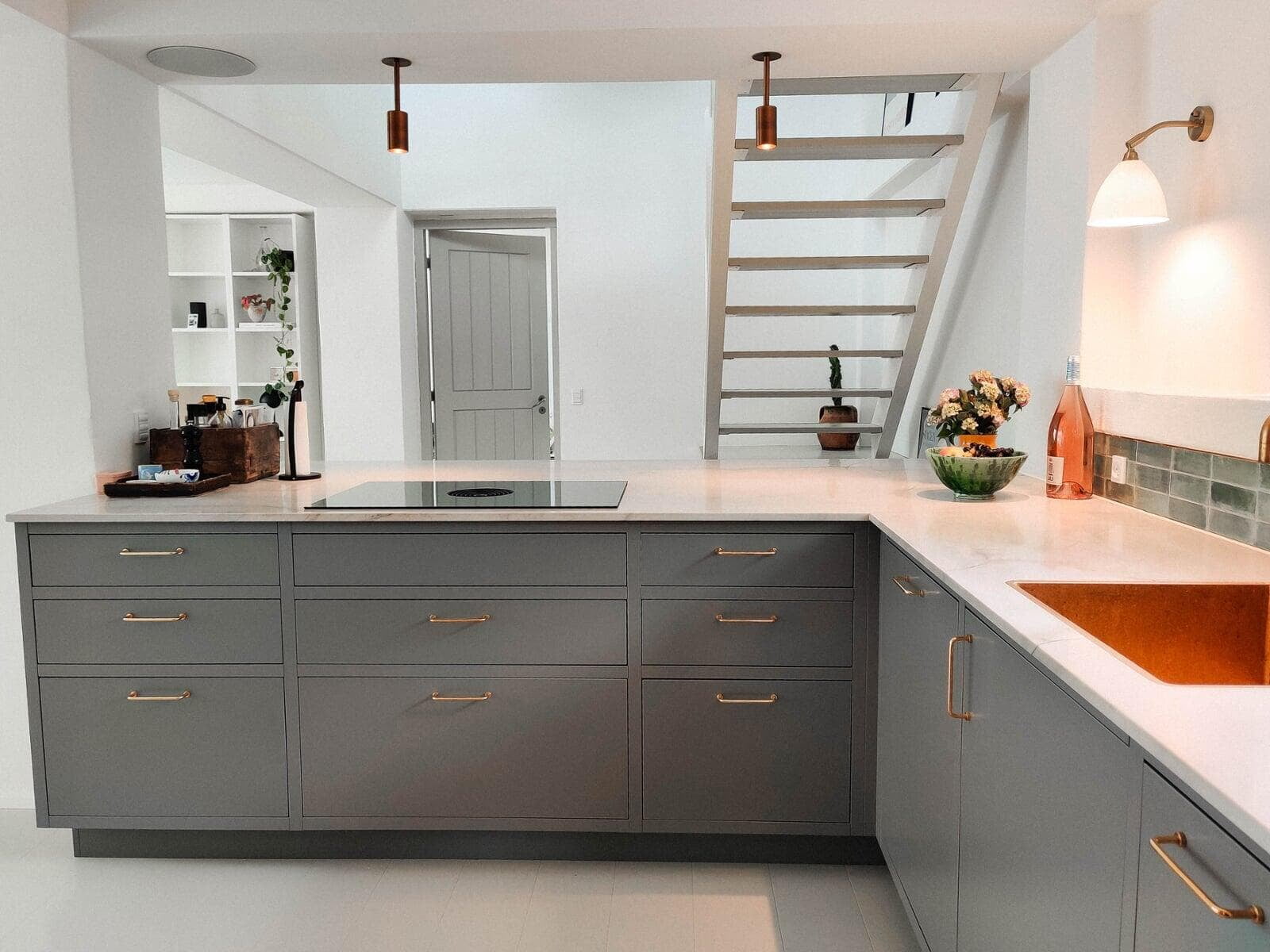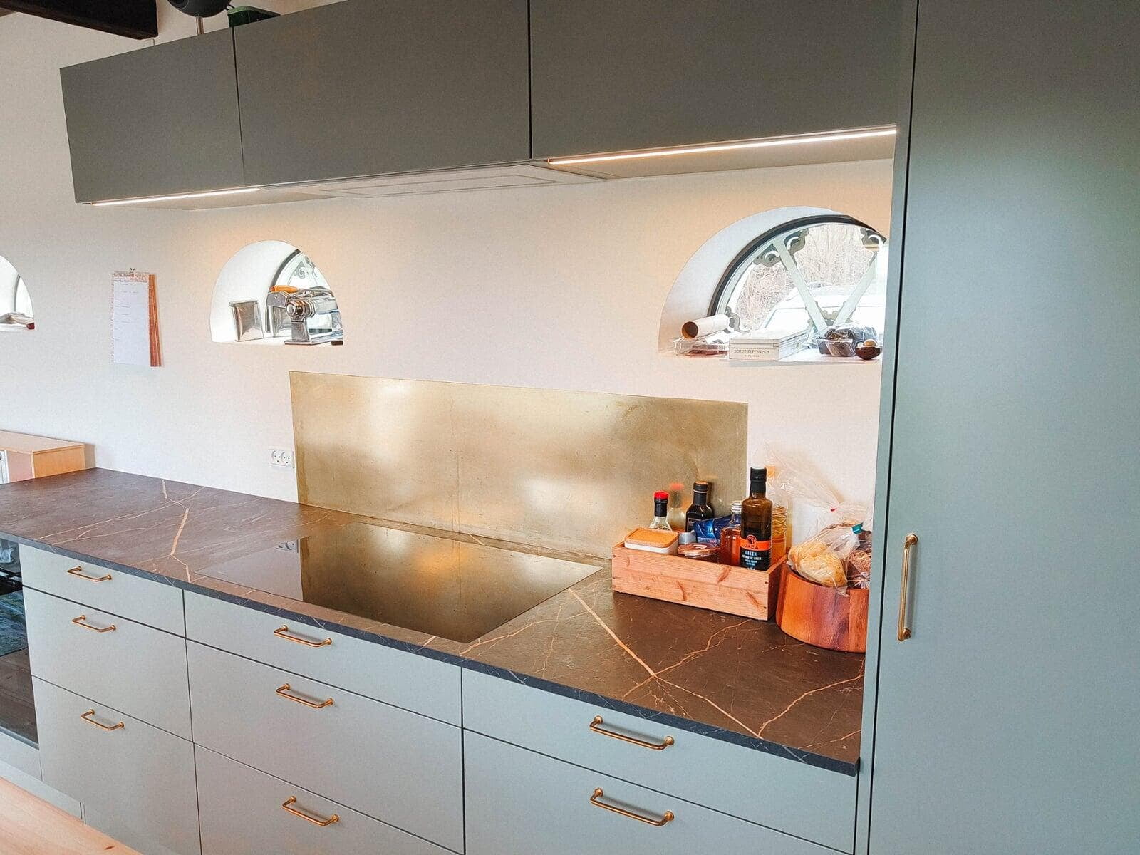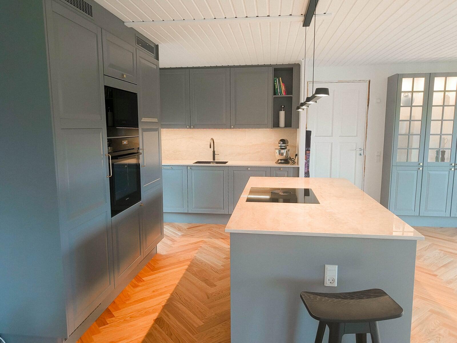 Køkkenet er åbnet op og integreret i alrummet. Klassiske grå fyldningslåger, stenplader og messingdetaljer skaber et stilfuldt udtryk. Vitrineskabe med lys tilføjer stemning, og en quartzite stenplade bag vasken kombinerer æstetik og funktionalitet. Model: Nordic Søsten med Tulip-greb.