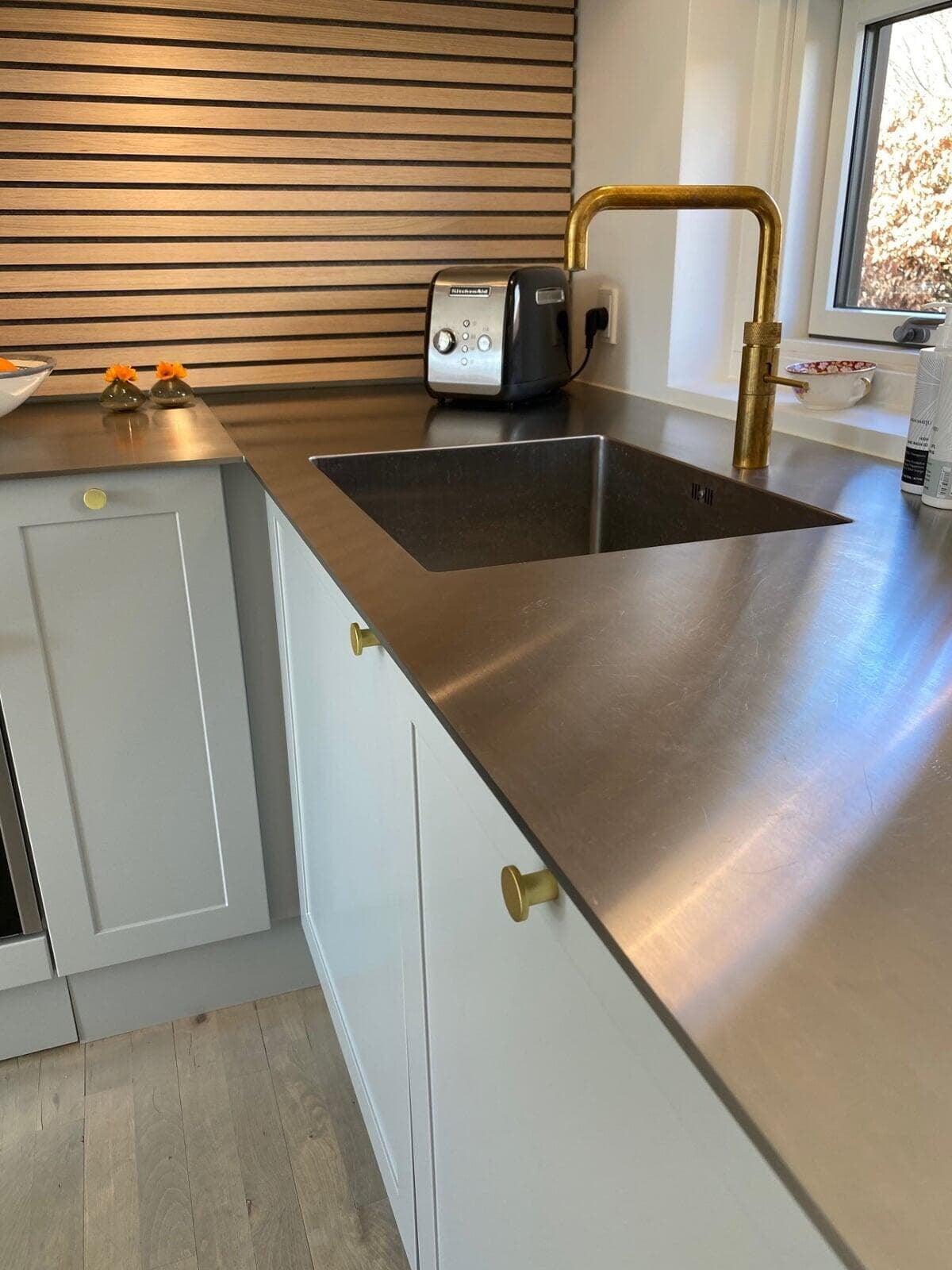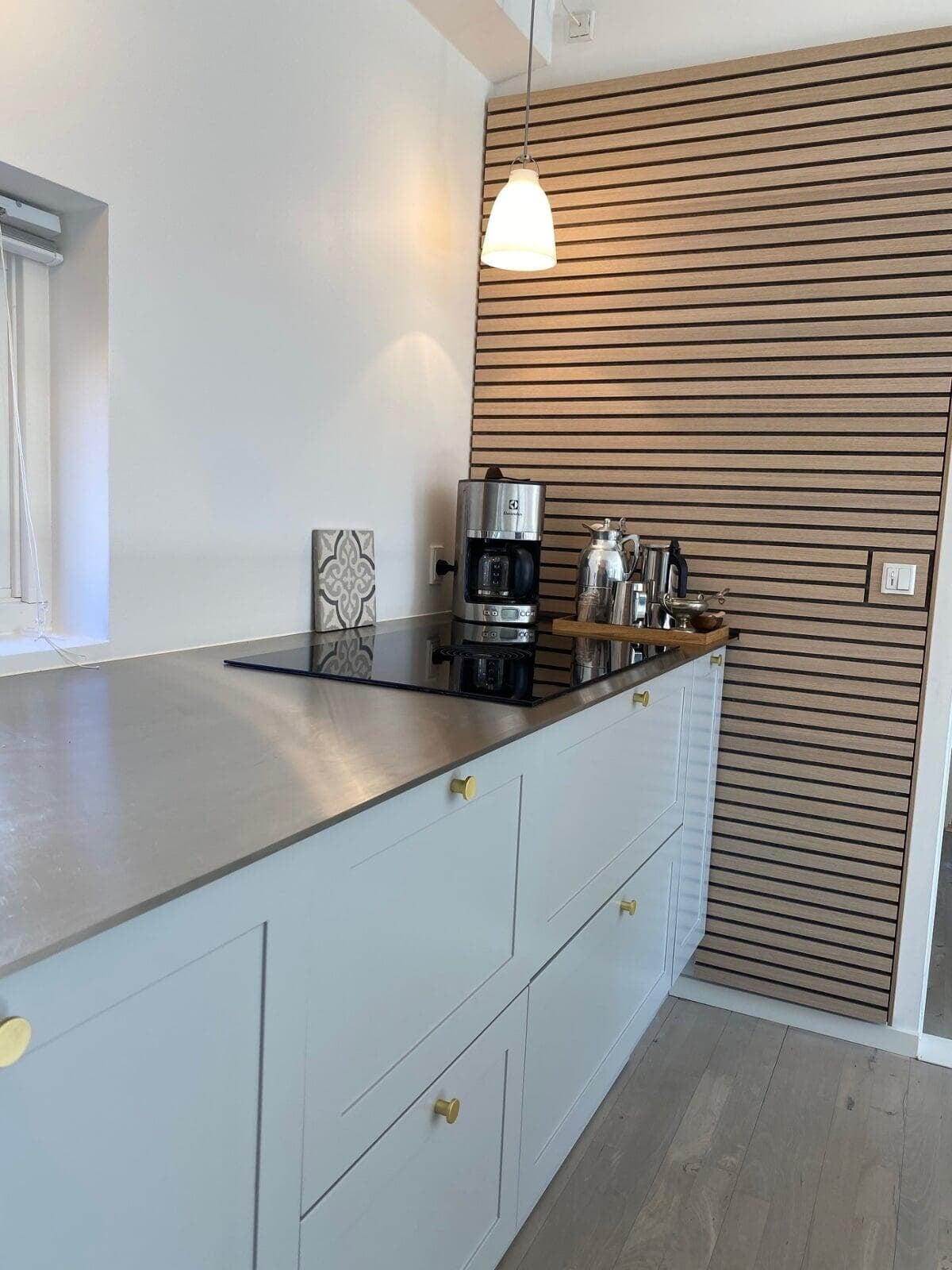 Det skulle være praktisk, og samtidig kan vi godt lide det rå look. Med en bordplade i stål sammen med armatur og greb i messing ramte vi præcis den stil, vi gik efter. Vi er også meget glade for kogepladen med indbygget udsugning, og akustikvæggene, som passer til stilen. Susanne og Verner, Græsted