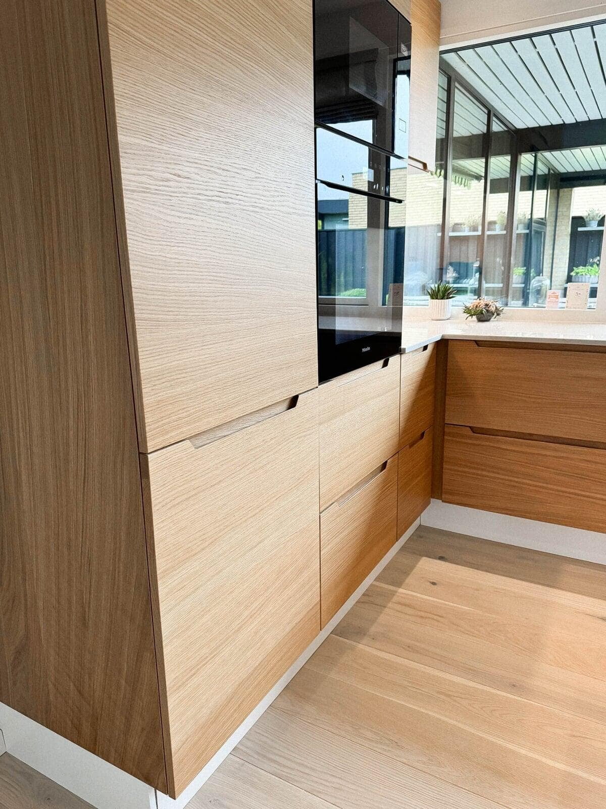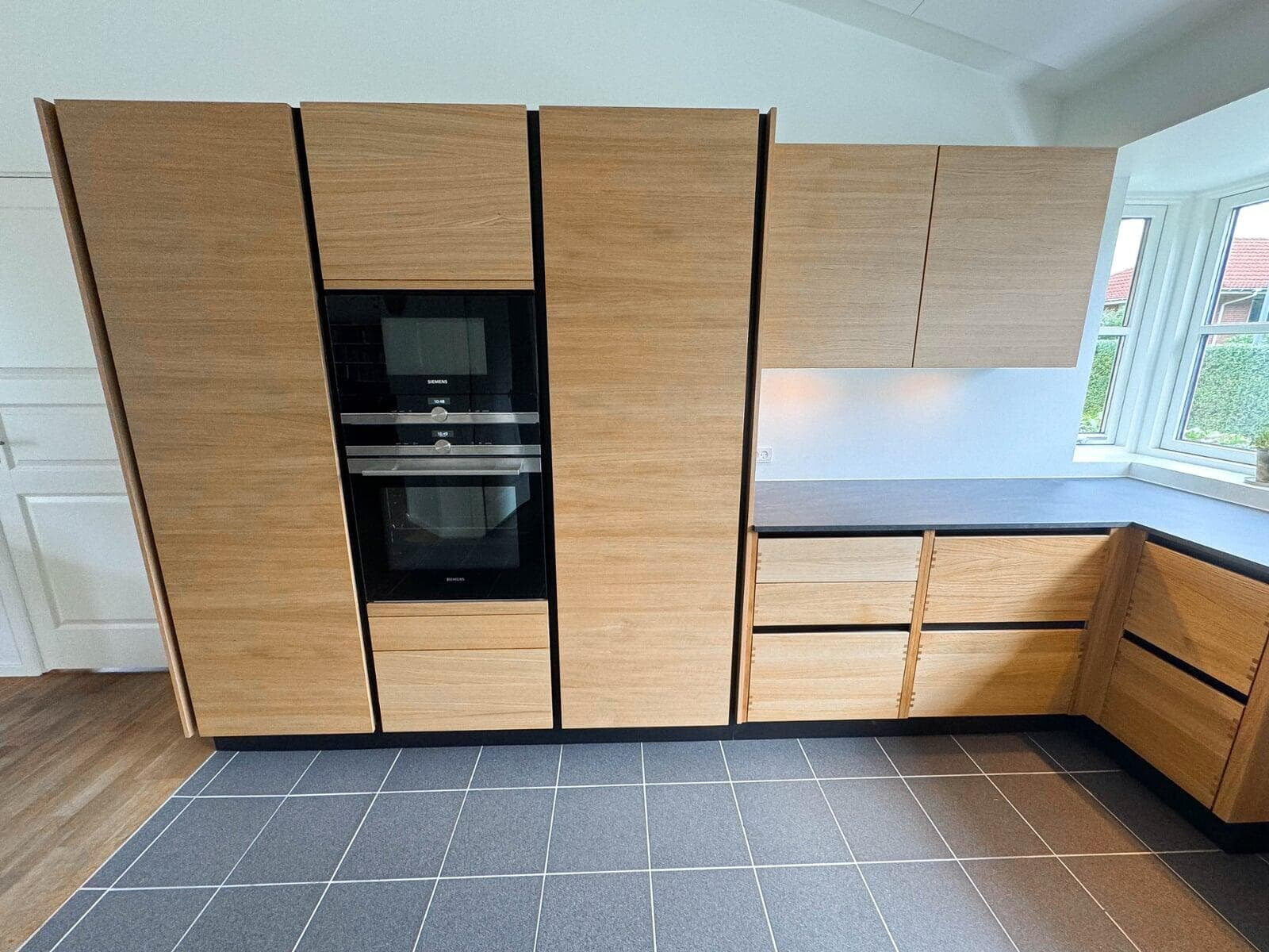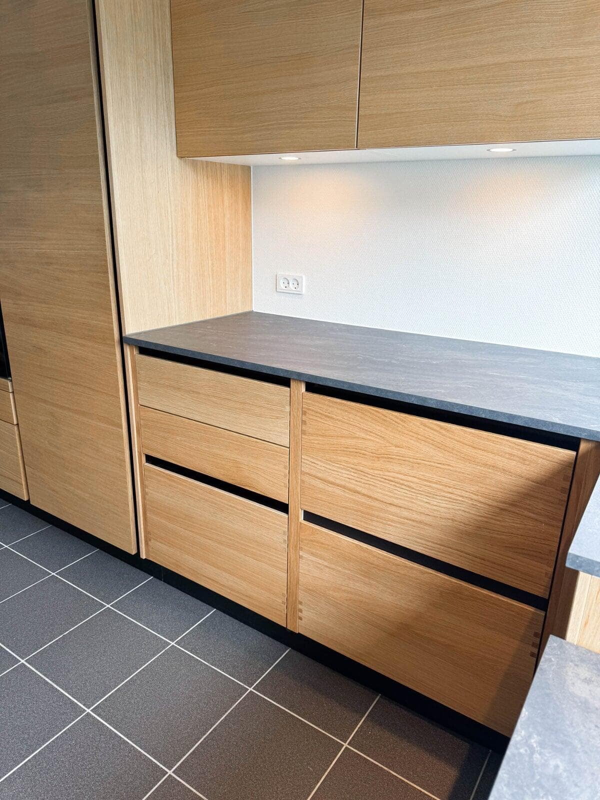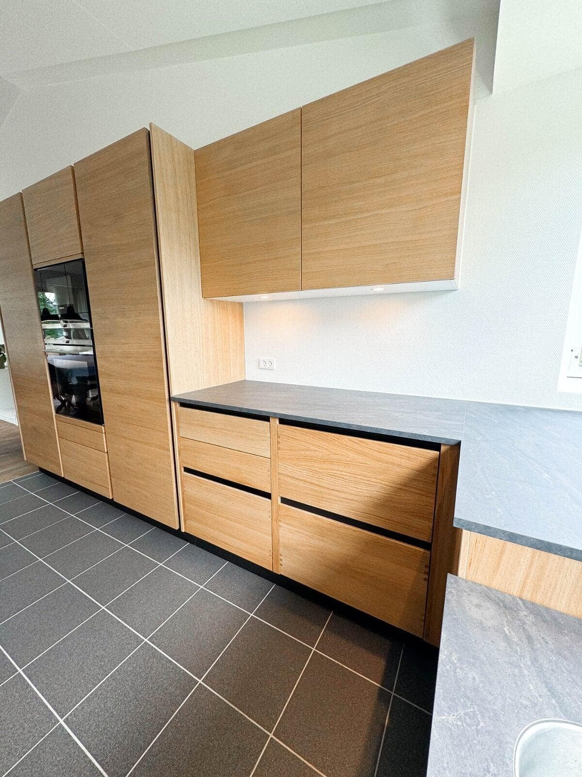 Kundens ønske om et moderne og funktionelt køkken blev opfyldt med vores Urban køkkenløsning i naturfarvet eg. Det skræddersyede design har integrerede frisider og træskuffer, som skaber et varmt og indbydende udtryk. Den polerede Quarzite-bordplade balancerer æstetik og holdbarhed.
