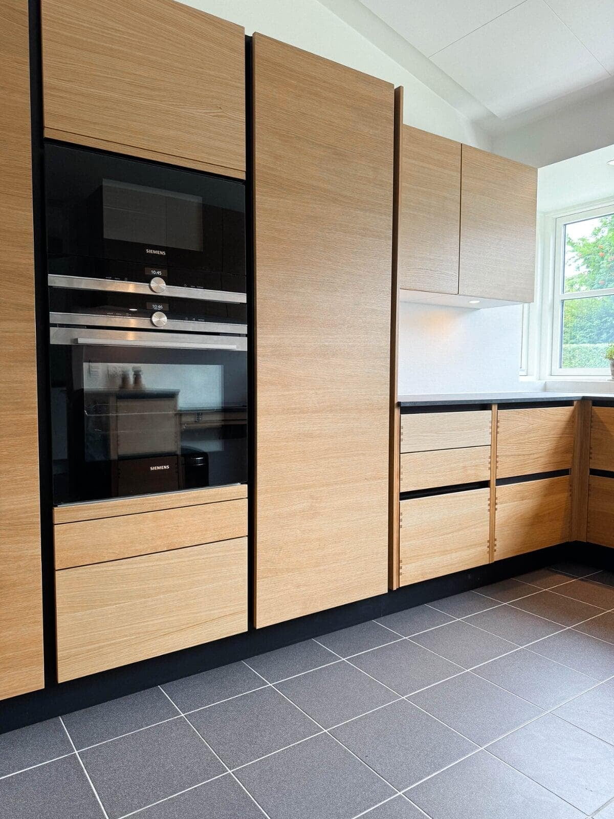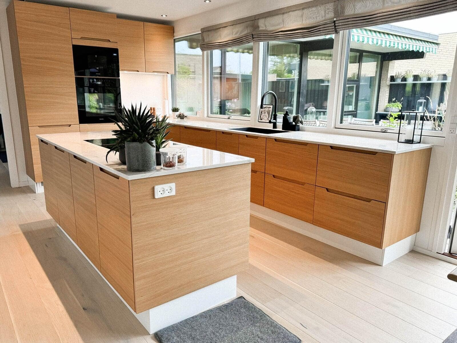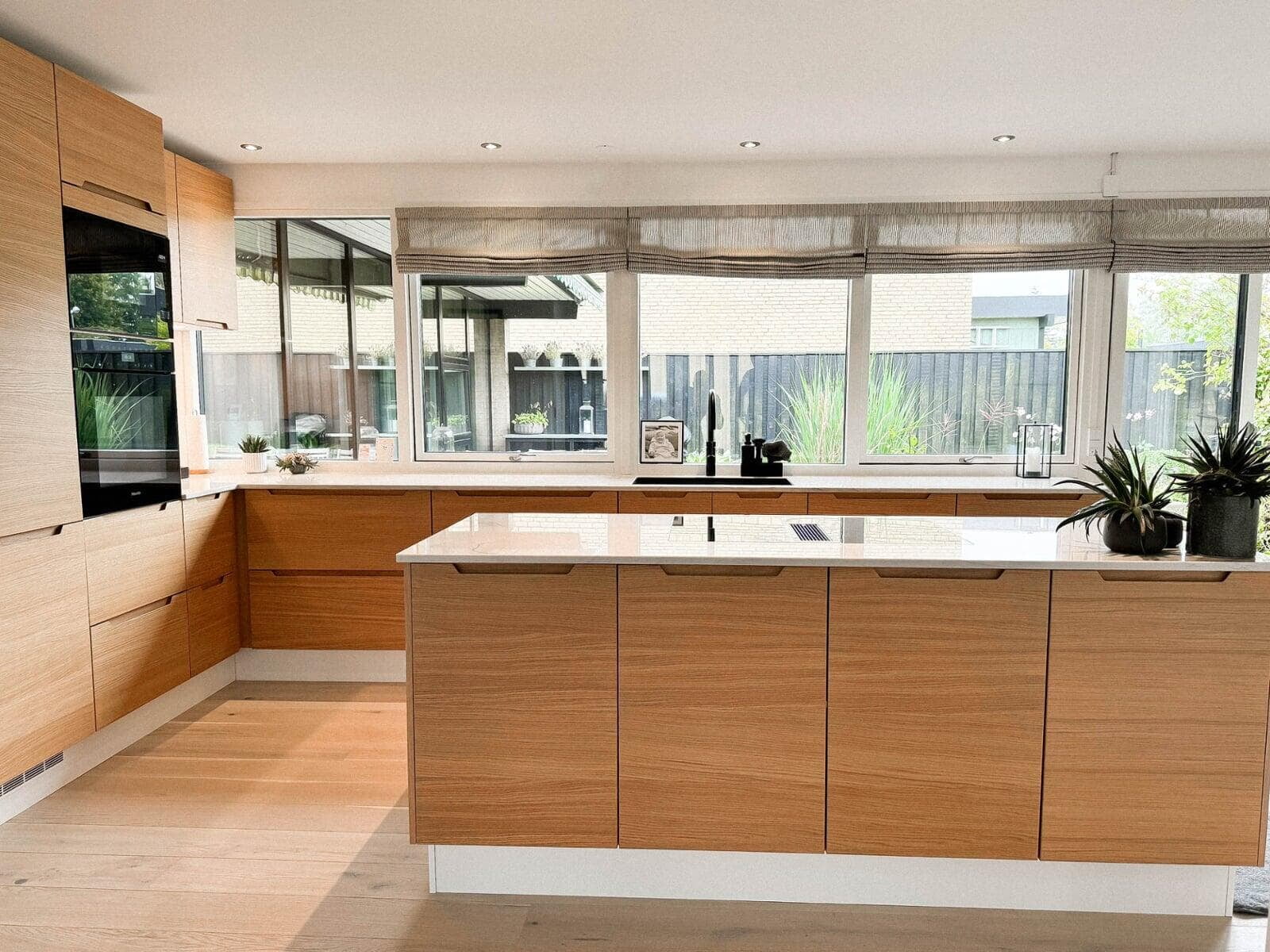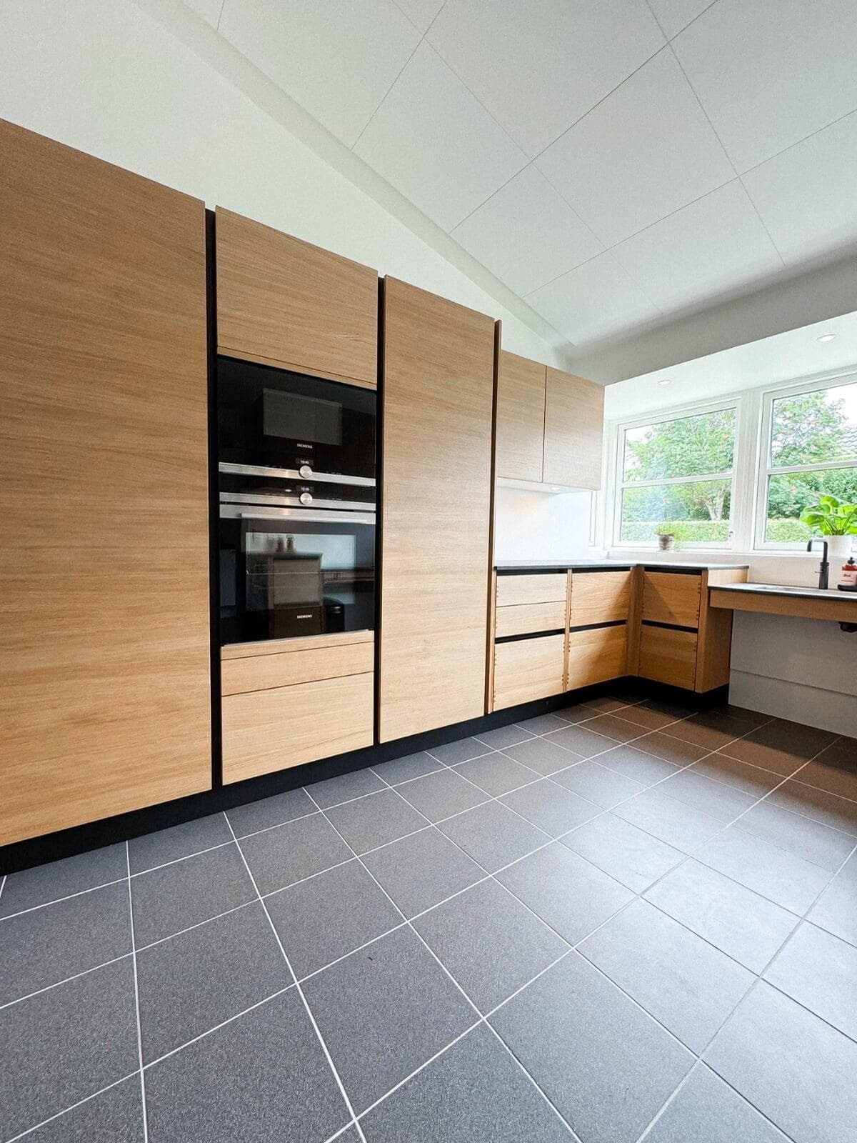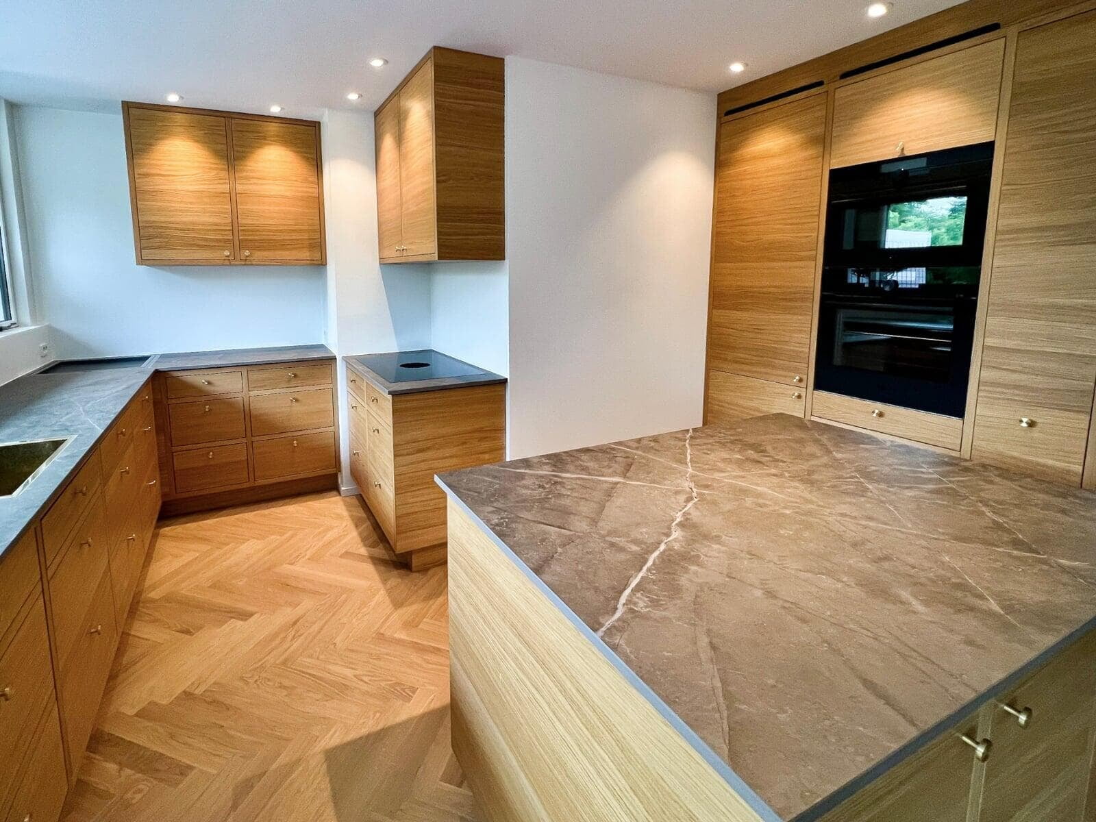 Kundens ønske om et moderne og funktionelt køkken blev opfyldt med vores Urban køkkenløsning i naturfarvet eg. Det skræddersyede design har integrerede frisider og træskuffer, som skaber et varmt og indbydende udtryk. Den polerede Quarzite-bordplade balancerer æstetik og holdbarhed.