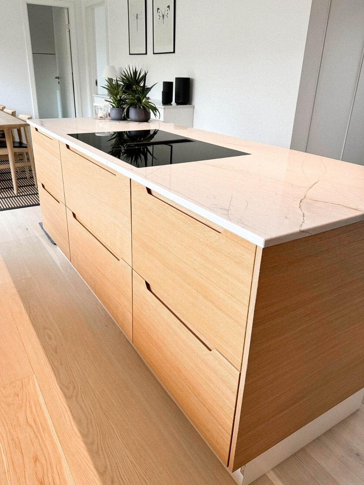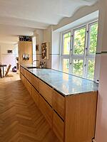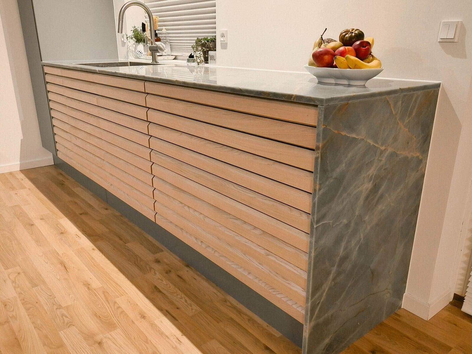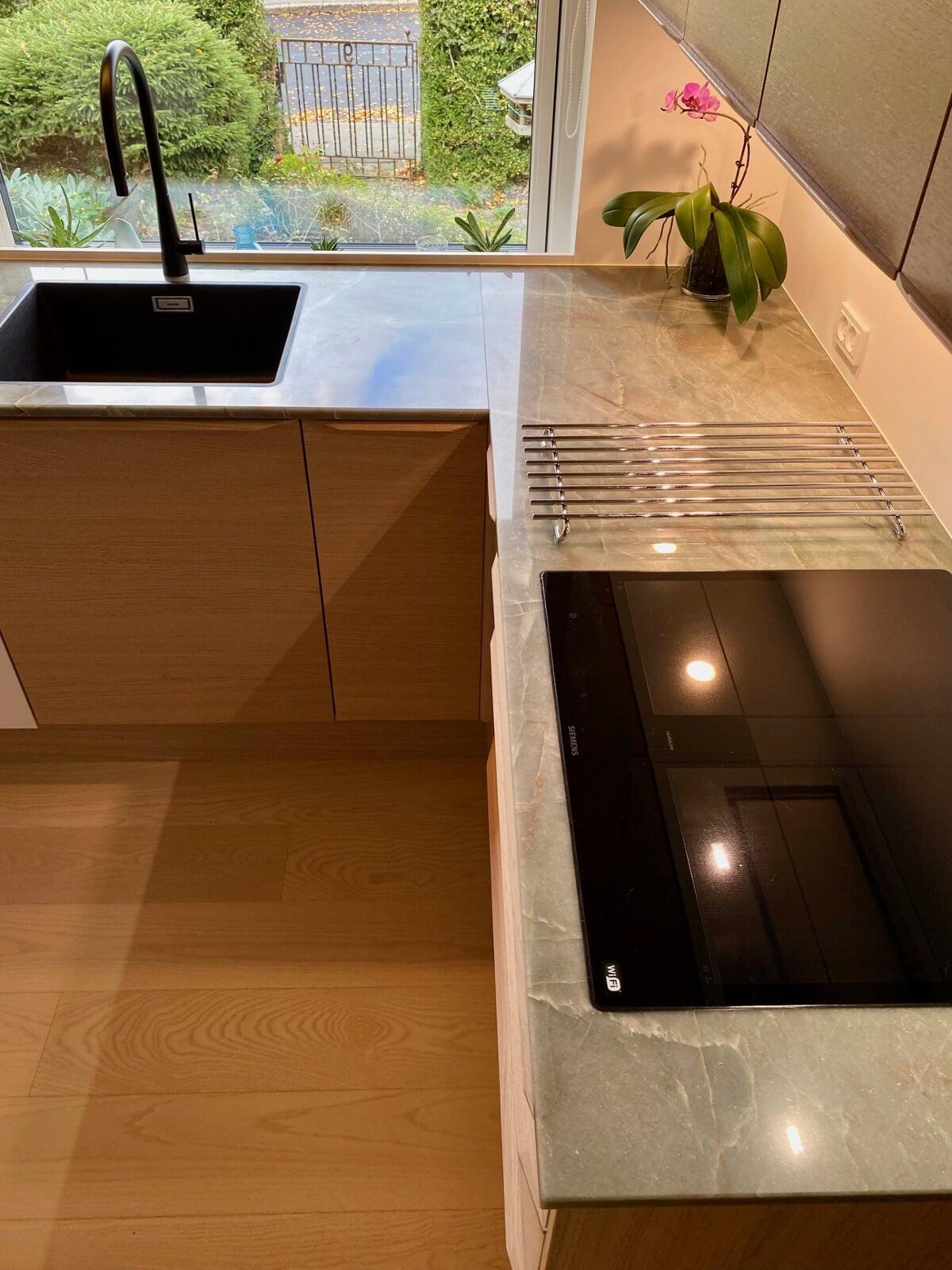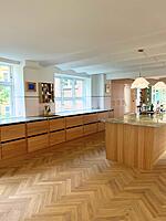 Ønsket var et mere lyst og venligt køkken. Med lamelfronter i eg natur kombineret med en bordplade i sten – Quartzite Taj Mahal – har køkkenet fået præcis det udtryk, der var ønsket. Familien har selv udvalgt råstenen til bordpladen, på fabrikken. Vi er meget tilfredse. Familien i Hillerød.