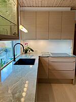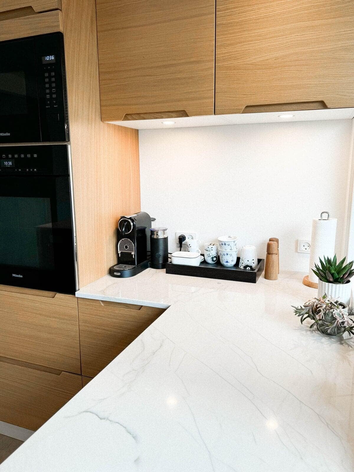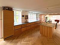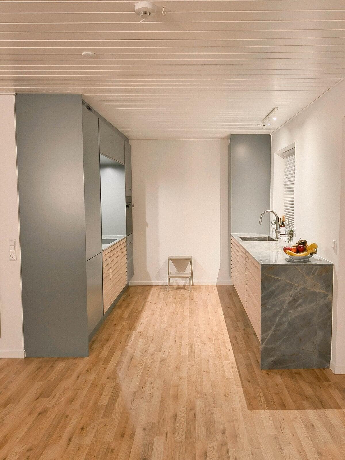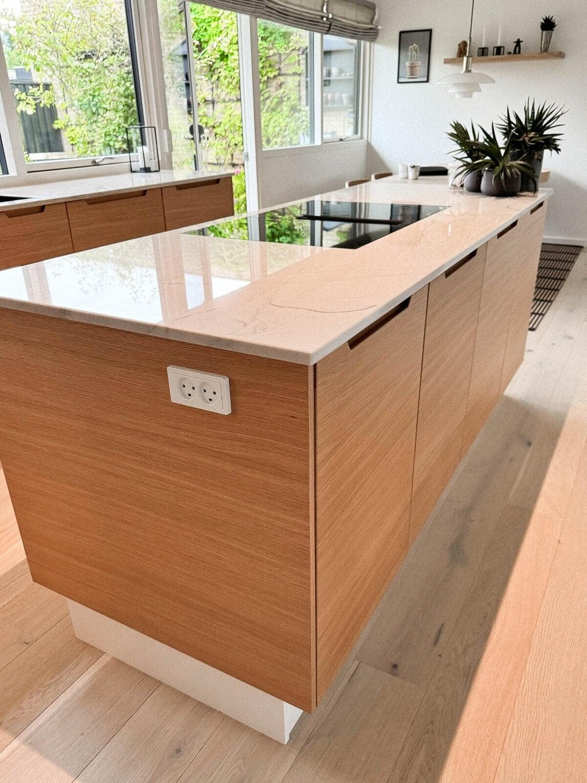 Ønsket var et mere lyst og venligt køkken. Med lamelfronter i eg natur kombineret med en bordplade i sten – Quartzite Taj Mahal – har køkkenet fået præcis det udtryk, der var ønsket. Familien har selv udvalgt råstenen til bordpladen, på fabrikken. Vi er meget tilfredse. Familien i Hillerød.