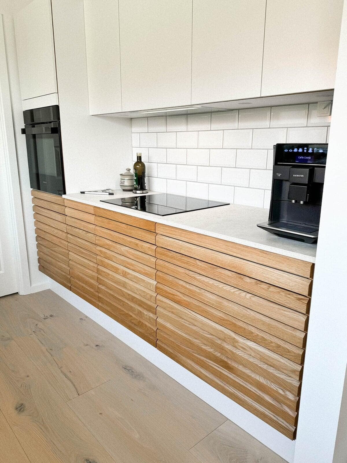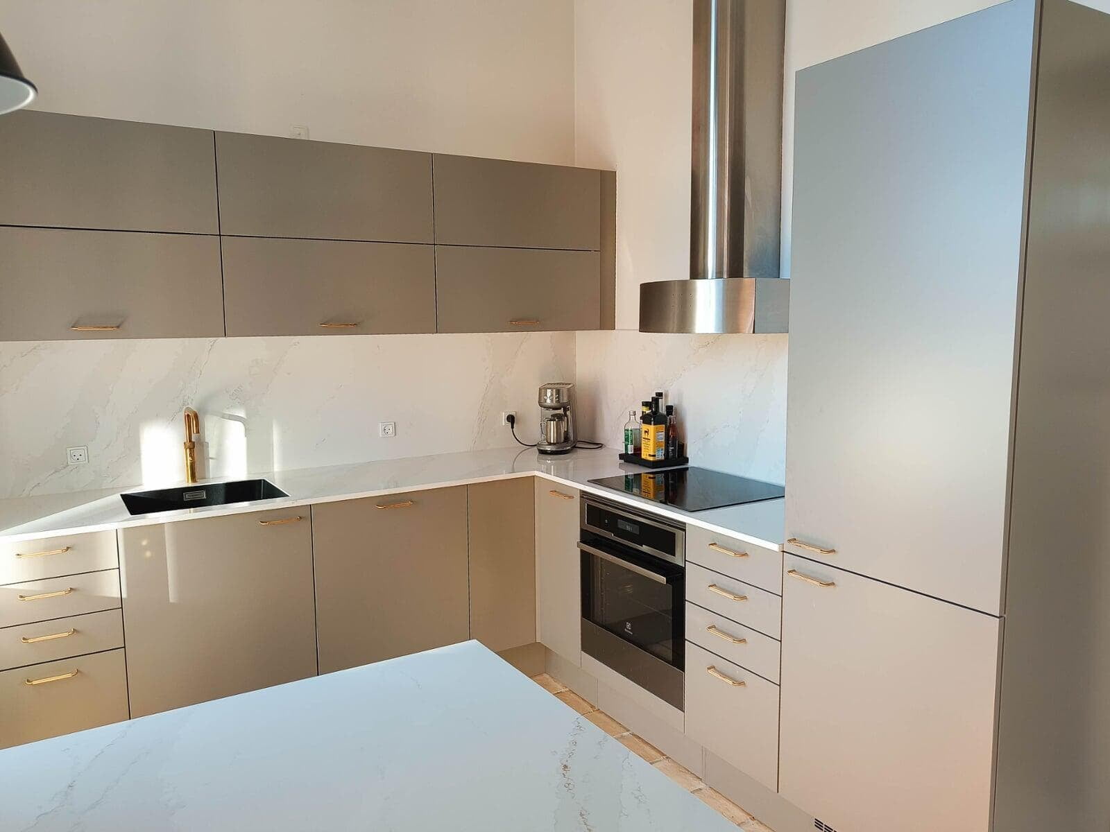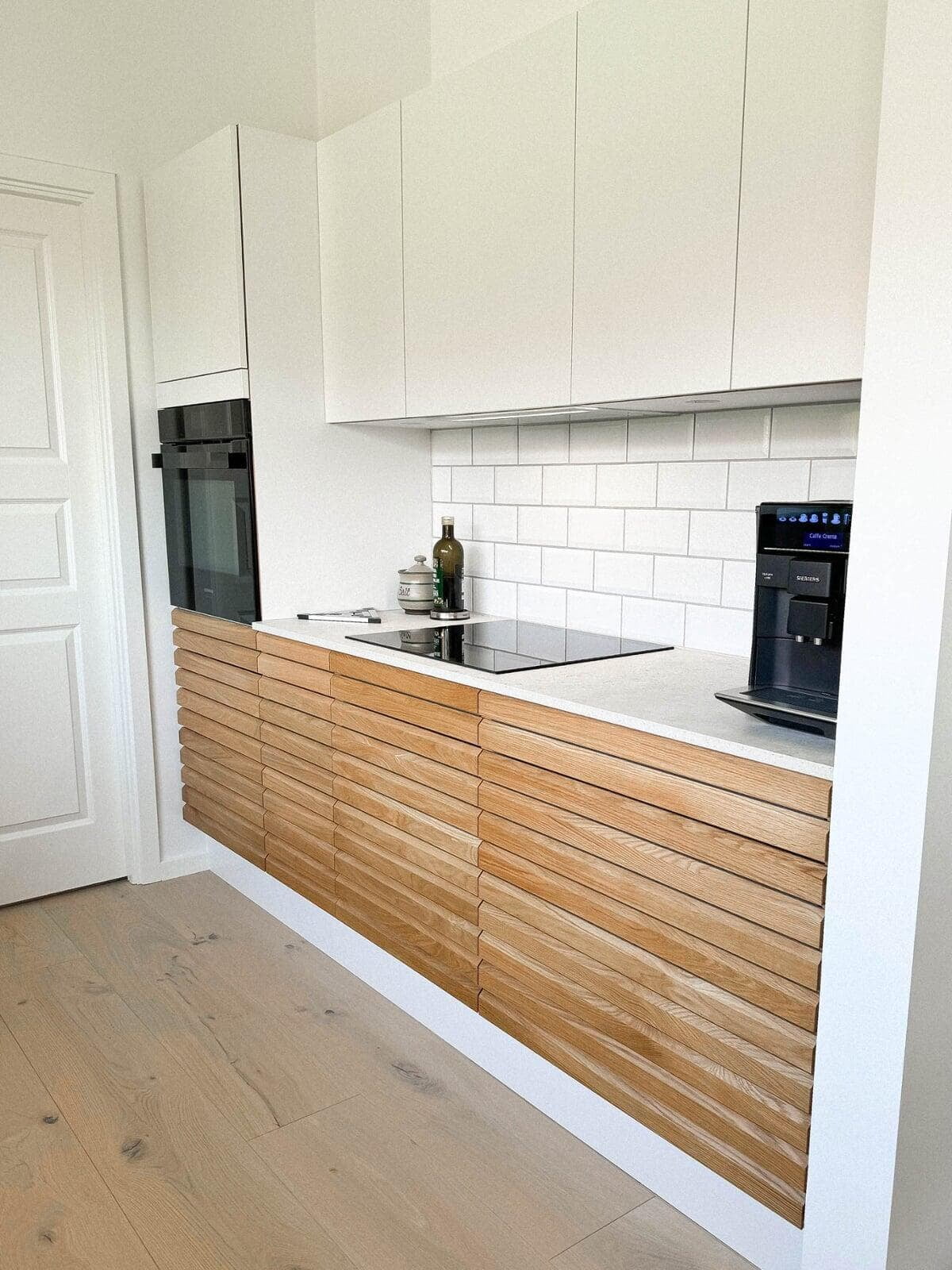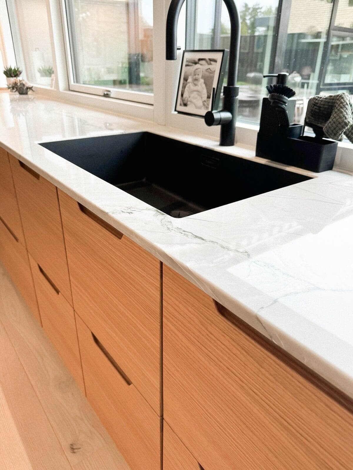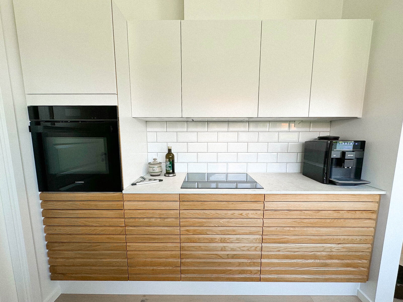 Der er netop afsluttet et spændende projekt hos et skønt par i Hillerød. Her var ønsket klart fra starten: minimalisme og varme materialer, hvor træ skulle spille en central rolle. Parret valgte vores Highline-model i den smukke farve Sand, som giver et roligt og tidløst udtryk. Som bordplade faldt valget på Corian Glacier White, der skaber en flot kontrast og et elegant helhedsindtryk.
