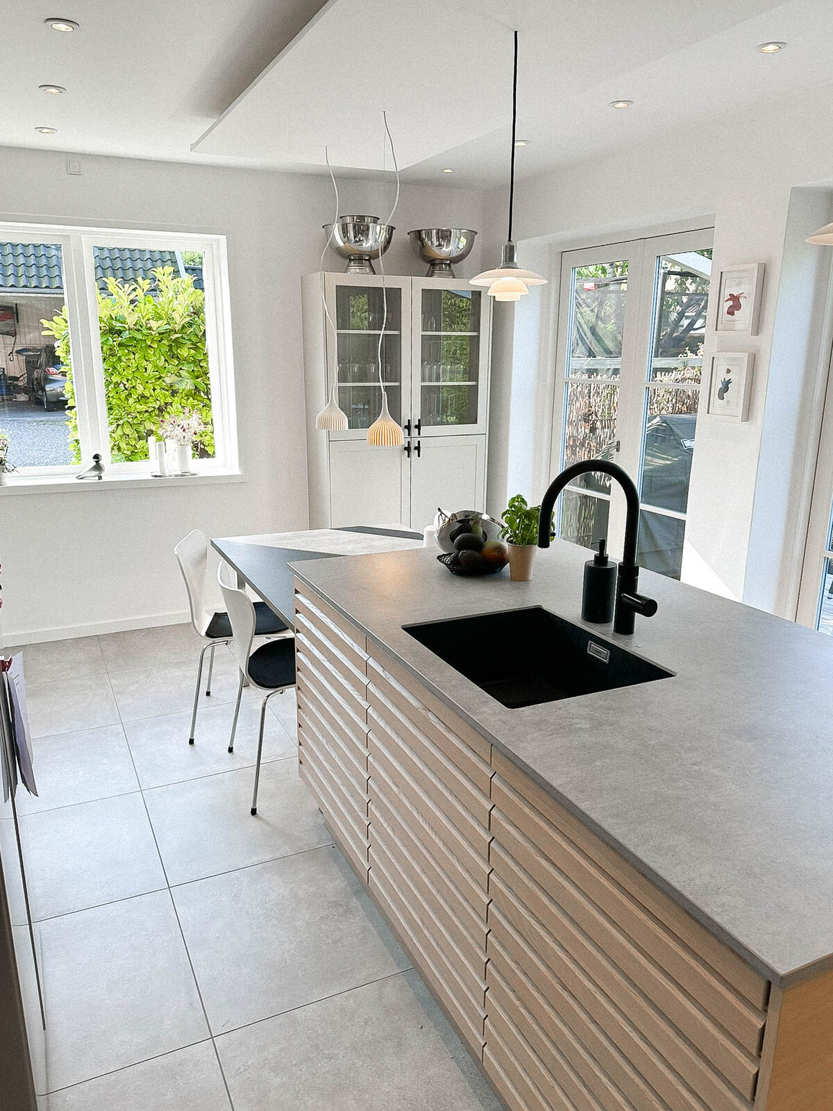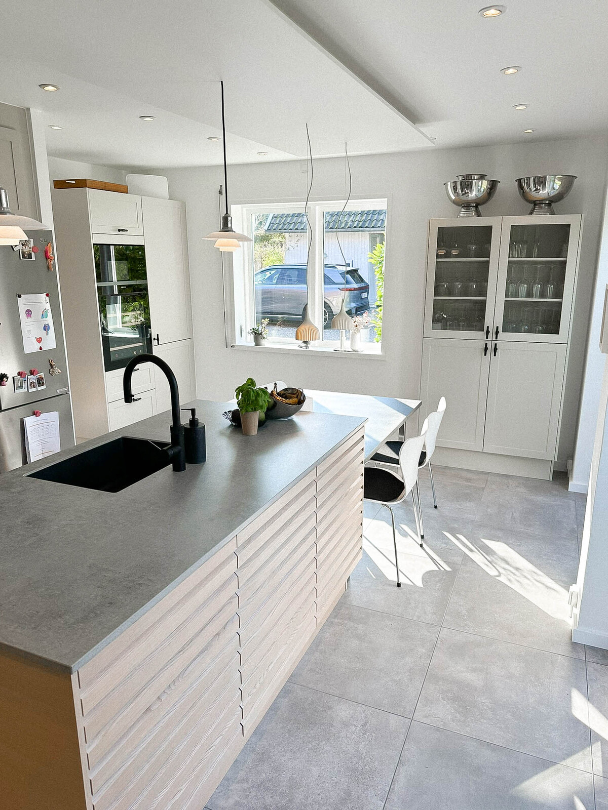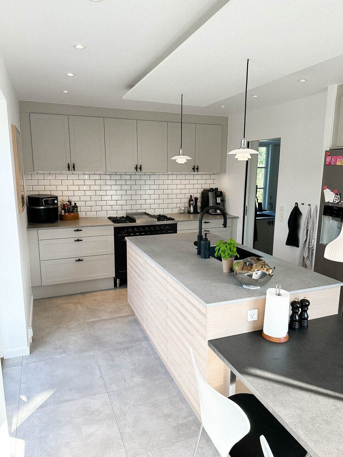 Med Ikon fronter på øen, Square Sand på resten og Dekton bordplader i køkken og bryggers har vi skabt et moderne og funktionelt rum. Nyt vitrineskab, vinkøler og et speciallavet spisebord giver ekstra detaljer, mens grå fliser og fodpaneler fuldender opgraderingen.