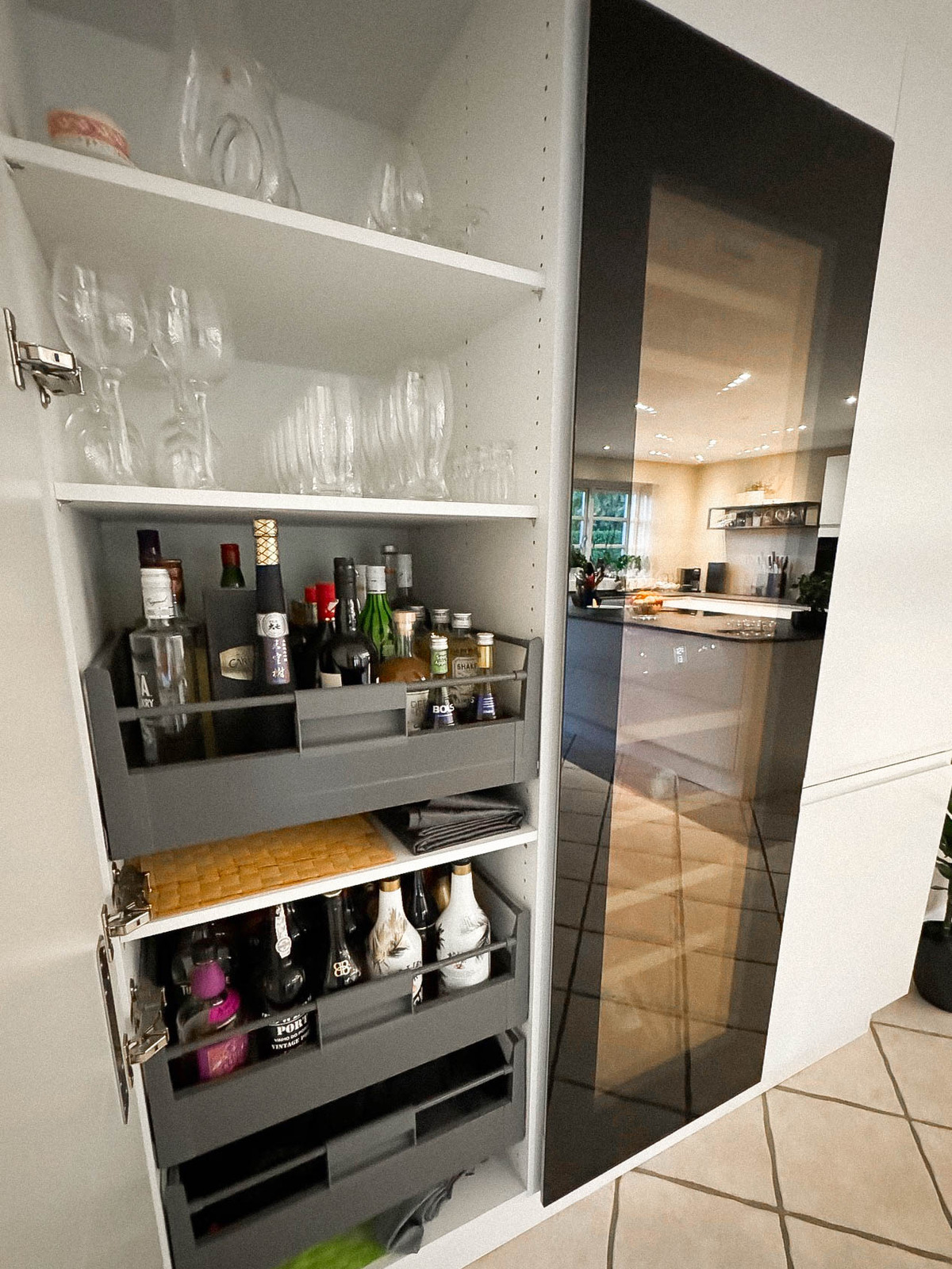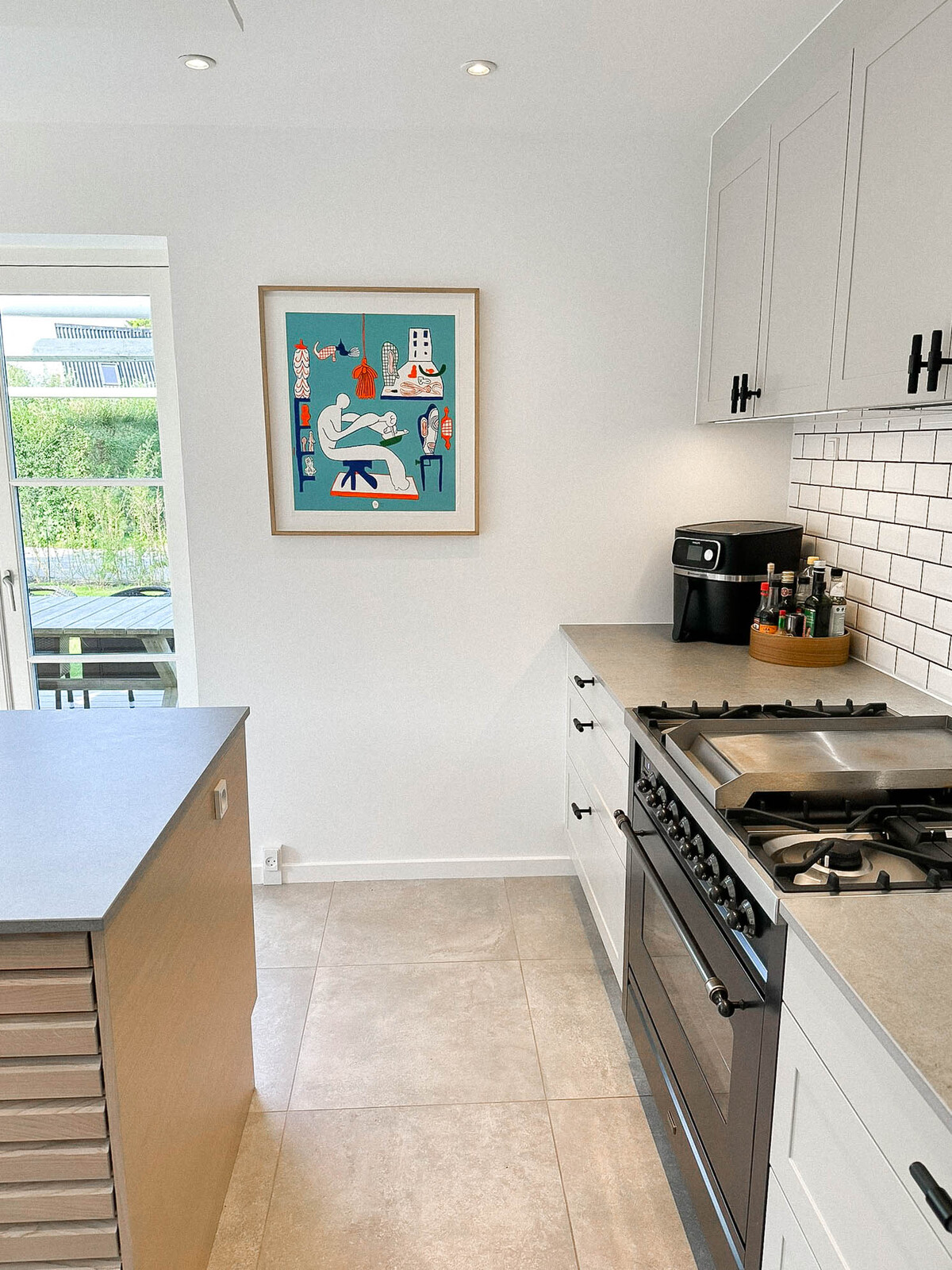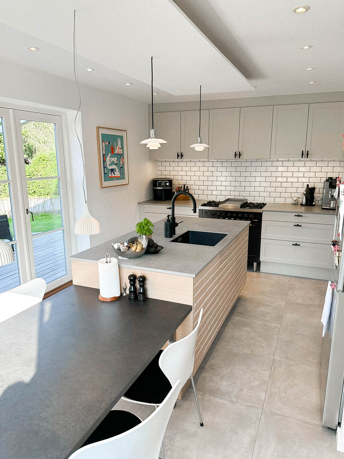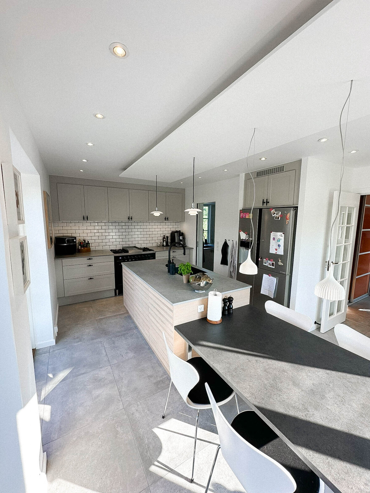 Med Ikon fronter på øen, Square Sand på resten og Dekton bordplader i køkken og bryggers har vi skabt et moderne og funktionelt rum. Nyt vitrineskab, vinkøler og et speciallavet spisebord giver ekstra detaljer, mens grå fliser og fodpaneler fuldender opgraderingen.