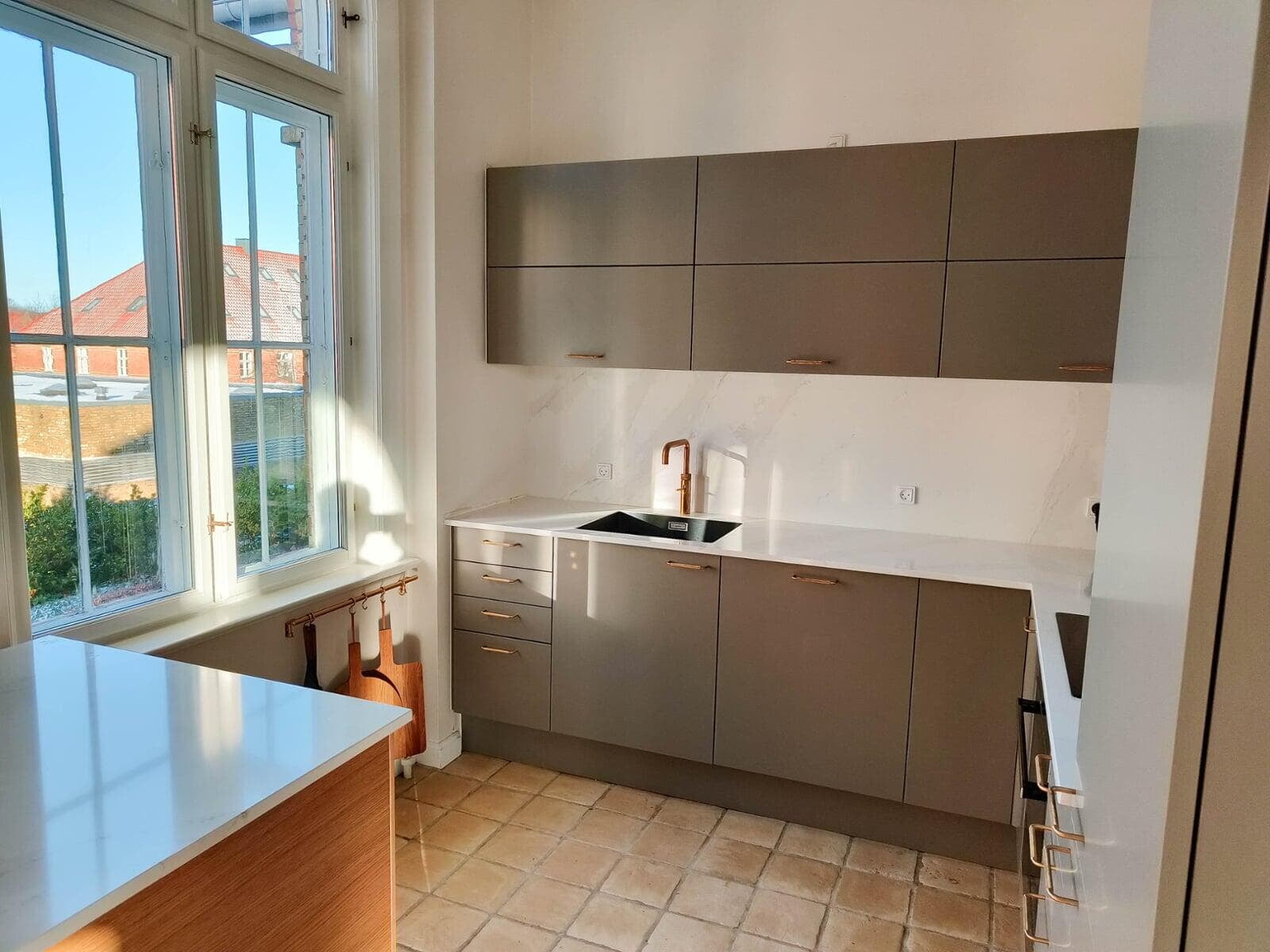 Køkkenet har fået flotte detaljer i messing, og er blevet indrettet med både bænk og lektieplads, så hele familien kan være samlet. Der er masser af gode skuffer, og der blev plads til to ovne ved siden af det indbyggede køleskab. Dejligt familiekøkken. Kamilla og Kristian, Allerød