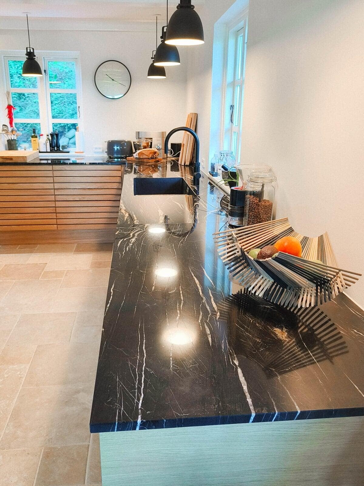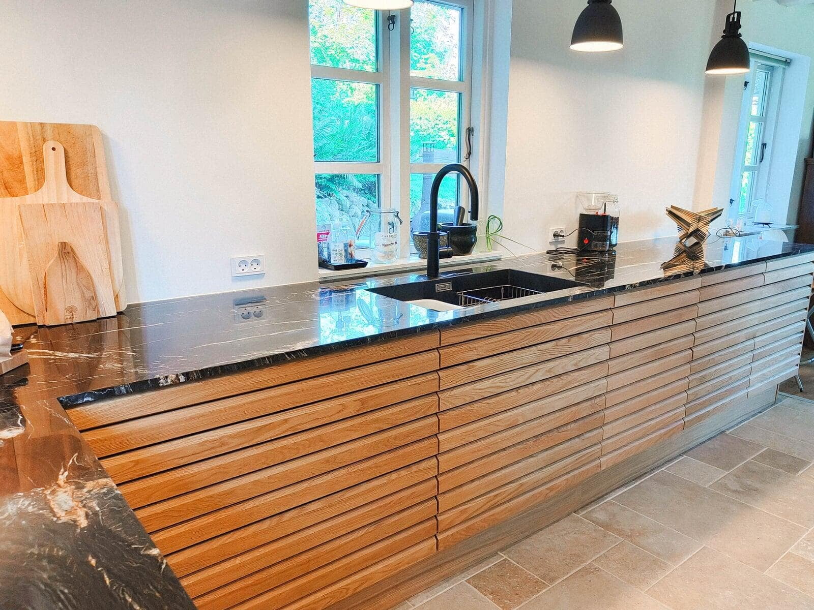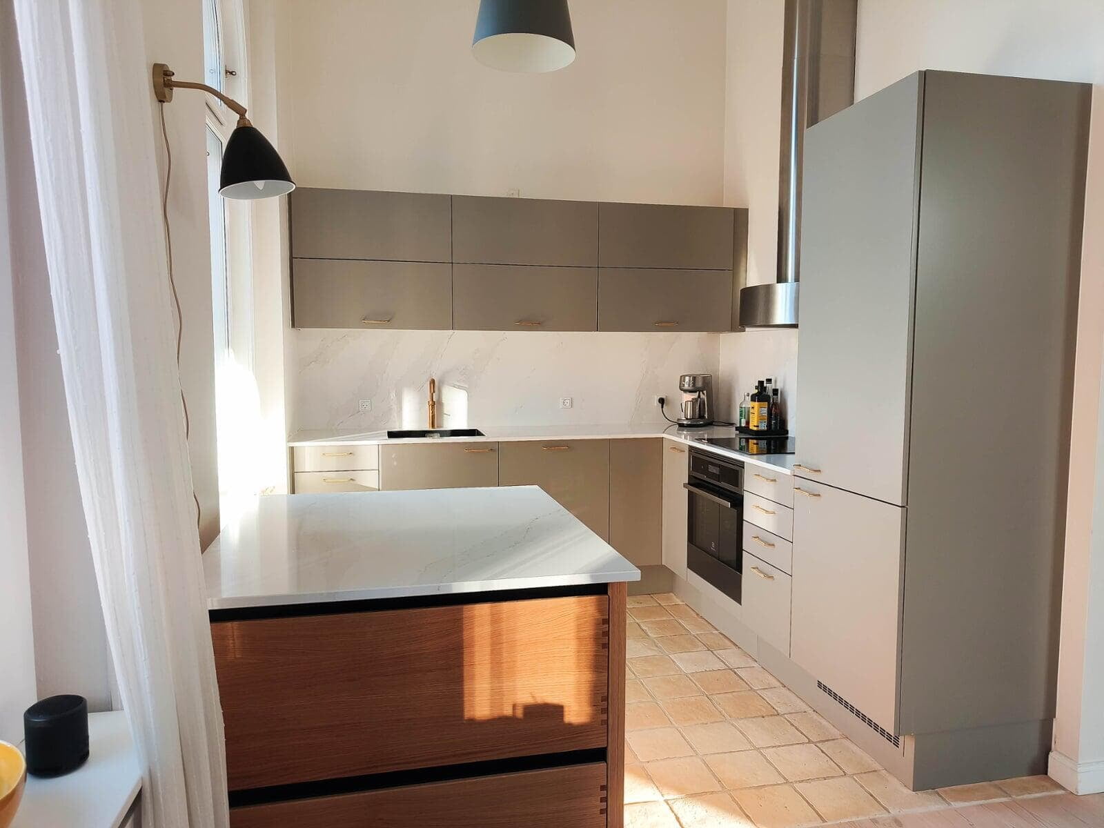 Vi har skabt et nyt og åbent hjem efter totalrenovering. Køkkenøen, med bordplade af granit, spiller flot sammen med flisevæggen. Et vinskab, med god plads, er for os prikken over i’et. Konceptet i køkkenet forsætter ud i badene og skaber god harmoni. Vi er meget glade. Familien fra Frederiksberg.