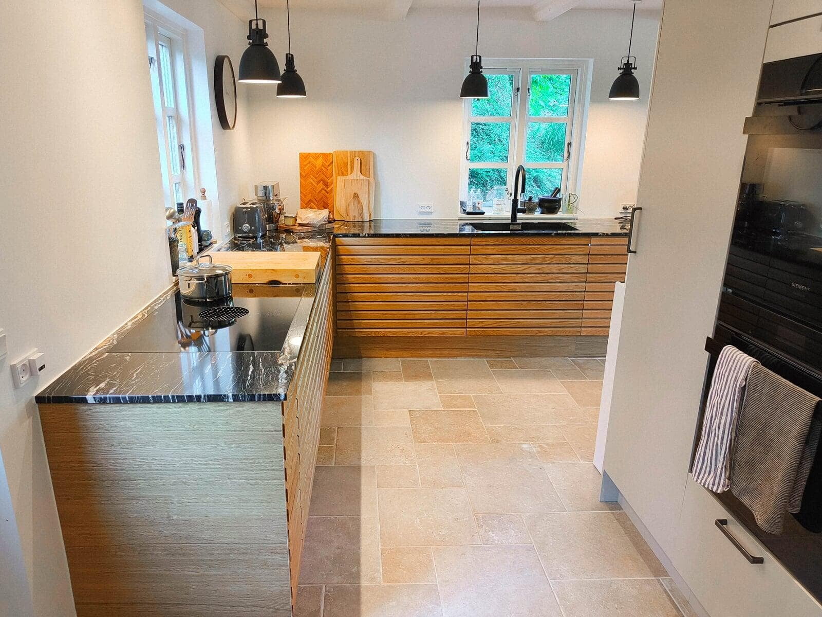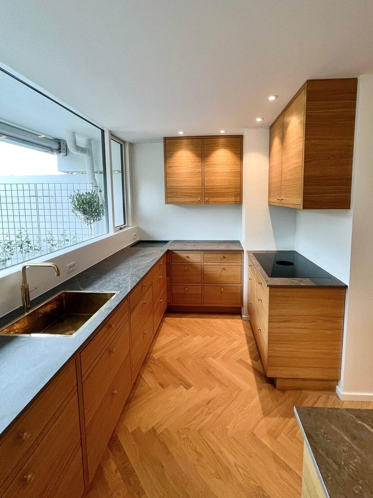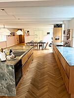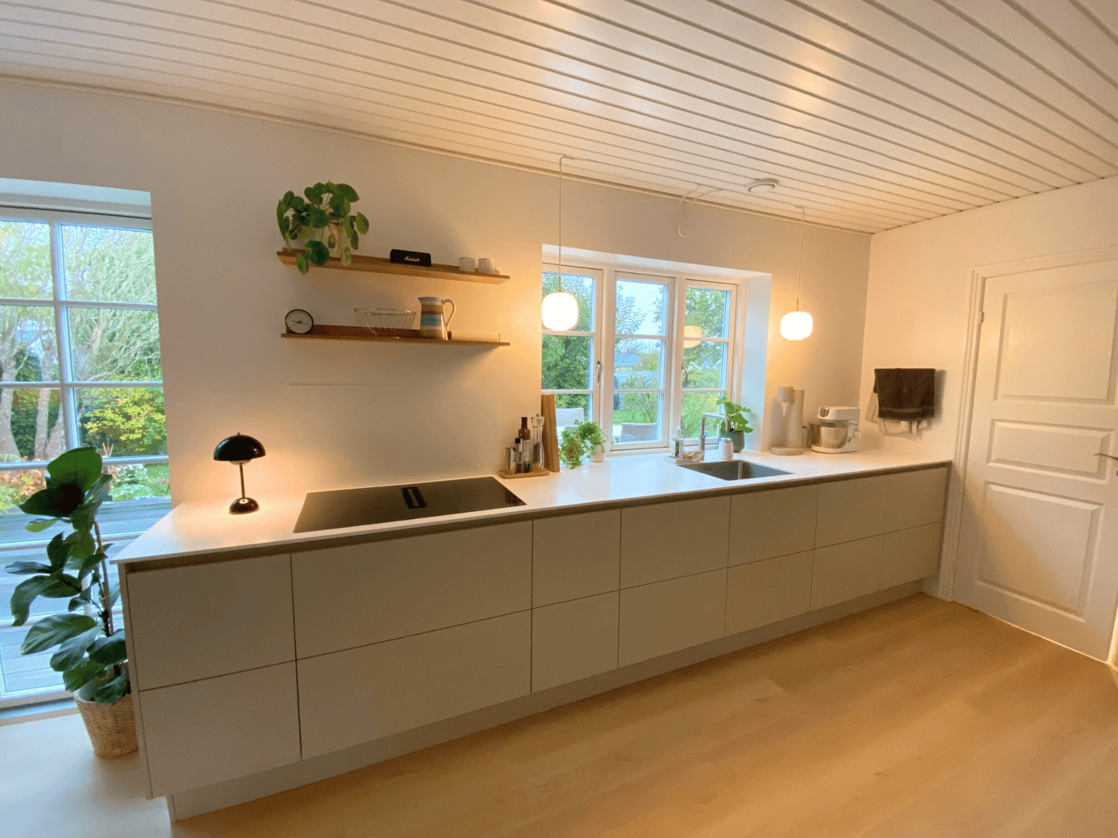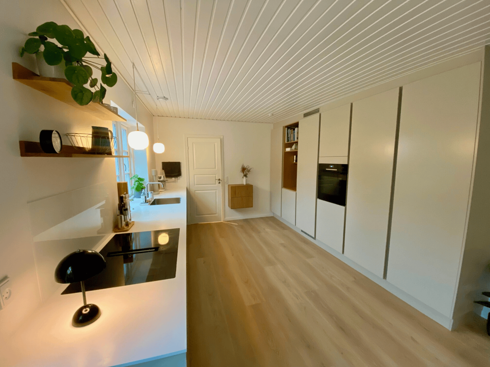 Køkkenet er flyttet til modsatte ende af rummet og danner nu en smuk, åben forbindelse til stuen. Her finder man blandt andet en håndvask foran vinduet – for både funktionalitet og udsigt i hverdagen – samt en dobbelt Bora Classic kogeplade med to integrerede emhætter for maksimal komfort og æstetik. Facaden er åbnet op med et nyt, større vindue, og både loft og gulv er udskiftet. Der er etableret gulvvarme i hele rummet for øget komfort. Vi har koordineret alle faggrupper i sagen: snedker, maler, murer, VVS, elektriker, rengøring, kloakmand og fugefolk – alt sammen håndteret gennem os. Flytning af brændeovn til ny placering? Det var selvfølgelig også en del af pakken.