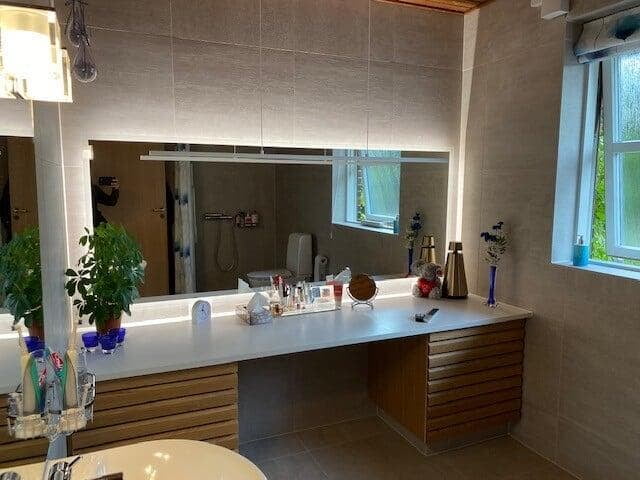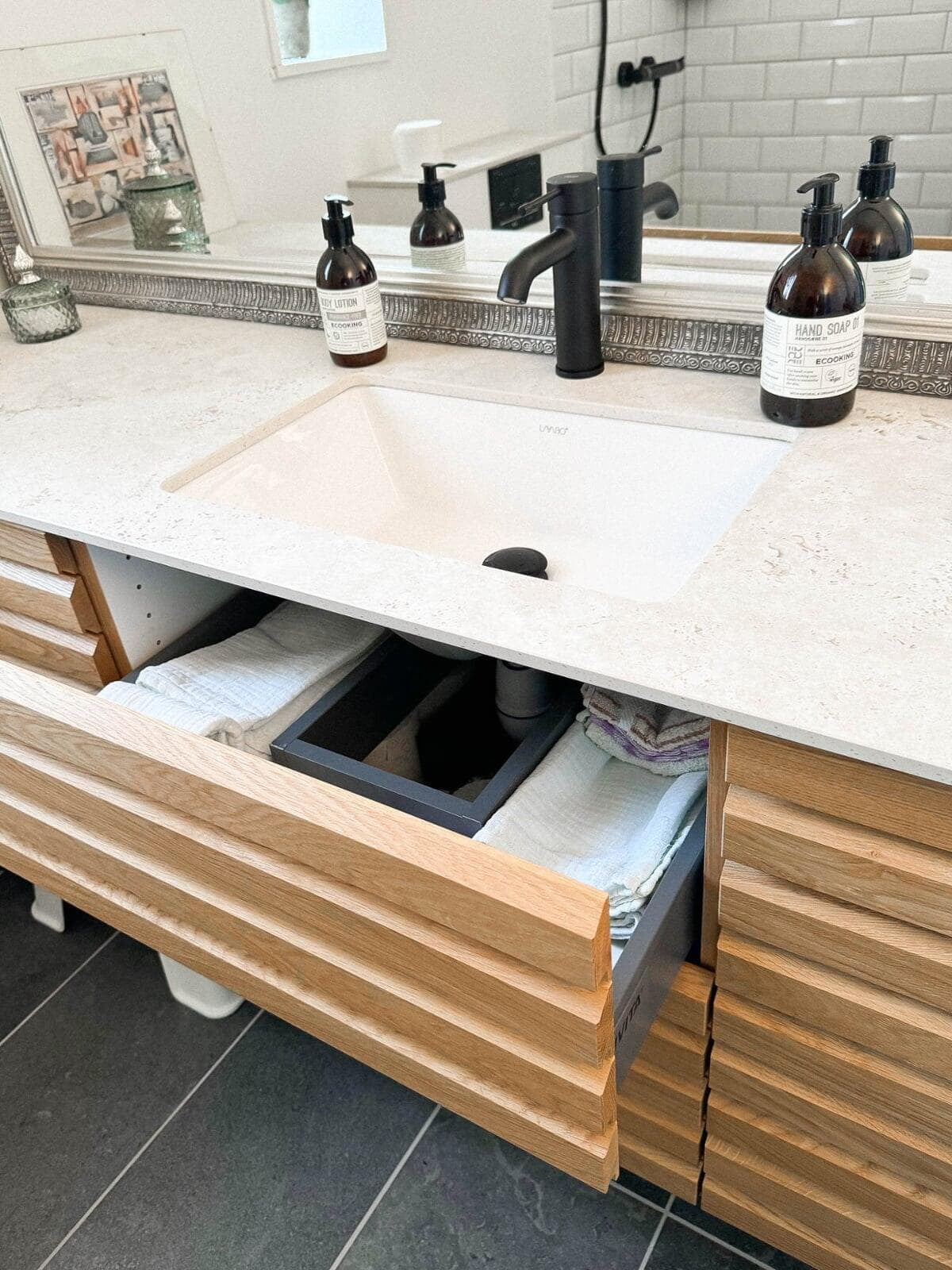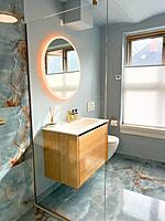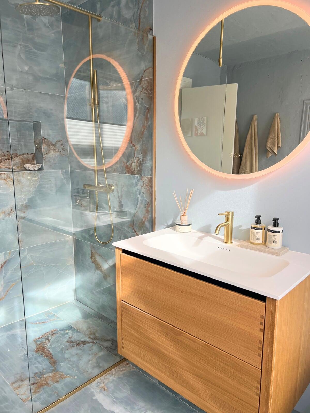 Badmiljøet er lavet med vores smukke Everline Finer front i Natur Eg. Bordpladen fra Marmorline - i den elegante Salt White farve - komplimenterer træets varme toner perfekt, hvilket skaber en indbydende atmosfære. Et LED-spejl tilføjer et moderne og luksuriøst touch til rummet.