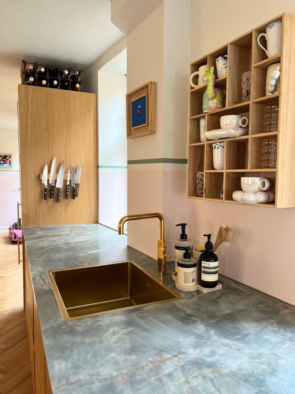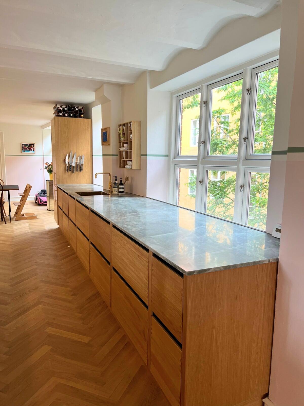 Drømmen var mere opbevaringsplads i det lille køkken. Med en køkkenø midt i rummet blev der både mere skuffeplads og mere bordplads. De lækre detaljer som fx det flotte stænkpanel i samme sten som bordpladen, tappede skuffer i massivtræ og greb i messing er udvalgt med god vejledning fra konsulenten.