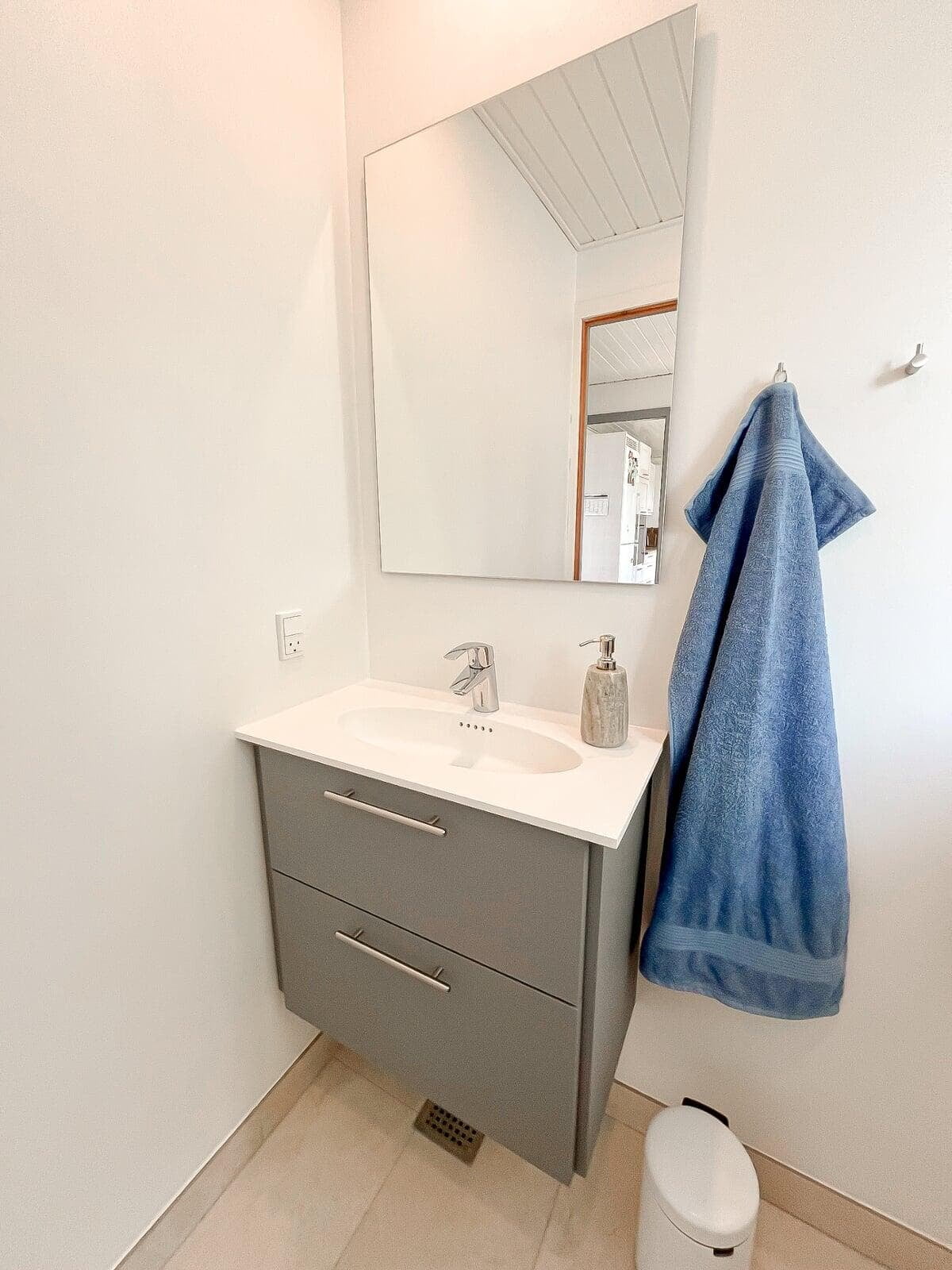 Parret fra Snekkersten ønskede at forny deres badeværelse og valgte igen Invita Hillerød efter tidligere at have købt et køkken hos os. De valgte lyse Cover laminatfronter i Frost og en elegant Marmorline-bordplade i solid surface, Arctic White, hvilket skabte et lyst og tidsløst badeværelse.
