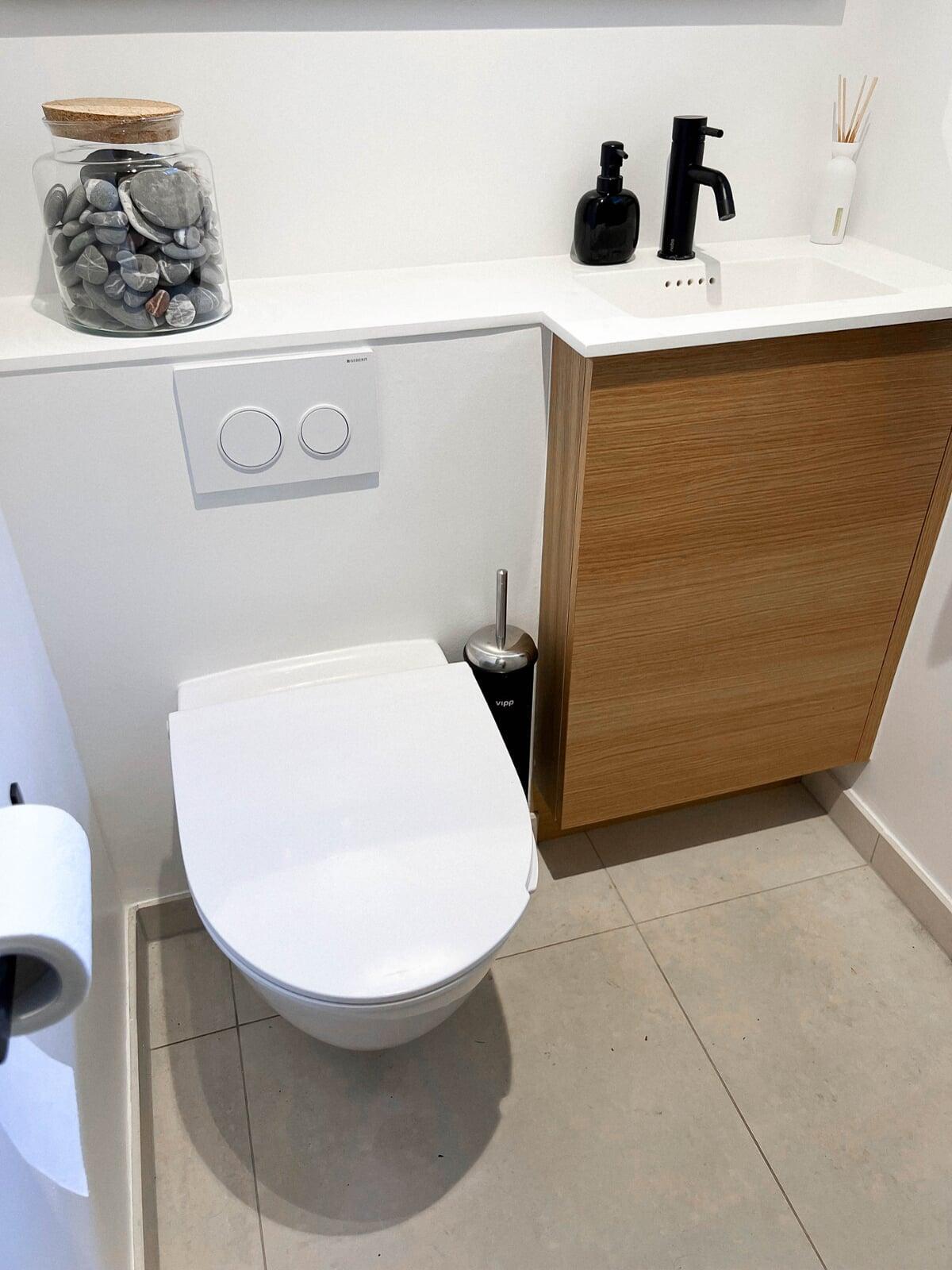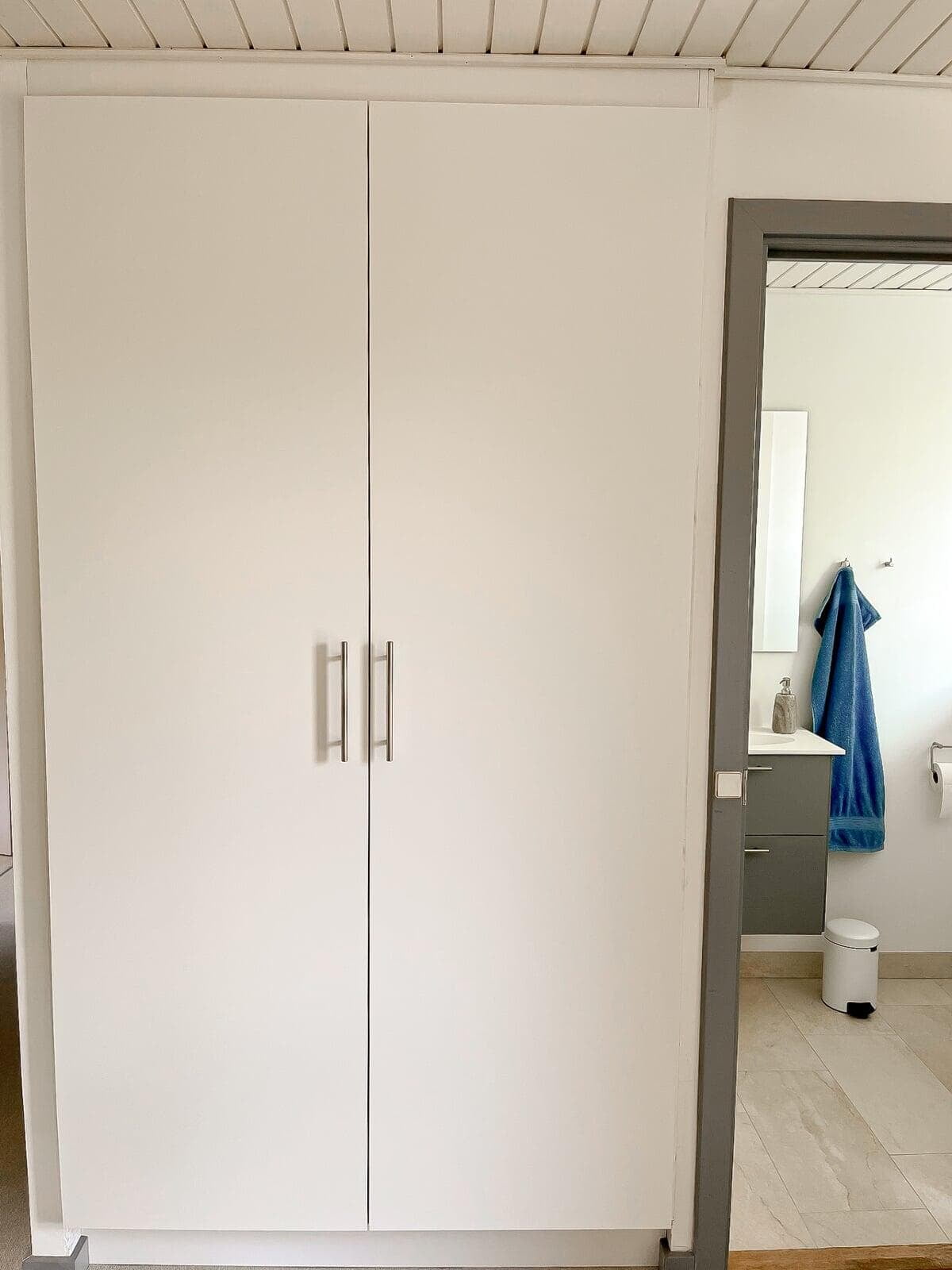 Parret fra Frederikssund har skabt deres drømmebadeværelser med Invitas elegante laminatfront, Torden. En uventet vandskade blev til en mulighed for at opgradere med et stilfuldt garderobeskab i Frost-front. Grebene i Beam stål fra Invita sætter prikken over i'et i deres moderne hjem.