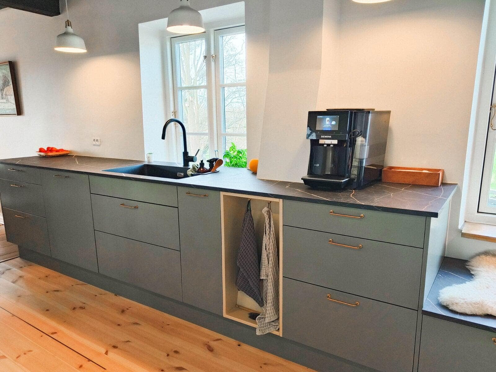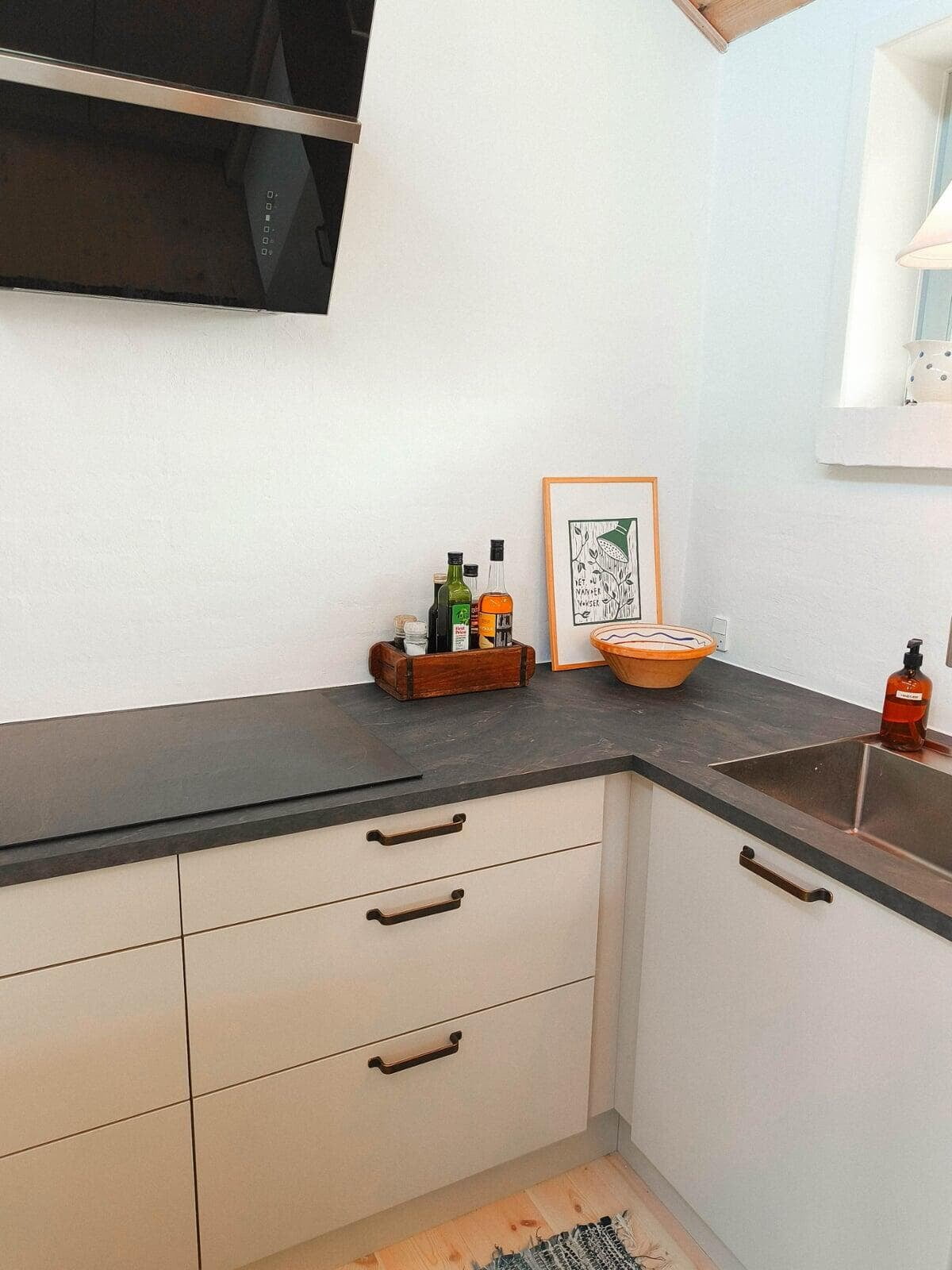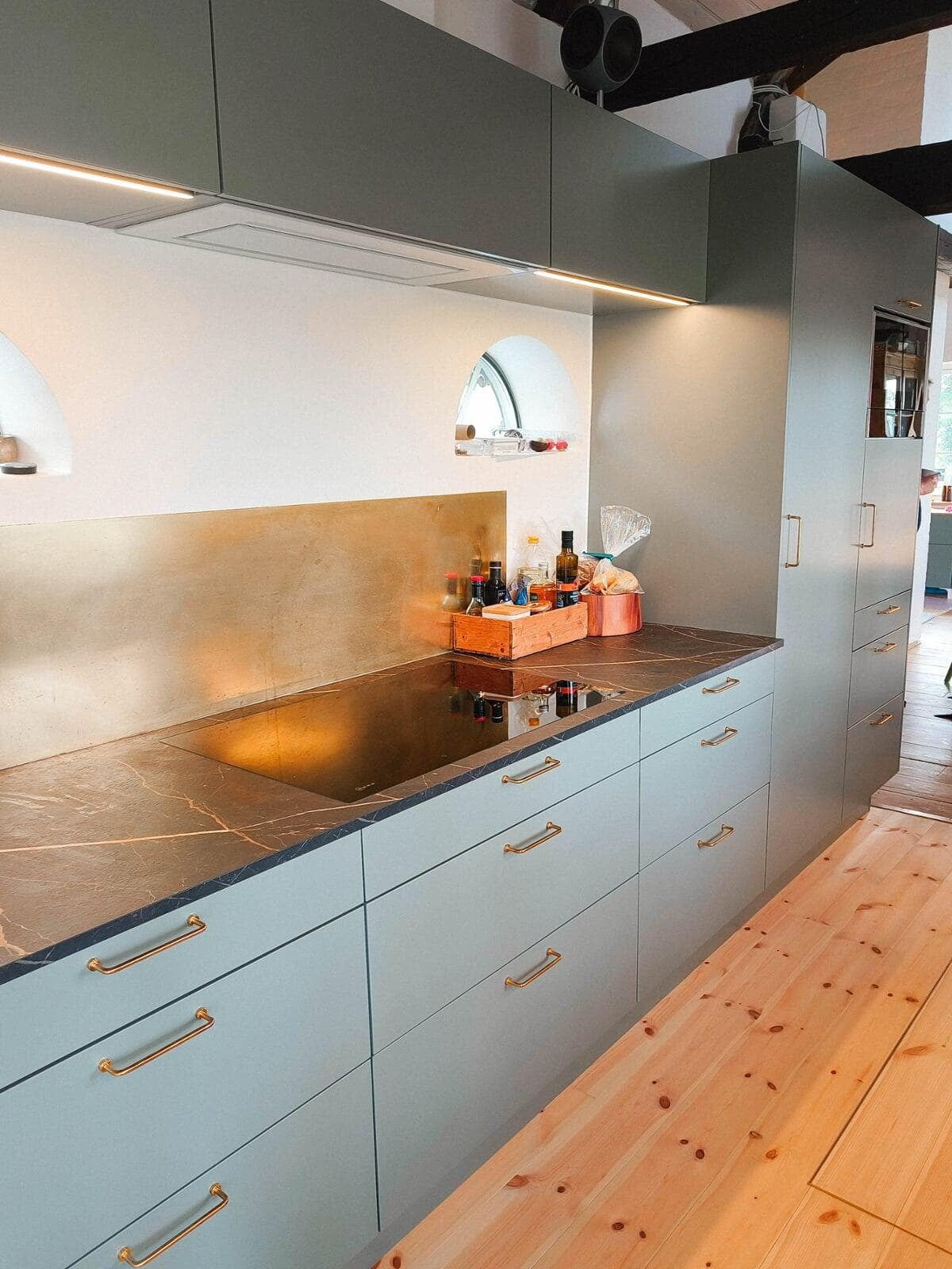 Skæve vægge, synlige bjælker & stolper er ikke ualmindelige i ældre huse, så der måtte findes et køkken, der passede til stilen. Valget blev et salviegrønt Athena køkken med messinggreb & mørk bordplade, som spiller smukt sammen med den grønne farve. Emhætten er på elegant vis skjult i overskabet.