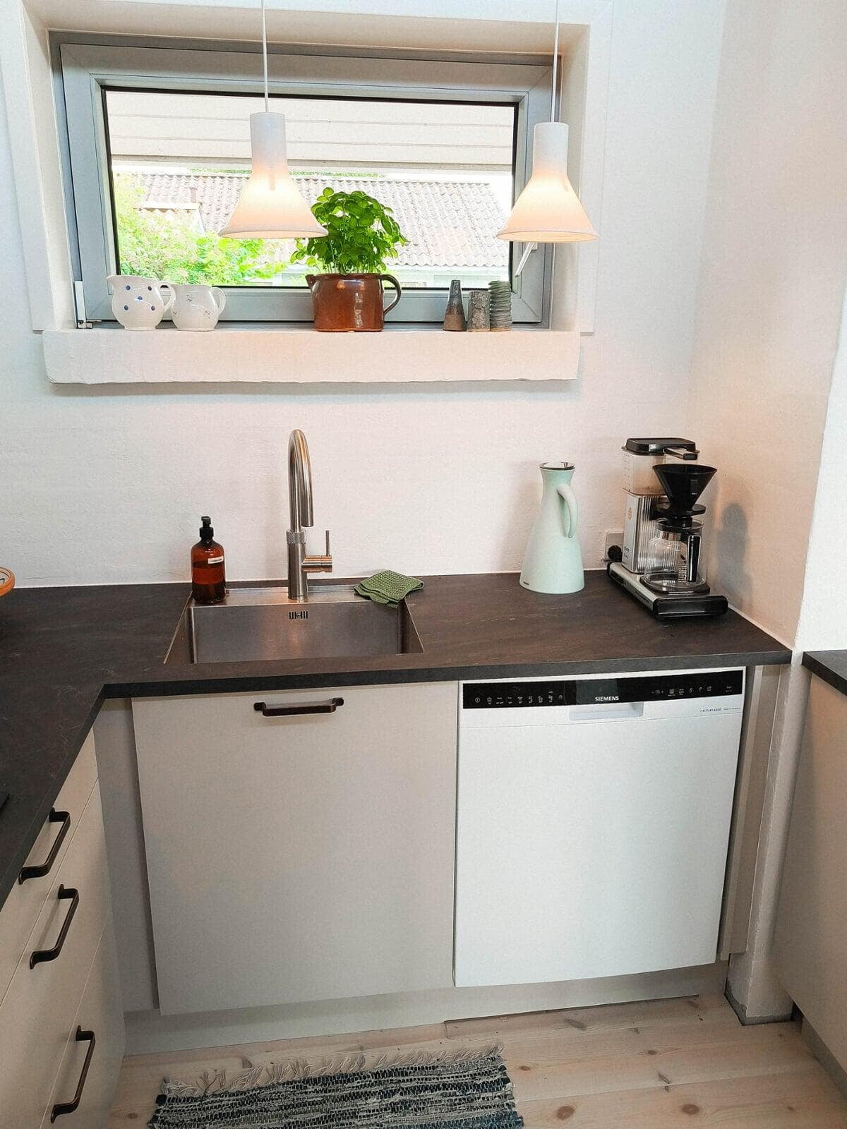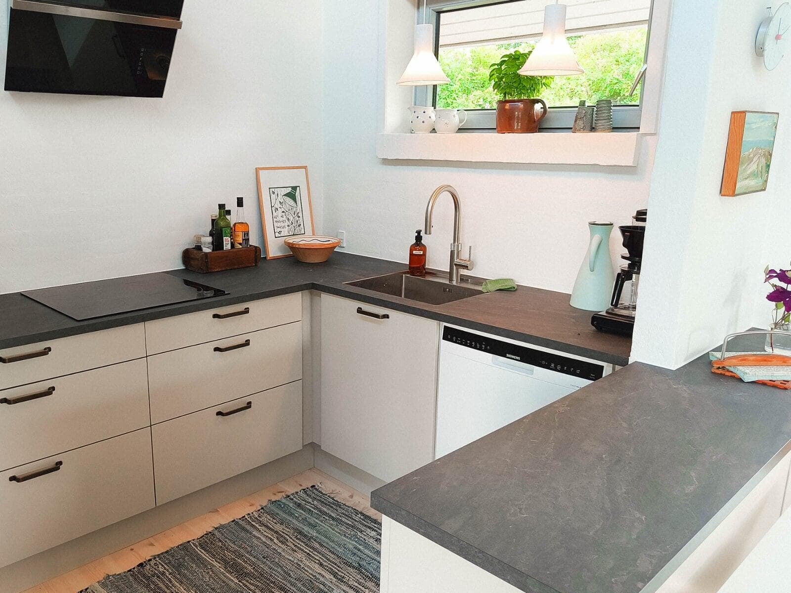 Når man altid har vasket op i hånden, skal opvaskemaskinen jo ikke skjules bag en låge, men synet skal kunne nydes. Det er virkelig dejligt. I det hele taget nyder vi vores nye køkken, som også har fået nyt gulv og er blevet malet. Tak for hjælpen med at koordinere alle håndværkerne. Karen og Finn.