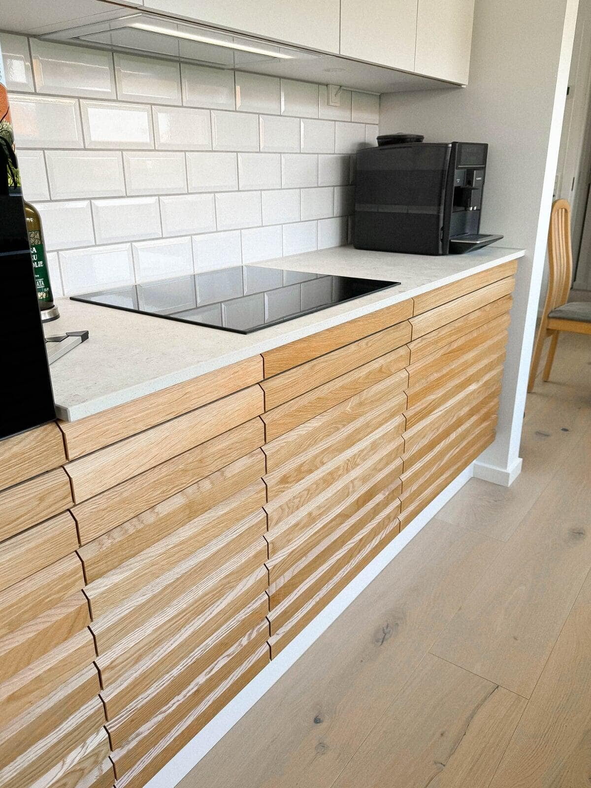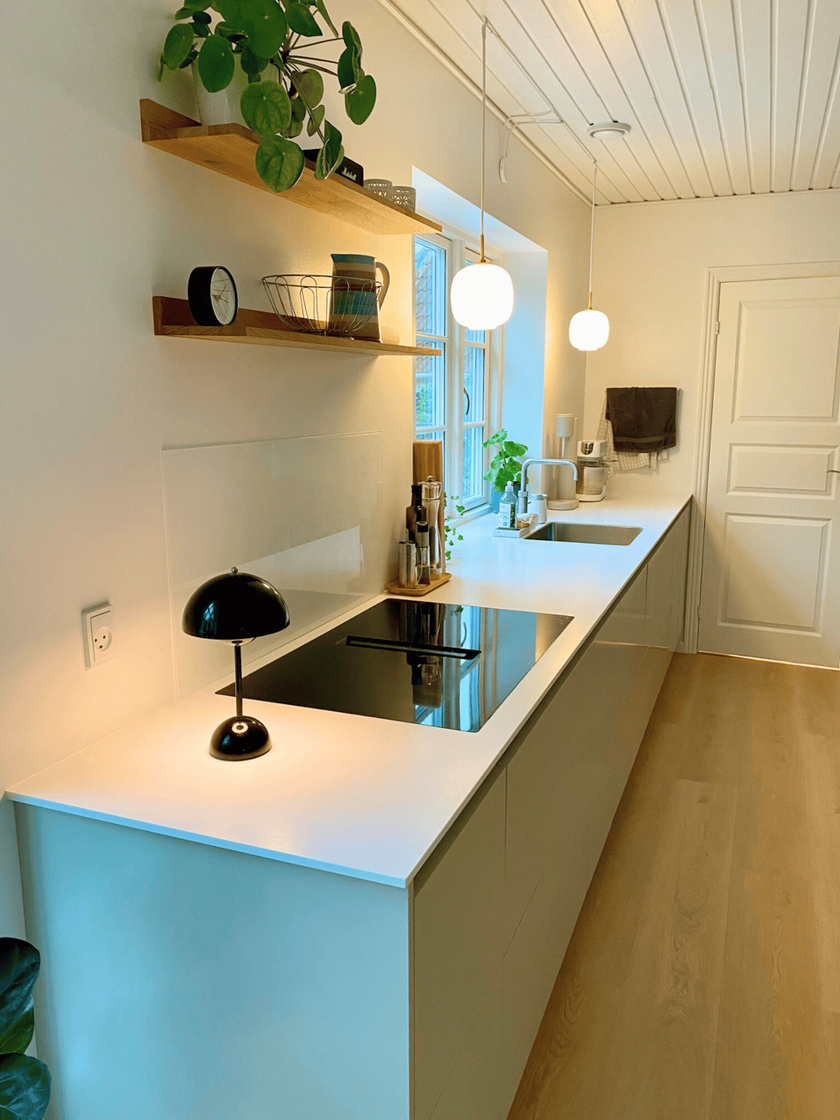 Pladsen er udnyttet på bedste vis i det lille køkken med Glød i massivt egetræ i elegant samspil med de italienske Blanco Brillo fliser. Den keramiske bordplade har fået indbygget kogeplade og integreret vask, som fuldender stilen. Tak for god sparring og for koordinering. Connie og Jens, Hvidovre