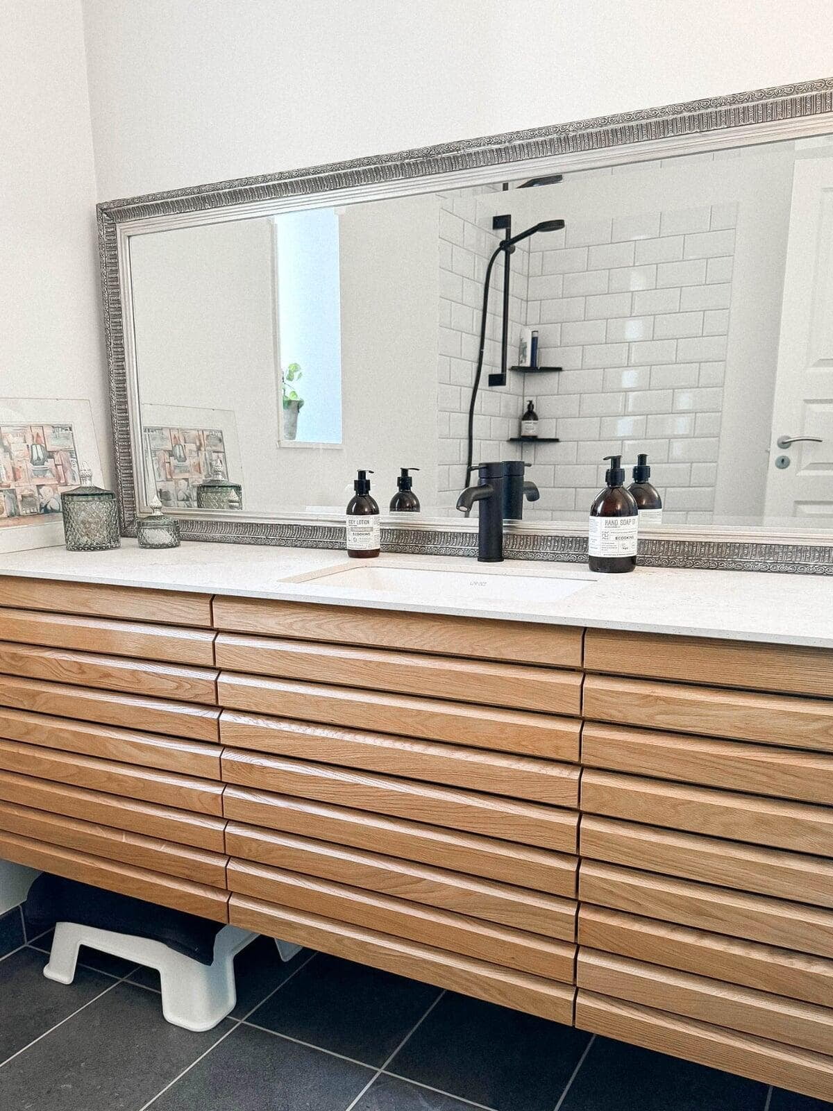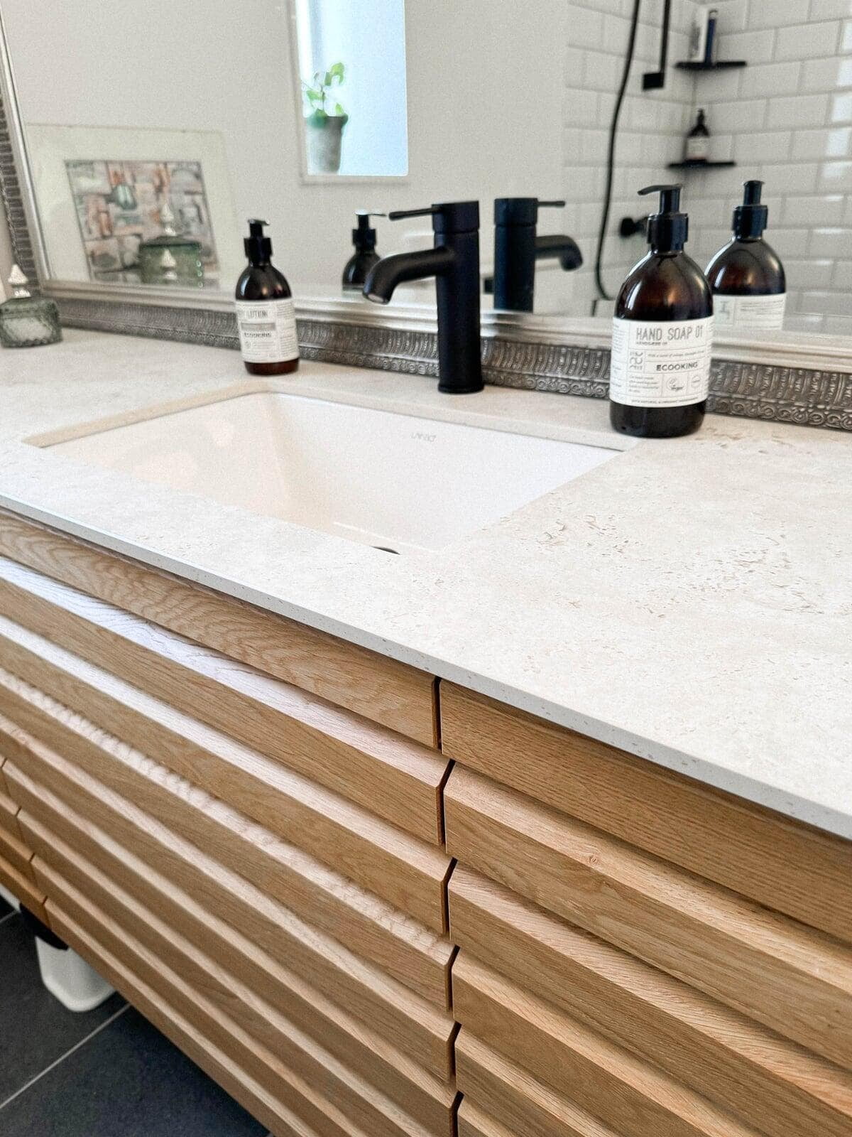 Parret fra Humlebæk ønskede træ i deres nye badeværelse. De valgte en smuk, massiv egetræsbordplade kombineret med vores cover laminatfront i farven frost. Resultatet er et elegant og tidløst design, der forener naturlige materialer med moderne æstetik.