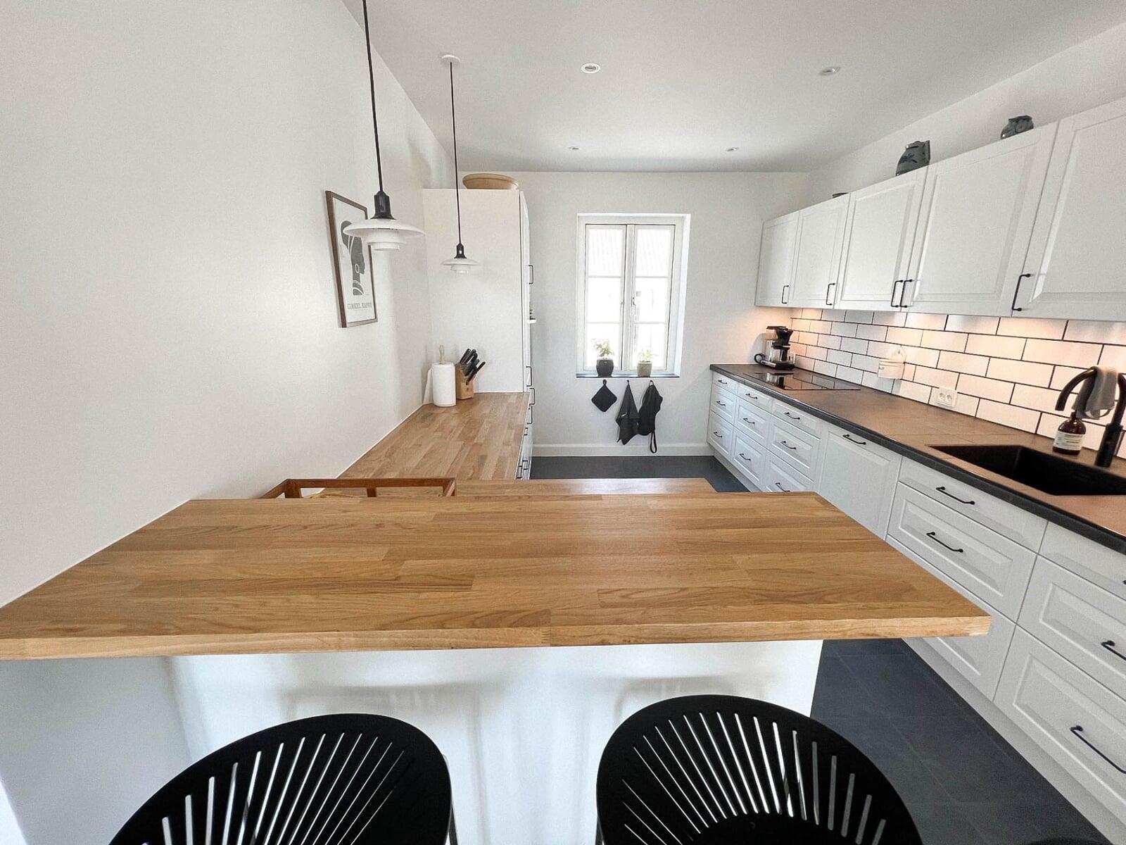 Thomas og Lenes Nordic Landkøkken i hvid model giver en tidløs charme. Den massive egetræs bordplade tilfører varme og naturlig elegance. Den enkle, klassiske stil skaber et indbydende køkken, hvor funktion og æstetik går op i en højere enhed.