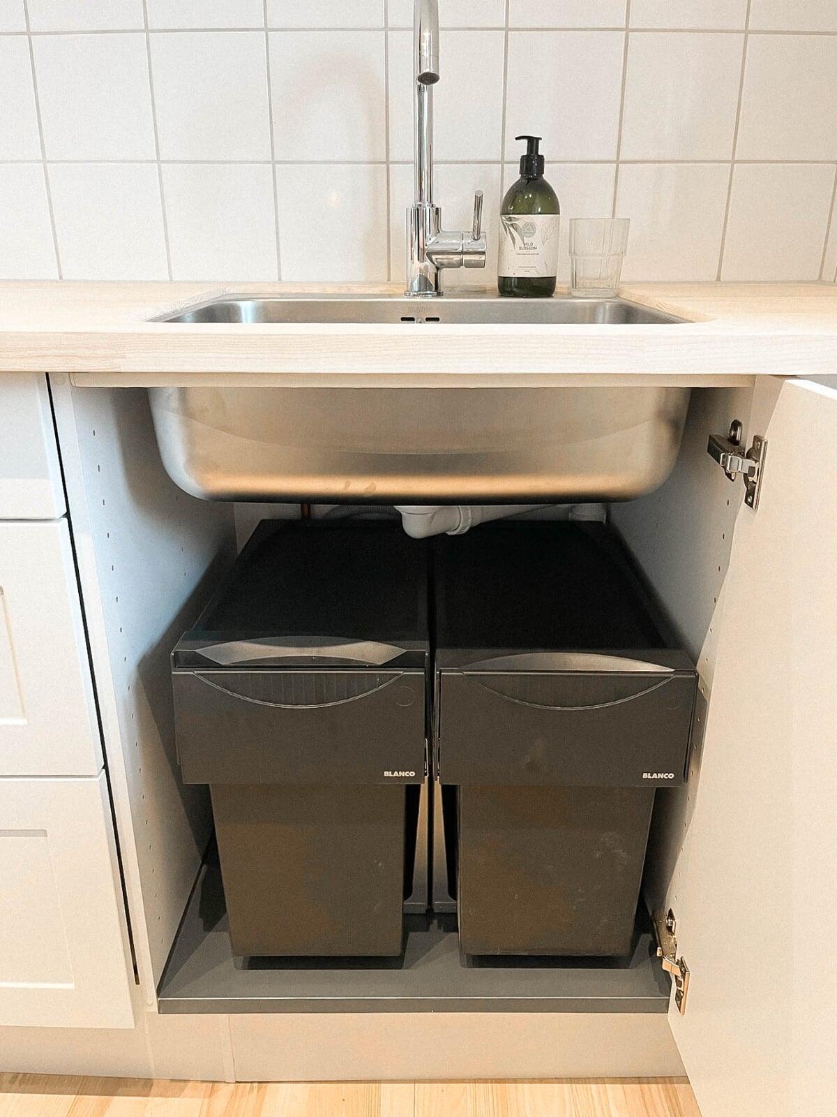 Stilen i det nye køkken passer perfekt til de fine gamle gulve. Pladsen er udnyttet optimalt med indbyggede ovne og køl, så der stadig er direkte adgang til haven. God plads, praktiske skuffer og indbygget affaldssortering gør det nemt at holde køkkenet ryddeligt. Tak for god sparring, Josefine.