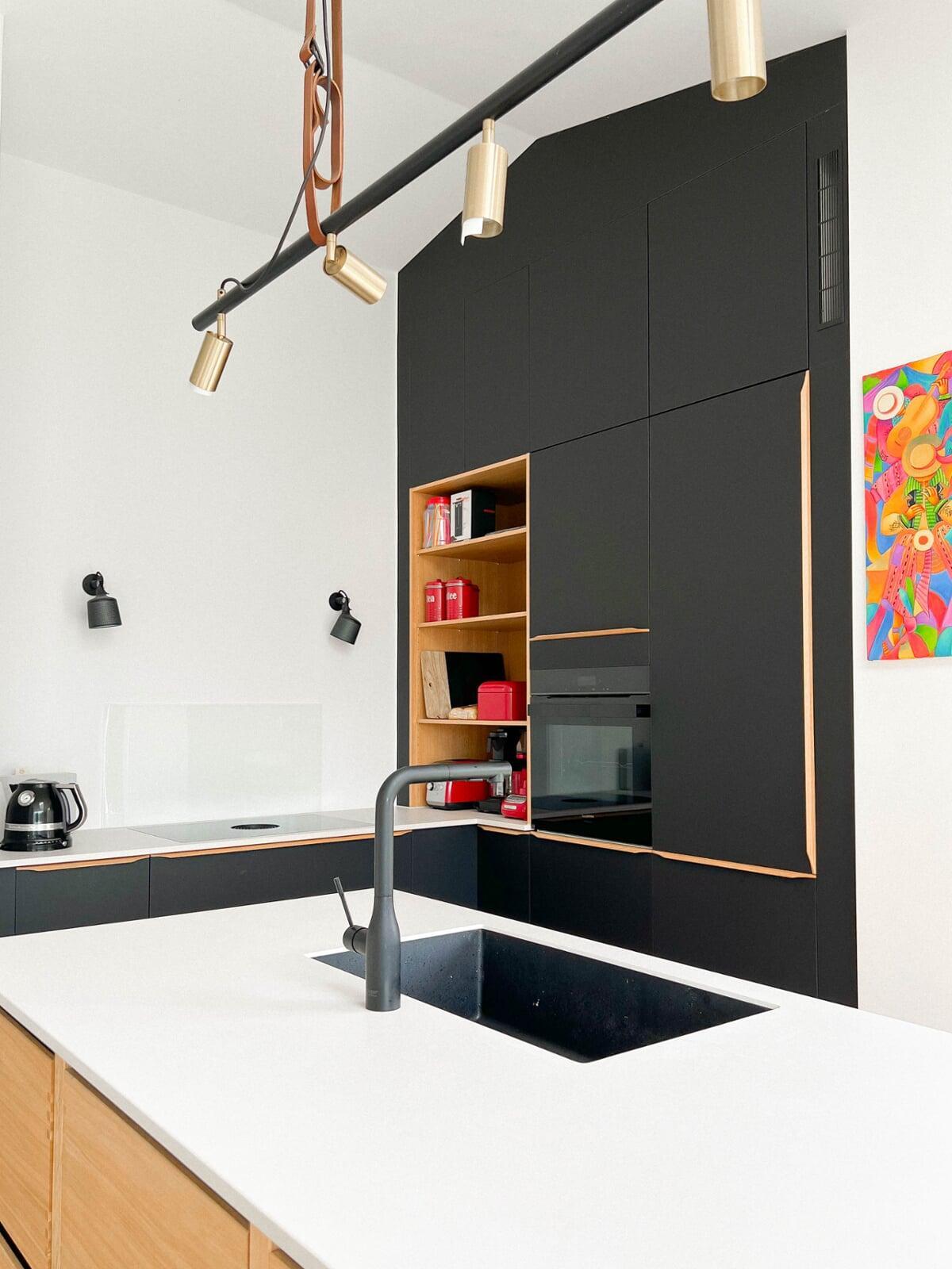 Køkkenet er nu blevet til et dejligt åbent køkken-alrum med plads til både hygge og arbejde. Vi ville gerne have en praktisk indretning, så vi har fået god plads til opbevaring med en masse skuffer. Der blev også plads til to ovne og til en barista kaffemaskine. Pia og Rasmus, Frederiksberg