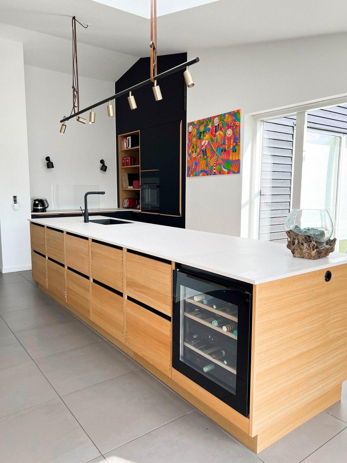 Køkkenet blev udvidet, og den tidligere væg fungerer nu som en flot detalje, der opdeler bordpladen i zoner. Armaturet er bygget ind i væggen, og kogepladen er med indbygget udsugning. Med sokkelskuffer er der skabt ekstra opbevaringsplads. Tak for et godt samarbejde. Neel og Jørgen, Strandvejen.