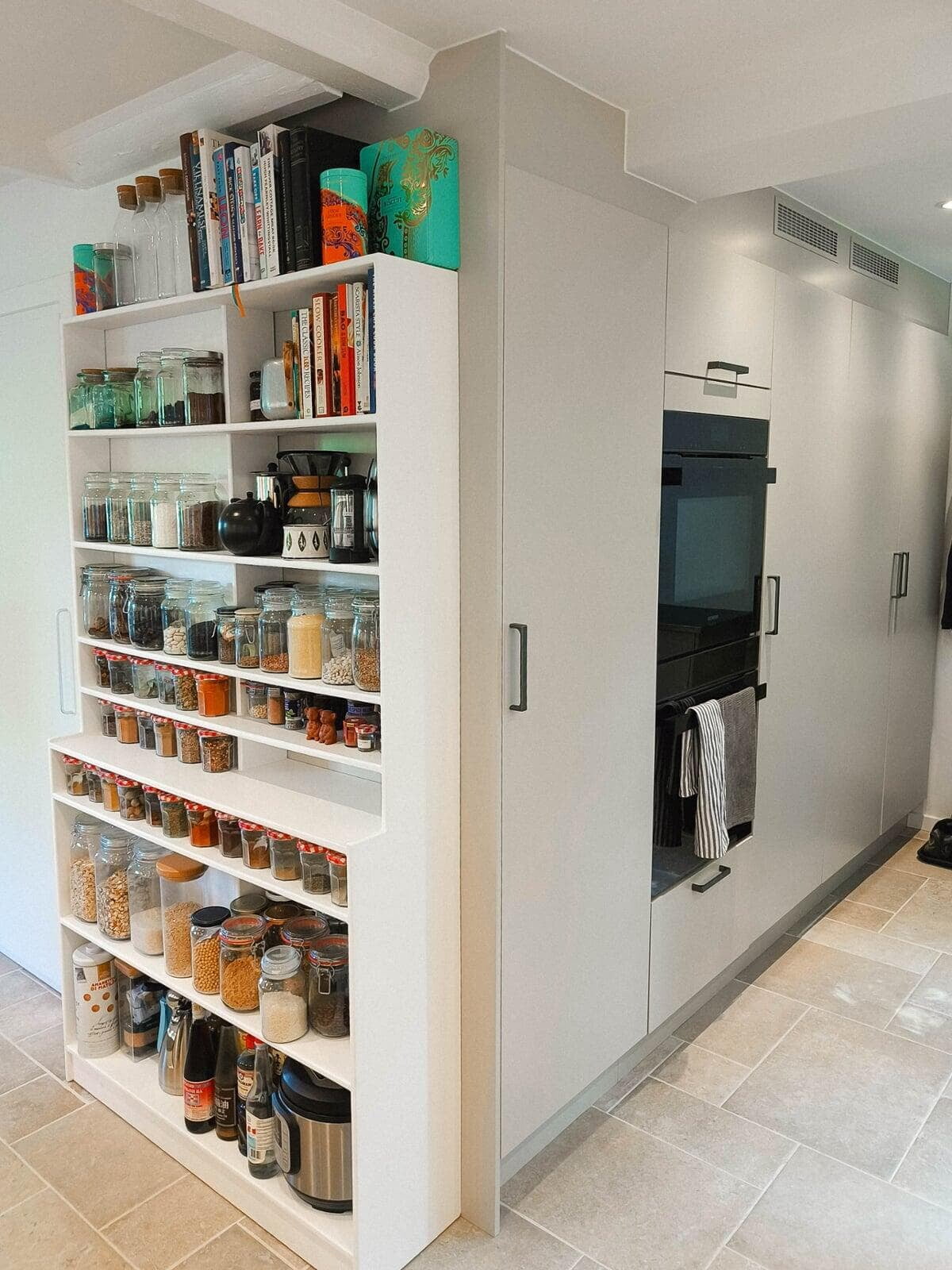 Komfuret fik en ny plads og med den indbyggede udsugning i kogepladen, skulle der blot laves et hul i muren. Den oprindelige stil er bevaret i den 'hvide del' af køkkenet med hvid stenbordplade, og den 'blå del' er både praktisk og moderne med grebsløse skuffer/skabe, der passer godt til stilen.